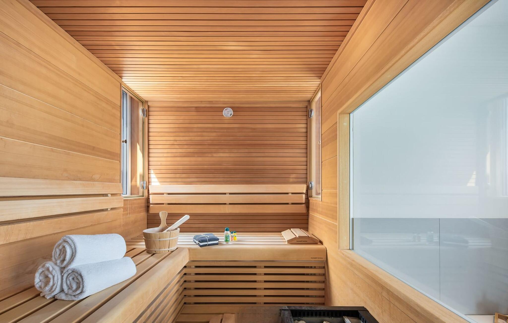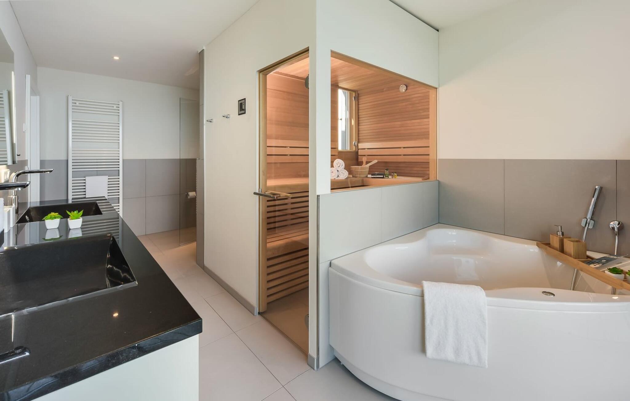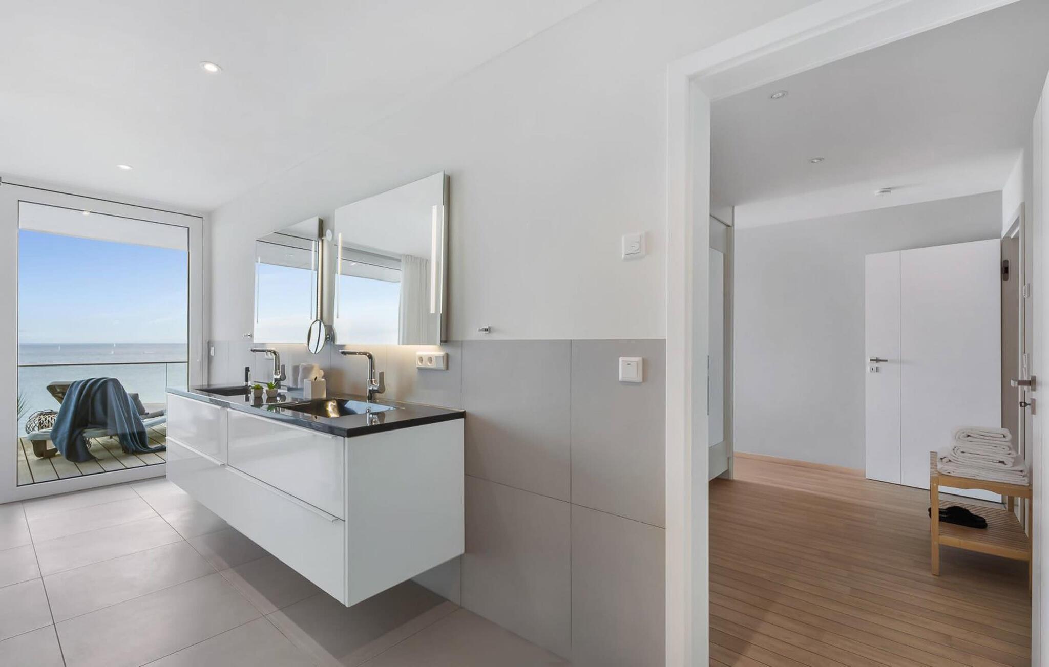 Ebenfalls gen Ostsee liegt das Badezimmer mit Wellnessfaktor. Aus der Eckbadewanne fällt der Blick auf die unendliche Weite des Meeres und vorbeifahrende Segelschiffe. Die Ostsee und der Leuchtturm von Schleimünde lassen sich aus der finnischen Sauna bestaunen, während die bodengleiche große Dusche und ein Doppelwaschbecken für Urlaubsfeeling sorgen.