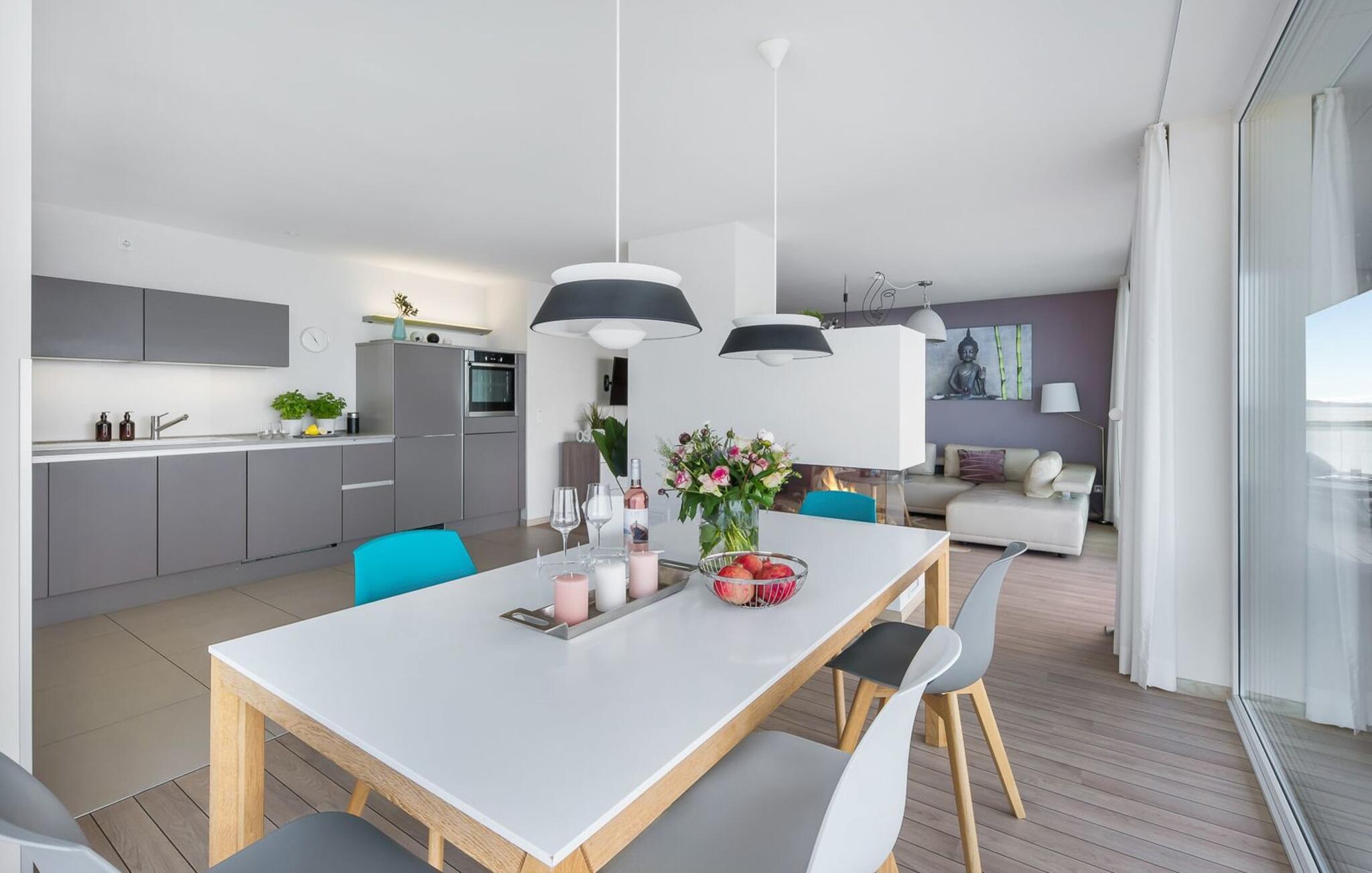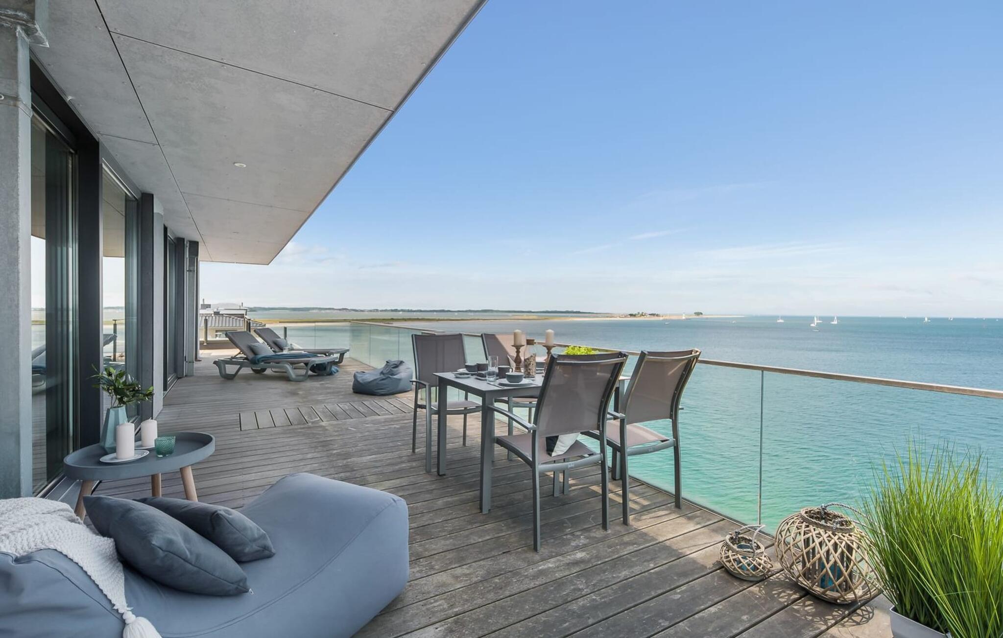 Über 136 m² erstreckt sich der Innenbereich des Penthouses, welches für bis zu sechs Personen geeignet und bequem mit dem Aufzug zu erreichen ist. Die Ferienwohnung befindet sich auf einer Ebene. Umlaufend um die gesamte Wohnung erstreckt sich die riesige Dachterrasse, welche einen freien Ostsee- und Schleiblick zur einen, sowie einen Blick über die Marina des Ostseeresorts zur anderen Seite ermöglicht. Der direkte Zugang zur Terrasse ist von jedem Zimmer aus gegeben. Ob Morgen-, Mittags- oder Abendsonne, die 360 Grad Terrasse fängt jeden Sonnenstrahl ein.