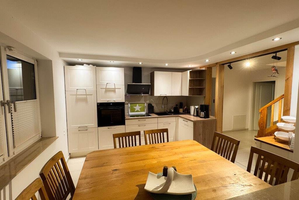 Willkommen im Ferienhaus „Kala“ in Penzlin! Dieses frisch sanierte Haus bietet drei stilvoll eingerichtete Schlafzimmer, zwei moderne Badezimmer mit Wanne und/oder Dusche sowie ein gemütliches Wohnzimmer mit Kamin und offener Küche. Die hochwertige Ausstattung umfasst eine voll ausgestattete Küche mit Geschirrspüler. Draußen lädt ein 600 m² großes Grundstück mit Wiese, Grill, Veranda und großzügiger Außenterrasse zum Verweilen ein. Eine E-Ladesäule steht für Elektrofahrzeuge bereit. Das Haus liegt in ruhiger Lage und ist dennoch gut an das öffentliche Verkehrsnetz angebunden. Einkaufsmöglichkeiten befinden sich direkt im Ort. Hier genießen Sie Erholung und Komfort inmitten der Mecklenburgischen Seenplatte!