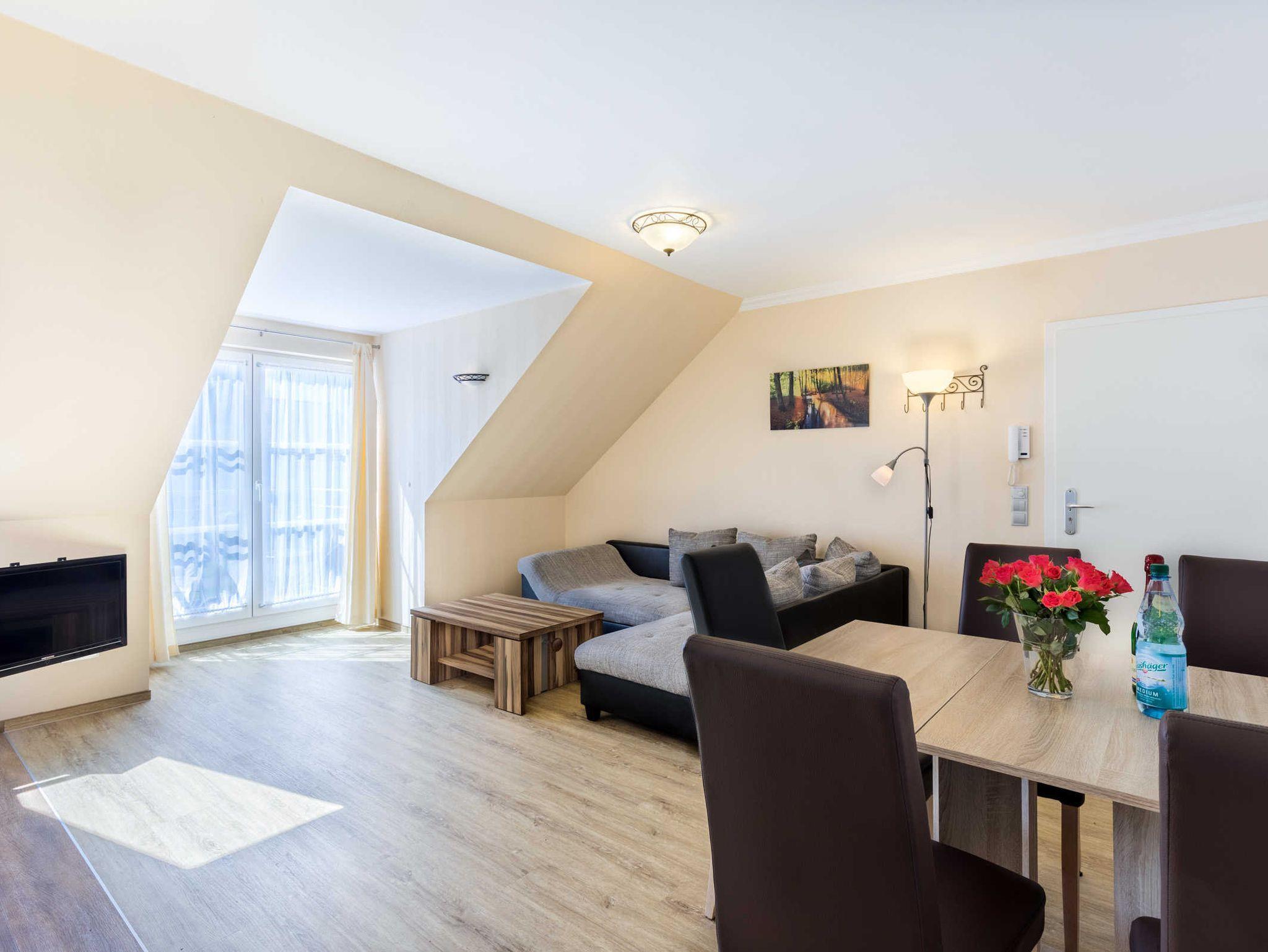 Die helle und großzügige Ferienwohnung Matthias befindet sich im Obergeschoss des Ostseeferienhauses Drachenflieger. Die Ferienwohnung verfügt über ein separtes Schlafzimmer mit Doppelbett, Einzelbett und Kleiderschrank, einen Wohn- Essbereich mit umfangreich ausgestatteter Küchenzeile (Kühlschrank mit Gefrierfach, 4- Platten- Herd, Backofen, Kaffeemaschine, Wasserkocher, Toaster) sowie einen Essbereich und Sitzecke mit ausziehbarer bequemer Schlafcouch. Vom Wohnbereich gelangen Sie auf den Balkon/Loggia. Bad mit Dusche und WC.
