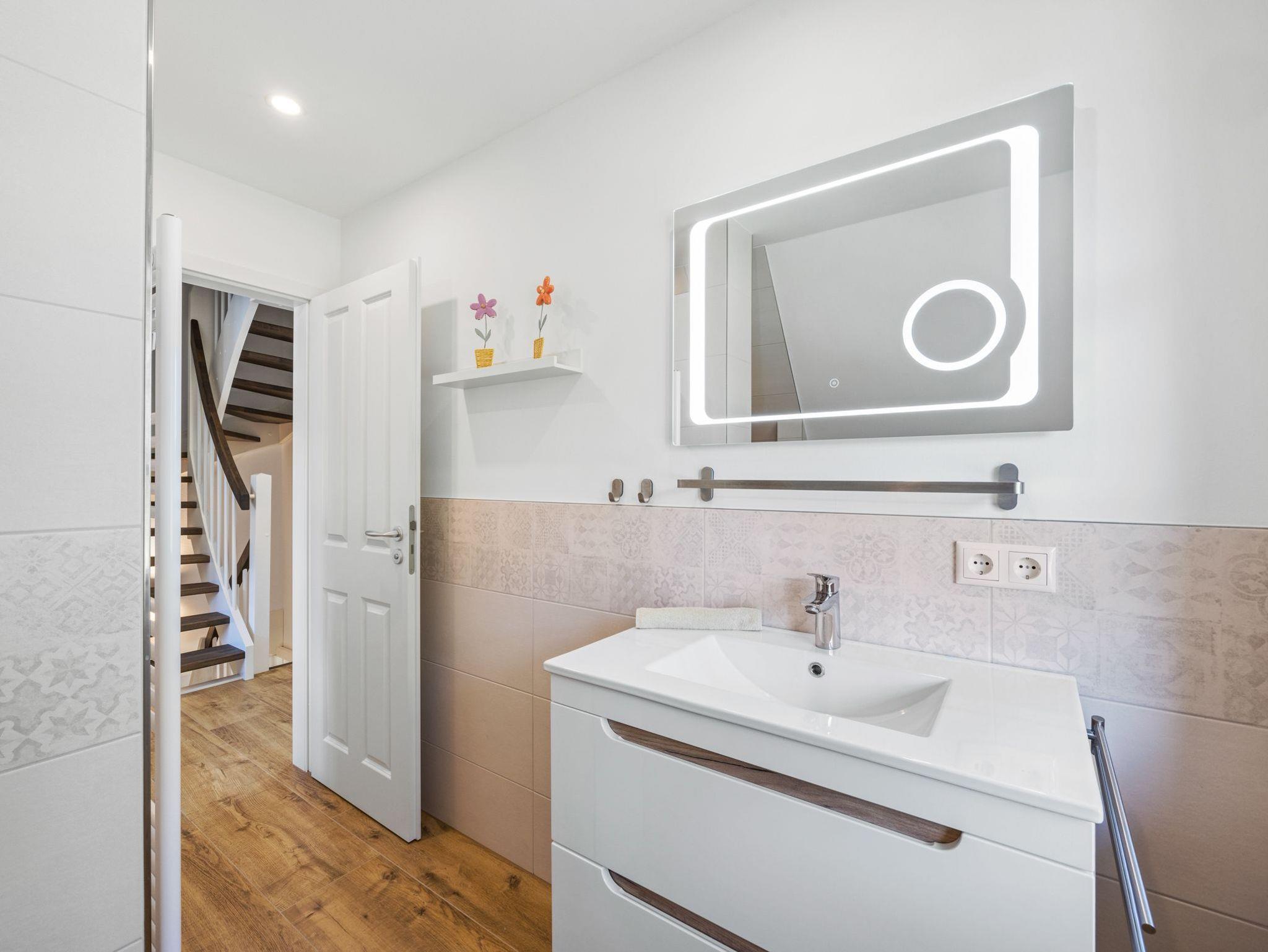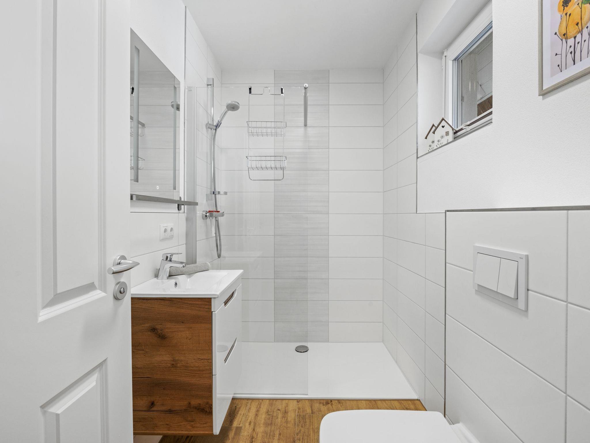 Das zweite Bad mit großer ebenerdiger Dusche und freien Blick in die Natur bietet echtes Urlaubsfeeling.