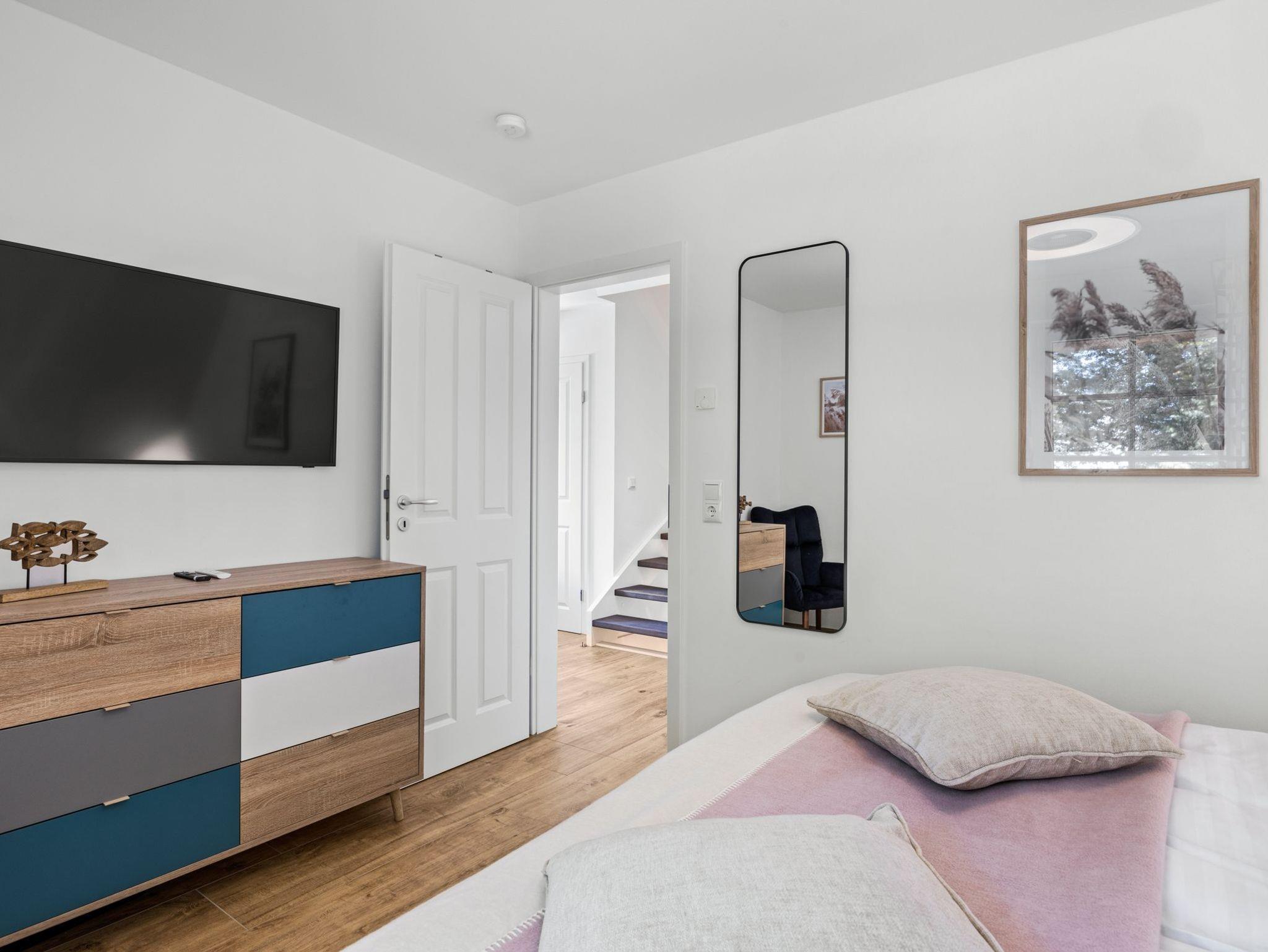 Schlafzimmer 1 mit Doppelbett (1,80 x 2,00m), mit einer Komode und Smart-TV