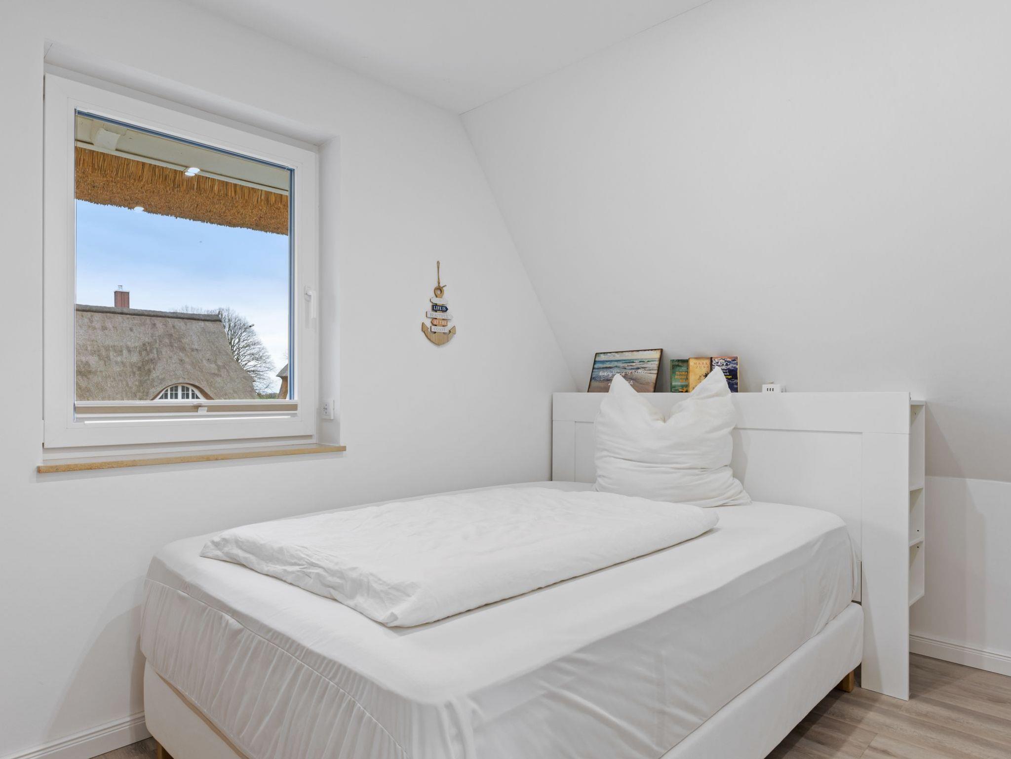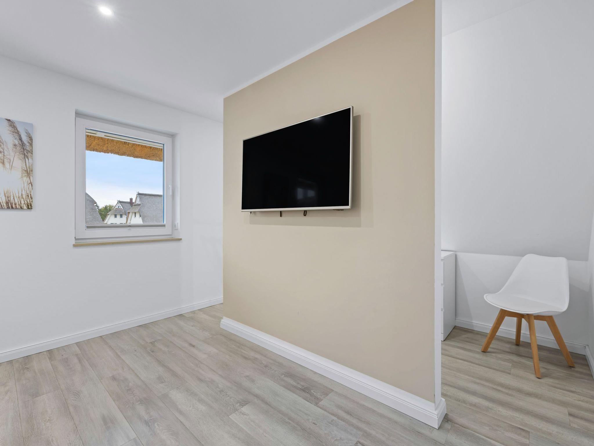 Im Obergeschoss befinden sich drei weitere Schlafzimmer. Schlafzimmer 2 mit Boxspring Doppelbett (1,80 x 2,00m) und TV. Schlafzimmer 3 mit Boxspring Doppelbett (1,80 x 2,00m), TV und Kleiderschrank, Schlafzimmer 4 mit Boxspring Doppelbett (1,40 x 2,00m), TV und Kleiderschrank. Im Flur entsteht ein separater Arbeitsplatz für die Gäste des Hauses. Individuelles Wohlfühlbad unter dem Reetdach mit Badewanne und Rainshower- Dusche sowie Bidet.