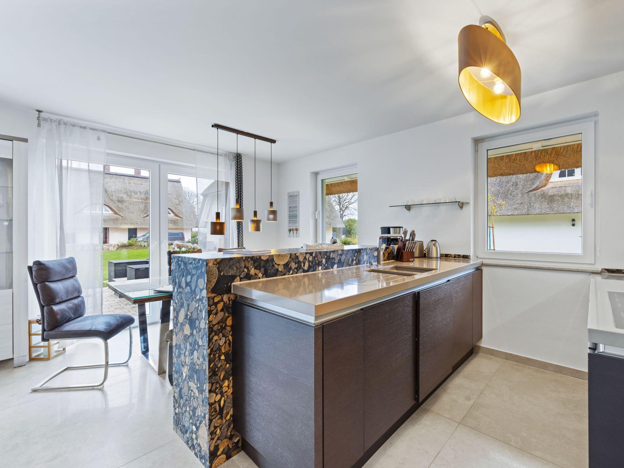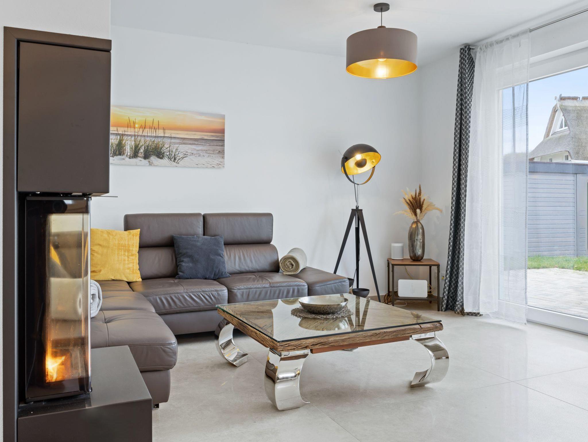 Weitläufiger Flur zum Ankommen. Großzügiger, hochwertig und stilvoll eingerichteter Wohn- Essbereich mit gemütlicher Sofaecke und Kamin sowie Smart TV. Die Küche verfügt über einen großen Esstisch für 8 Personen und eine umfangreiche Ausstattung mit Geschirrspüler, Backofen, Cerankochfeld mit 5 Kochfeldern, Mikrowelle mit Grillfunktion, Wasserkocher, Filterkaffeemaschine und jede Menge weitere Küchenutensilien. Aus der Küche gelangt man direkt auf den schönen 40qm großen Terrassenbereich. Hier lassen sich der Garten und die Weite des Ostseehimmels genießen.