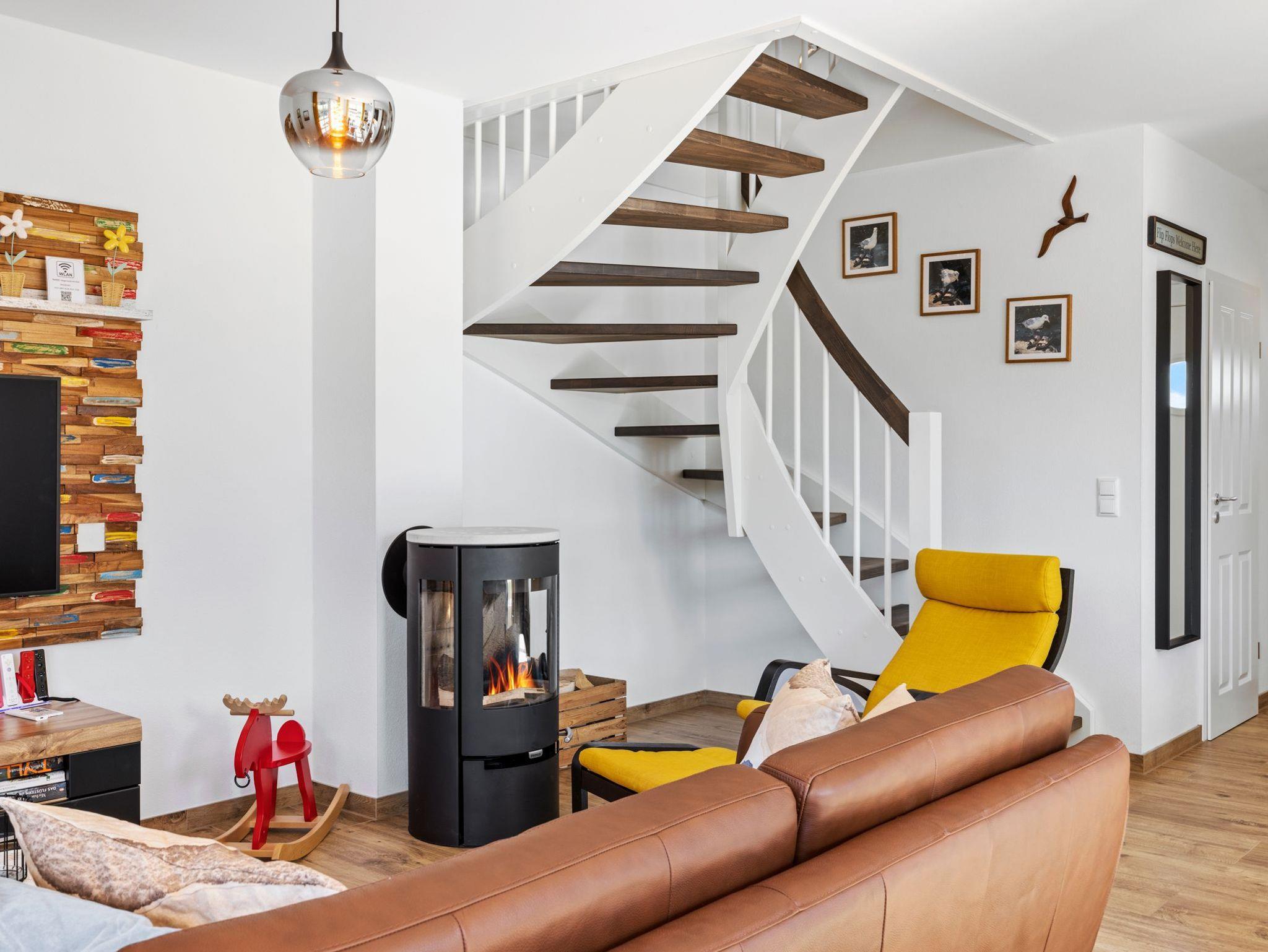 Ein kleiner Flur mit Blick in den offenen Wohnbereich zum entspannten Ankommen für alle Urlaubsgäste. Am Flur angrenzend befindet sich das erste Badezimmer mit ebenerdiger Dusche. Ein kleiner Hauswirtschaftsraum bietet Platz für die Waschmaschine. Großzügiger, stylisch und urgemütlich eingerichteter Wohn- Essbereich mit Ledersofa, Sessel und Kamin sowie Smart TV. Der Küchenbereich verfügt über einen großen Esstisch für 6 Personen und eine umfangreiche Ausstattung mit Geschirrspüler, Backofen, Herd mit 4 Kochfeldern, Wasserkocher, Kaffeevollautomat und jede Menge weitere Küchenutensilien. Aus dem offenen Küchen-Wohnbereich gelangt man direkt auf den schönen Terrassenbereich mit Blick in die freie und unverbaute Natur der Salzhaffregion. Hier kann man ebenso wunderbar den klaren Ostseehimmel genießen und einfach die Seele baumeln lassen