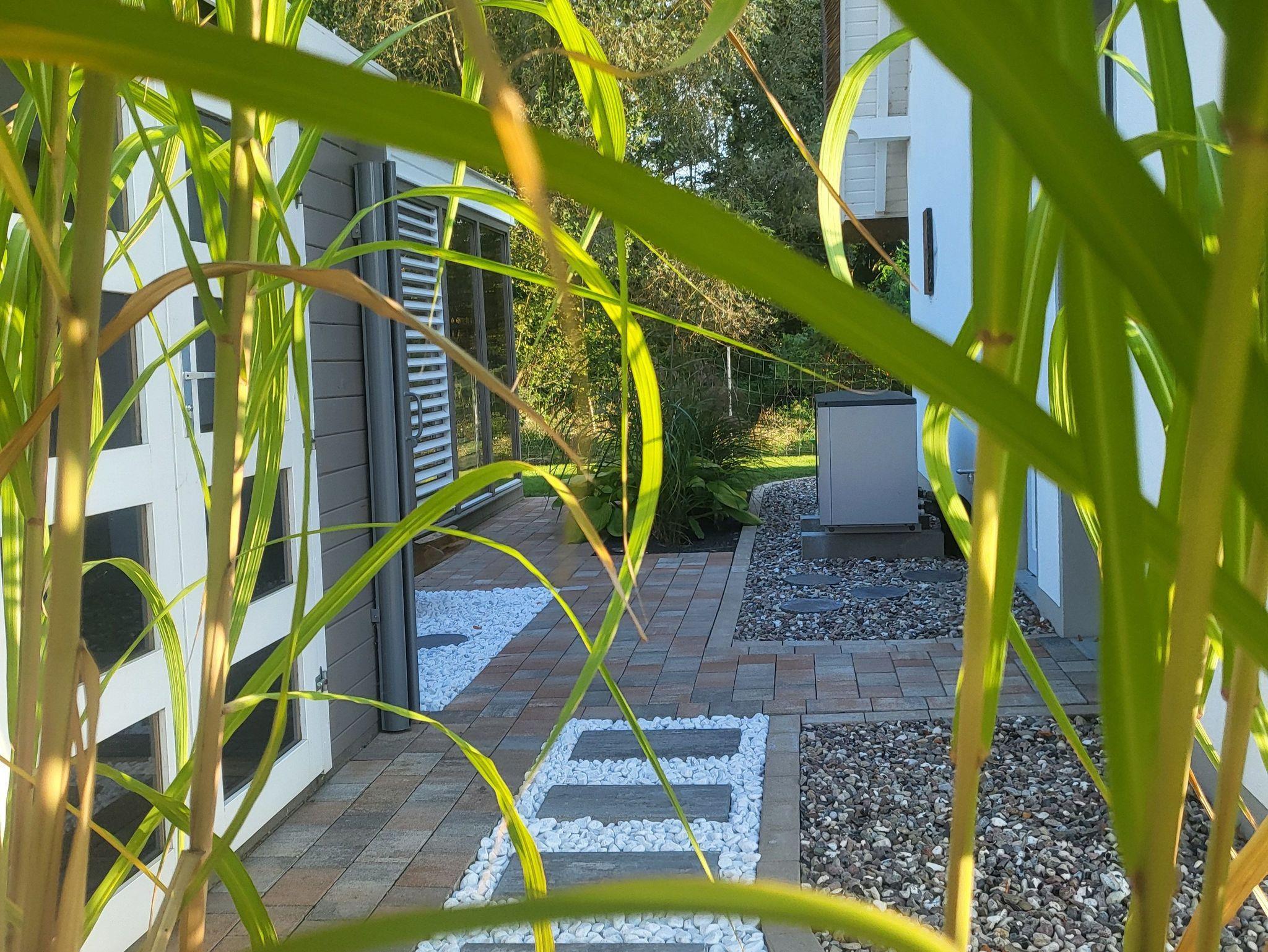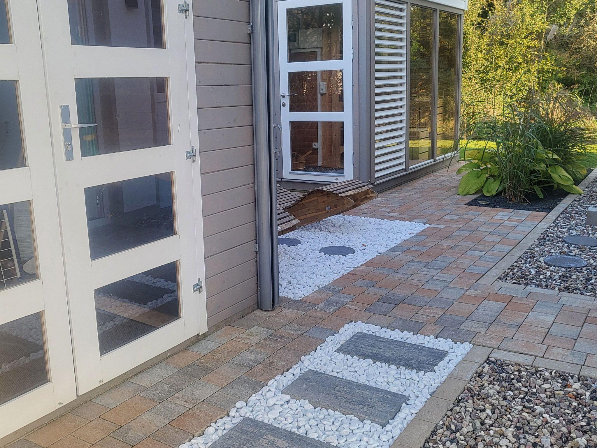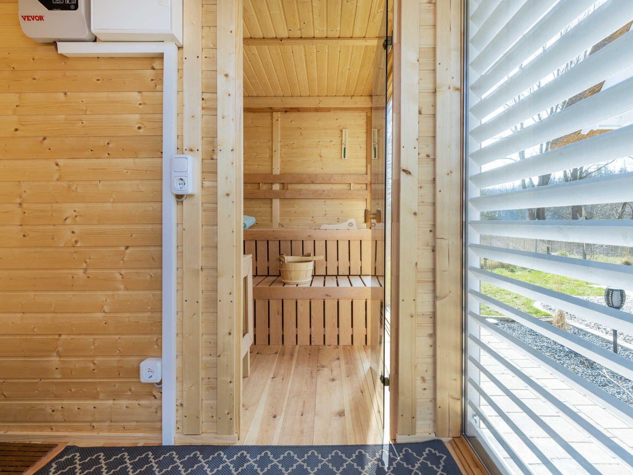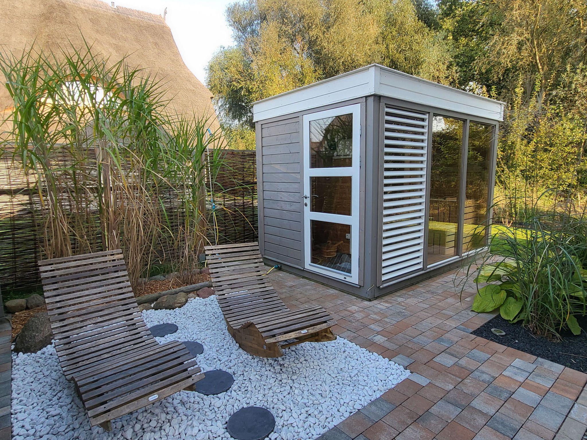 Das Haus hat einen in sich geschlossenen Außenbereich mit einem exklusiven Saunahaus und Relaxbereich im Garten und Außendusche (Nutzung von Ende April bis Ende Oktober). Es gibt Terrassenbereiche rund um das Haus, um immer ein passendes Plätzchen in der Sonne oder auch im Schatten genießen zu können. Gartenmöbel und ein Strandkorb laden zum gemeinsamen Entspannen im Freien ein. Zusätzlich gibt es ein separates Gartenhaus für Fahrräder und Outdoor Equipment (verfügbar ab Sommer 2022).