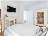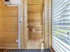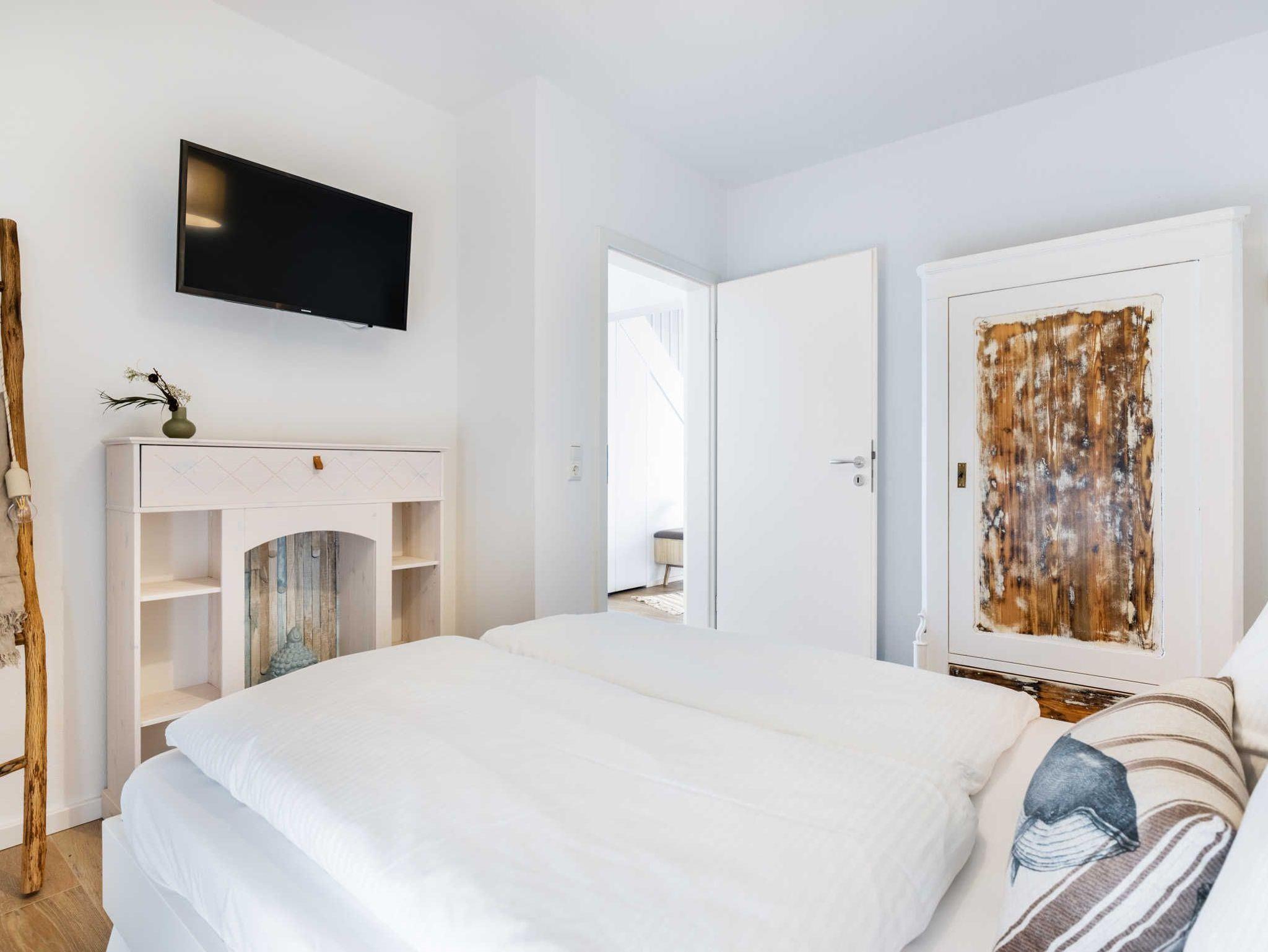 Schlafzimmer 1 mit französischem Bett (1,40 x 2,00m), Kleiderschrank, TV und Zugang zum Außenbereich. Bad mit ebenerdiger Dusche und direktem Zugang zur Außensauna und auch Außendusche.