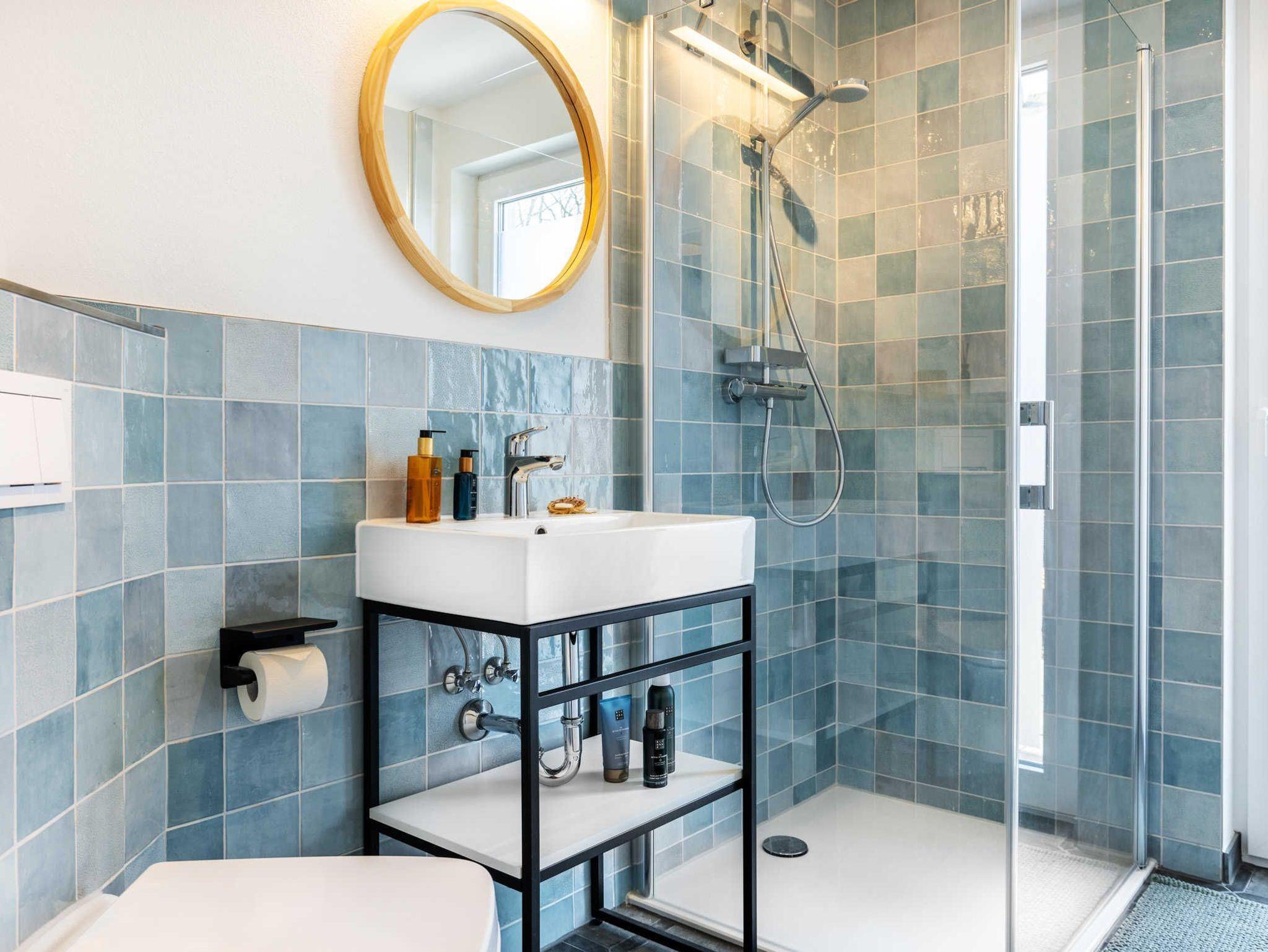 Das Wellnessbad mit Blick in die unverbaute Natur lädt zu Wohlfühlzeiten im Whirlpool und der großen Dusche mit Regenbrause ein.