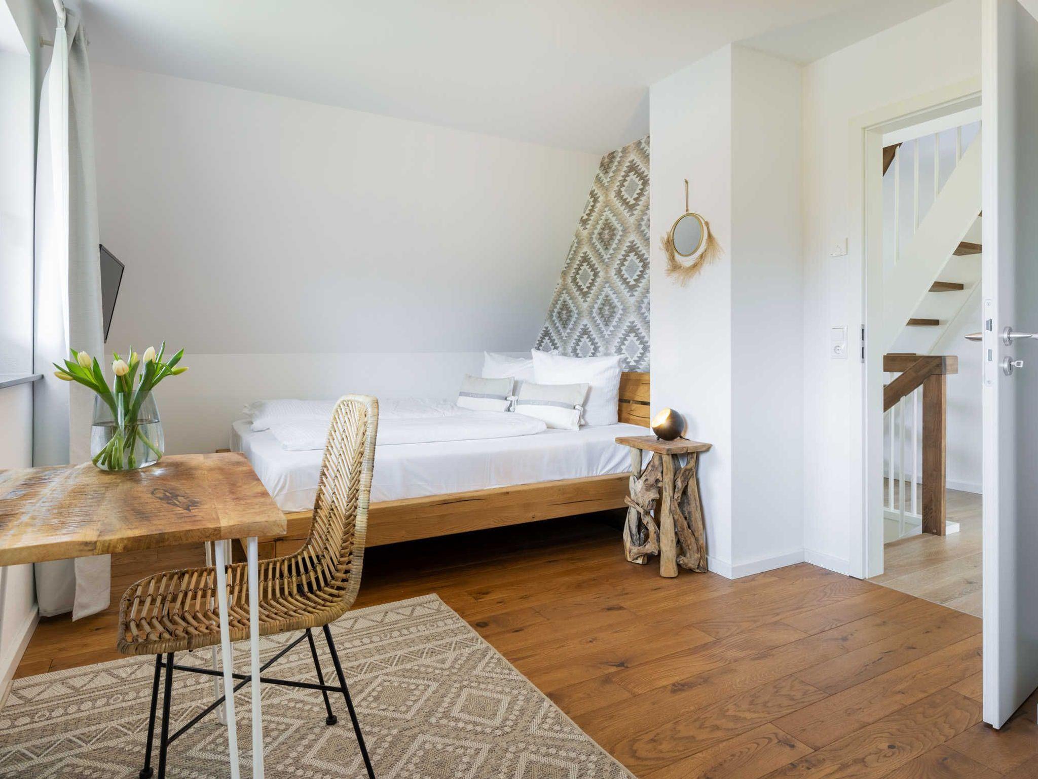 Im Obergeschoss befinden sich zwei weitere Schlafzimmer. Schlafzimmer 2 mit Doppelbett (1,80 x 2,00m) und großem urigen Einbaukleiderschrank. Schlafzimmer 3 mit Doppelbett (1,80 x 2,00m) und weiterem individuellen Einbaukleiderschrank und einem ruhigen Arbeitsplatz.
