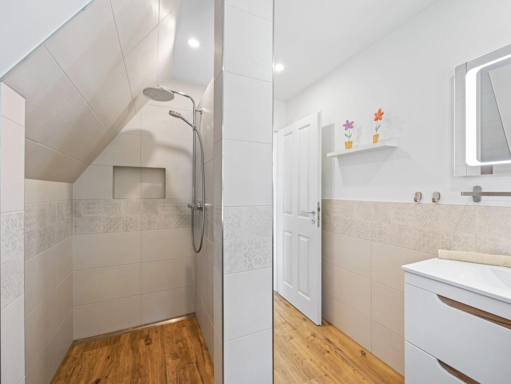Das zweite Bad mit großer ebenerdiger Dusche und freiem Blick in die Natur bietet echtes Salzhaff Urlaubsfeeling.
