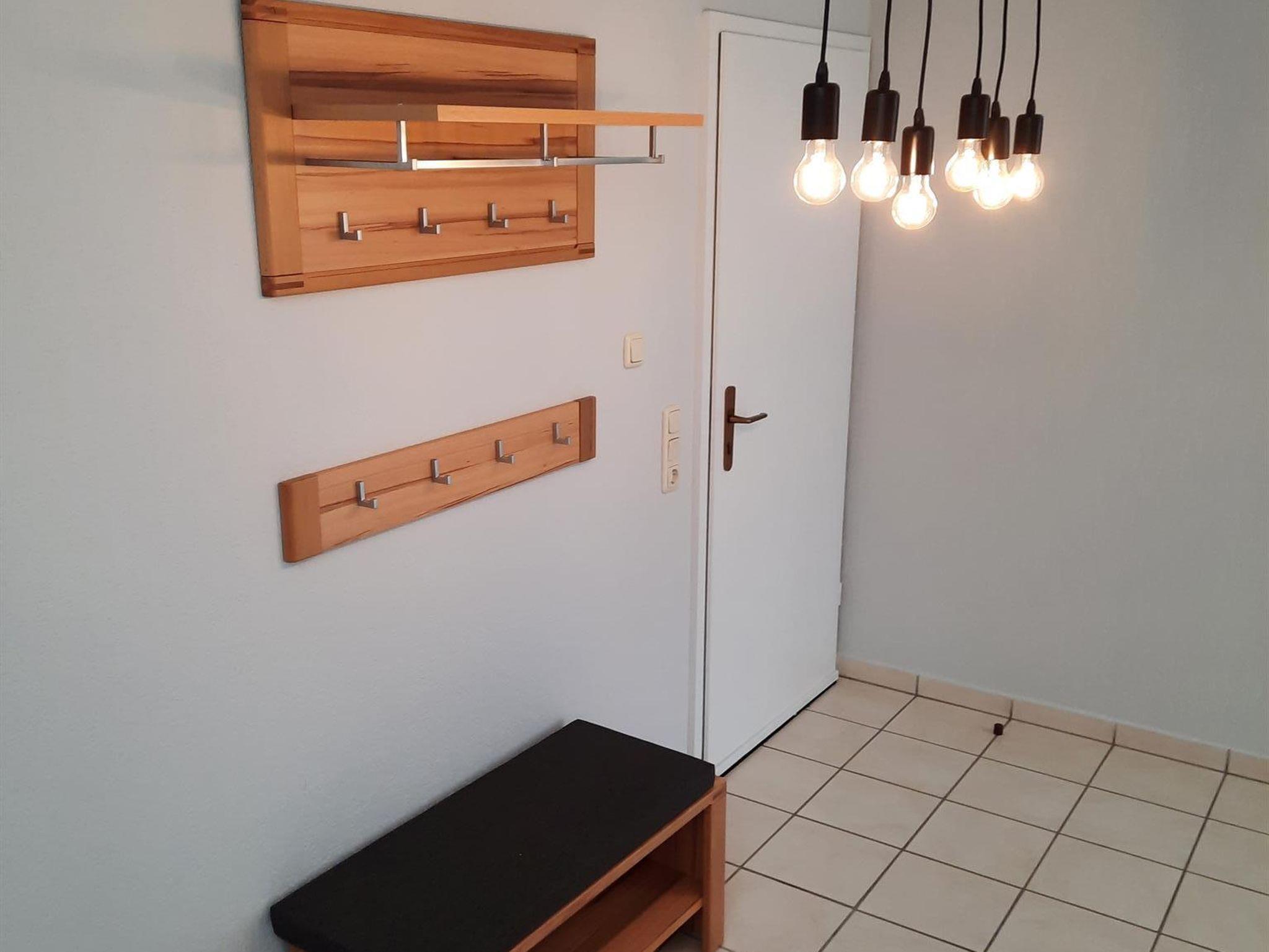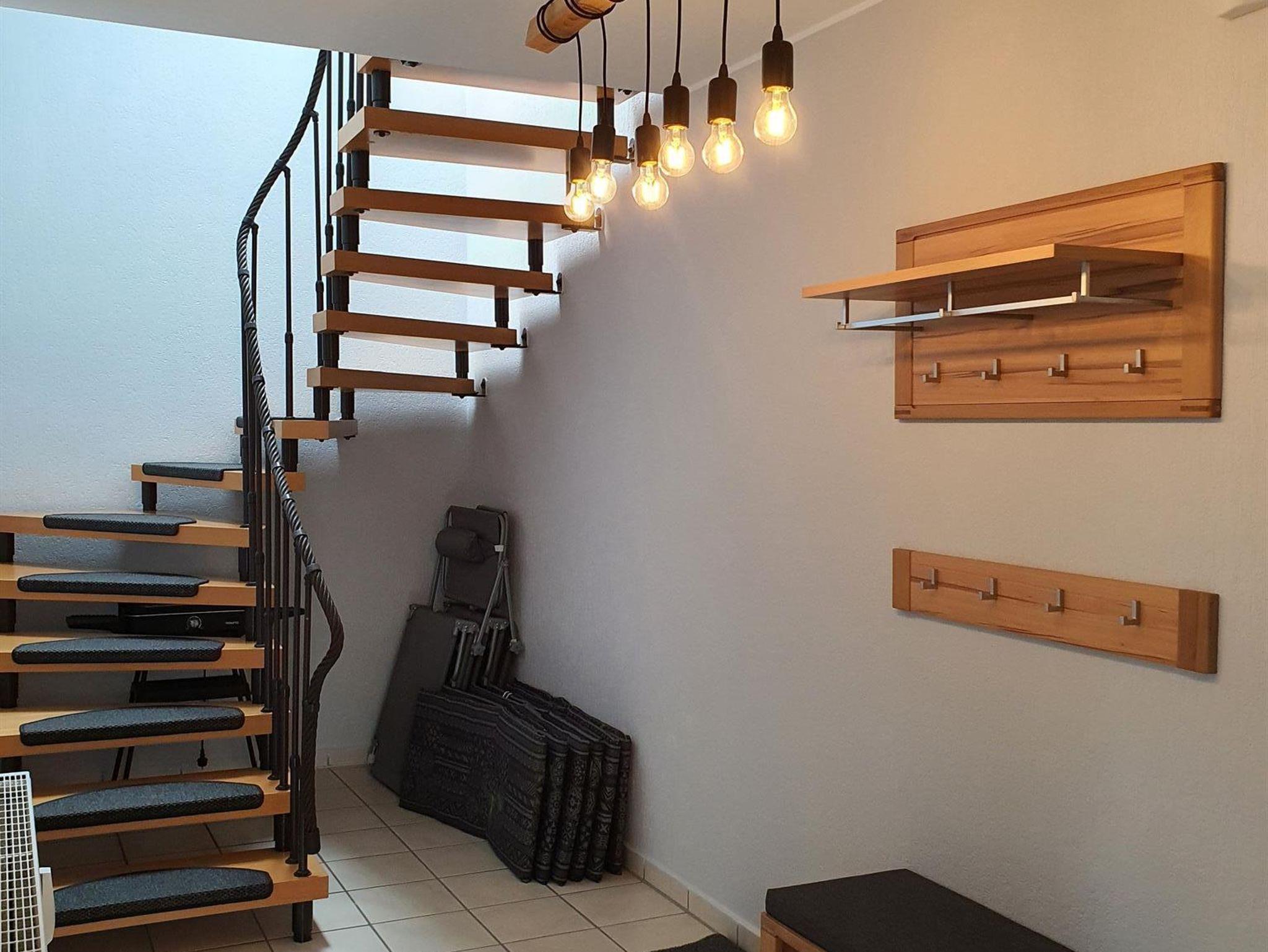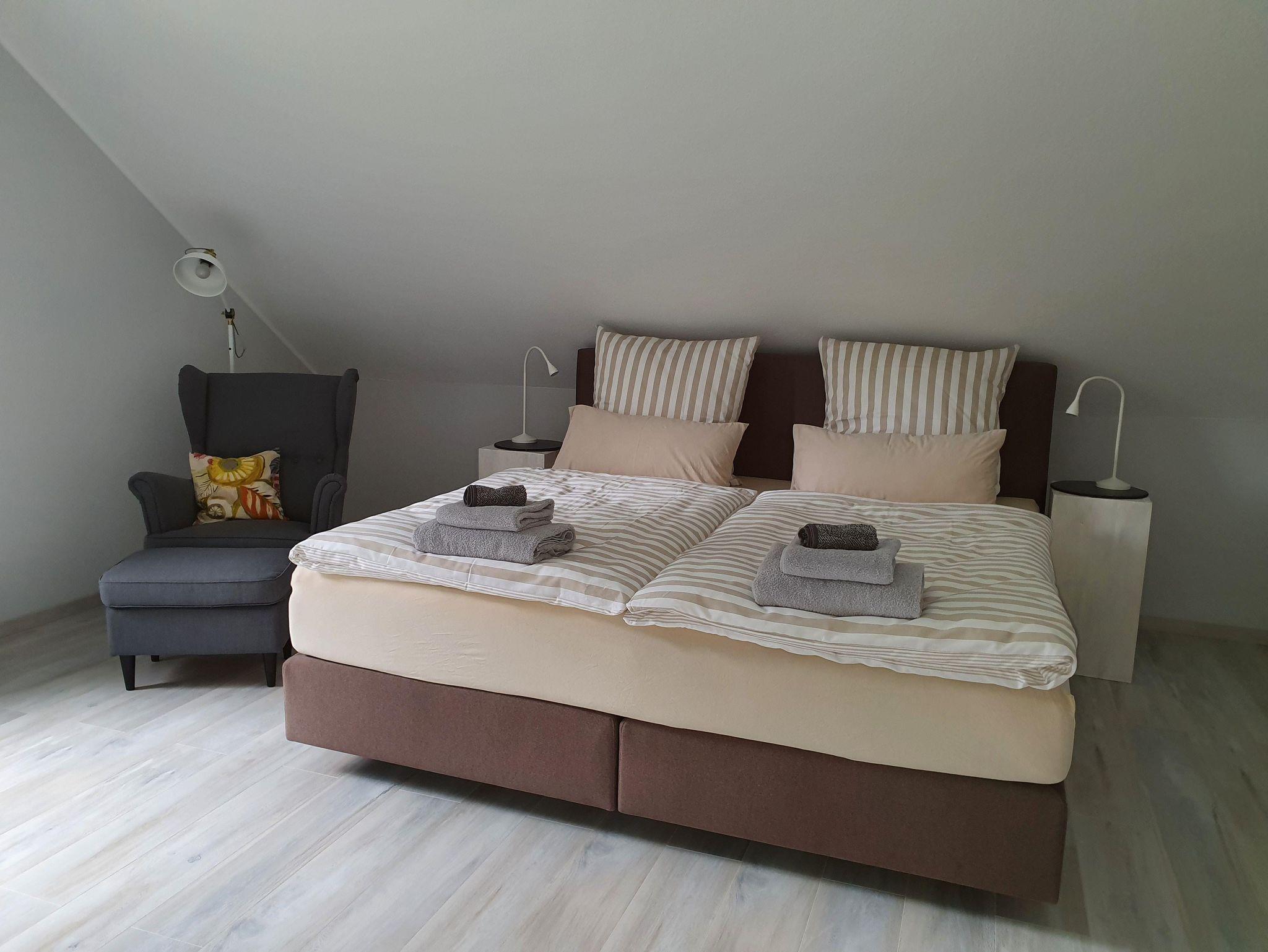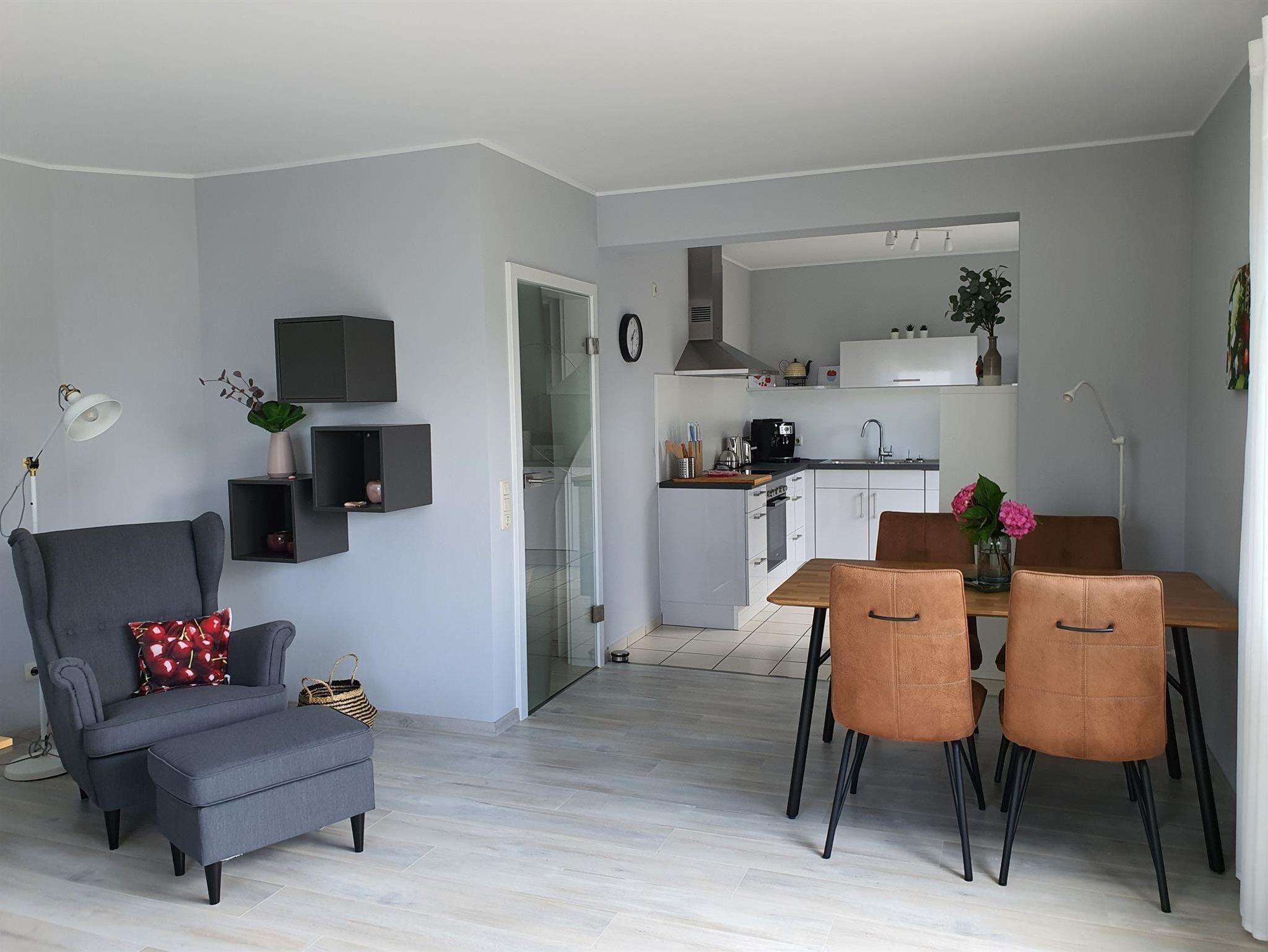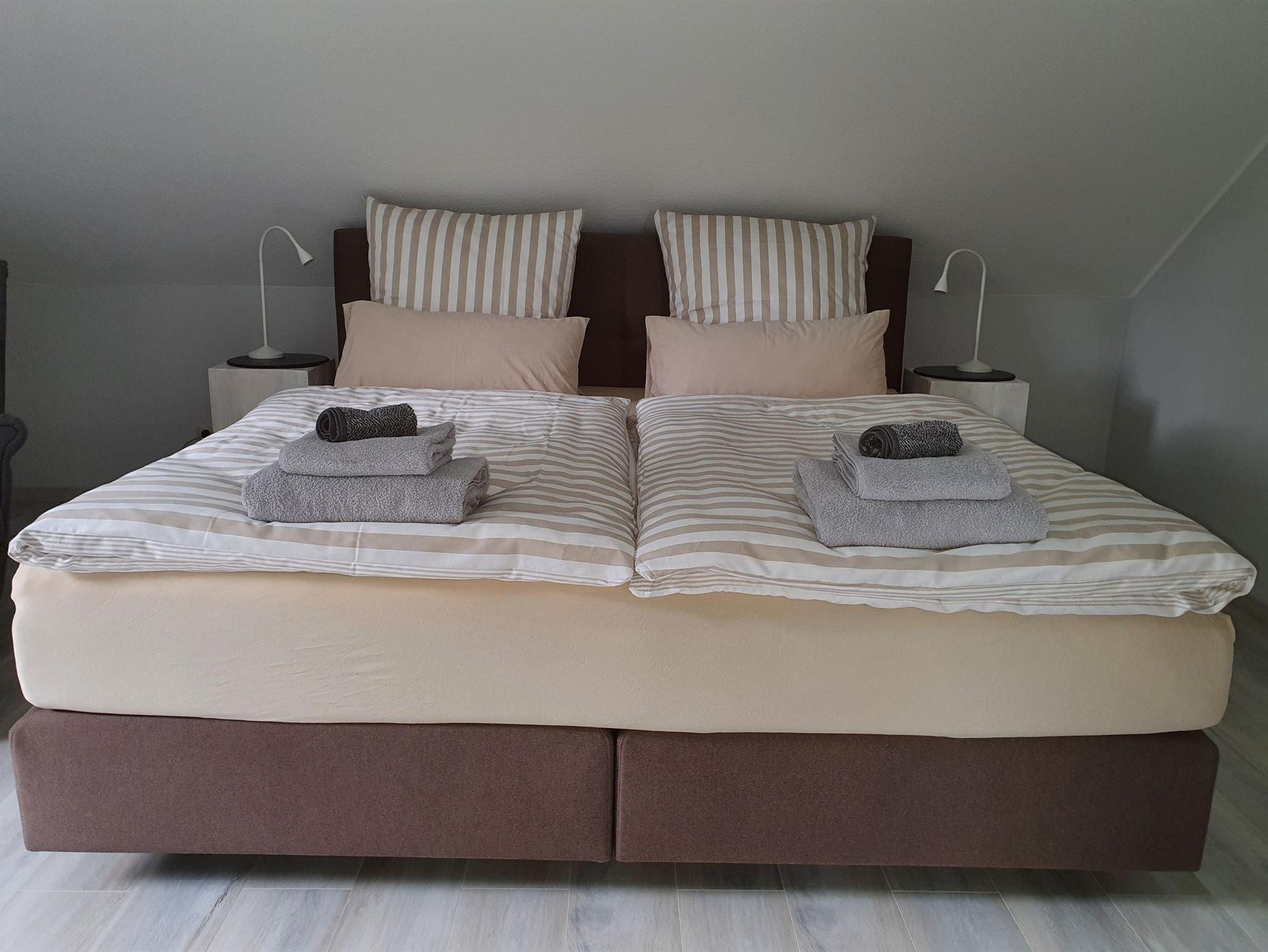 Die FeWo erstreckt sich über zwei Stockwerke. Der Eingangsbereich empfängt die Gäste und führt über eine offene Treppe in die zweite Etage. Im unteren Stockwerk befinden sich eine Gästetoilette, ein Hauswirtschaftsraum, ein Wohn- Essraum und eine offene Küche. Sowohl die Küche als auch der Wohnraum bieten die Möglichkeit, den Balkon zu begehen. Auf der zweiten Etage sind zwei Schlafzimmer, eines mit einem Boxspringbett möbliert, das andere mit zwei Einzelbetten. Ein großer Ankleideraum ist vorhanden. Das Badezimmer verfügt über eine begehbare Dusche. Für Autos und Räder gibt es Stellplätze.