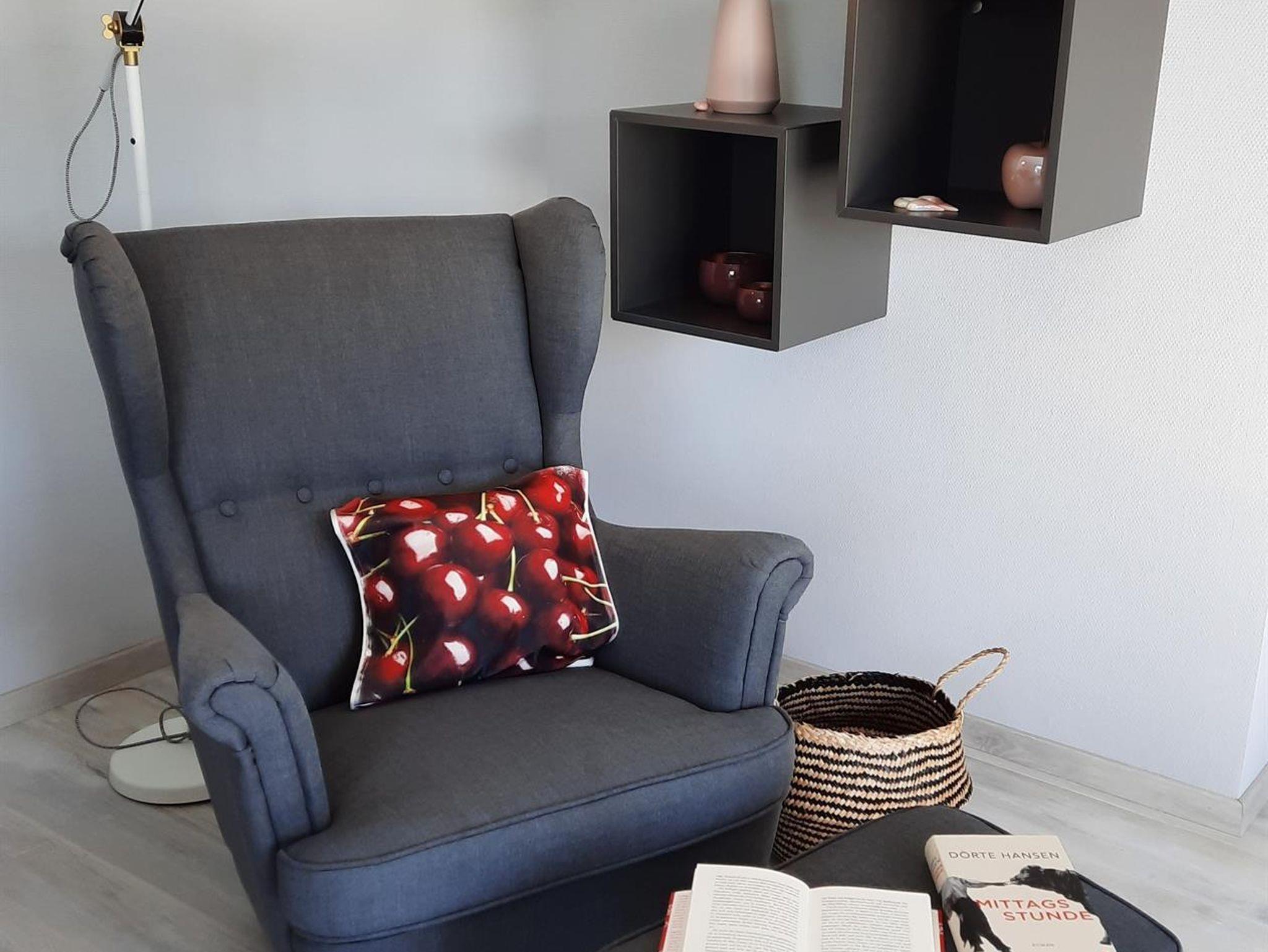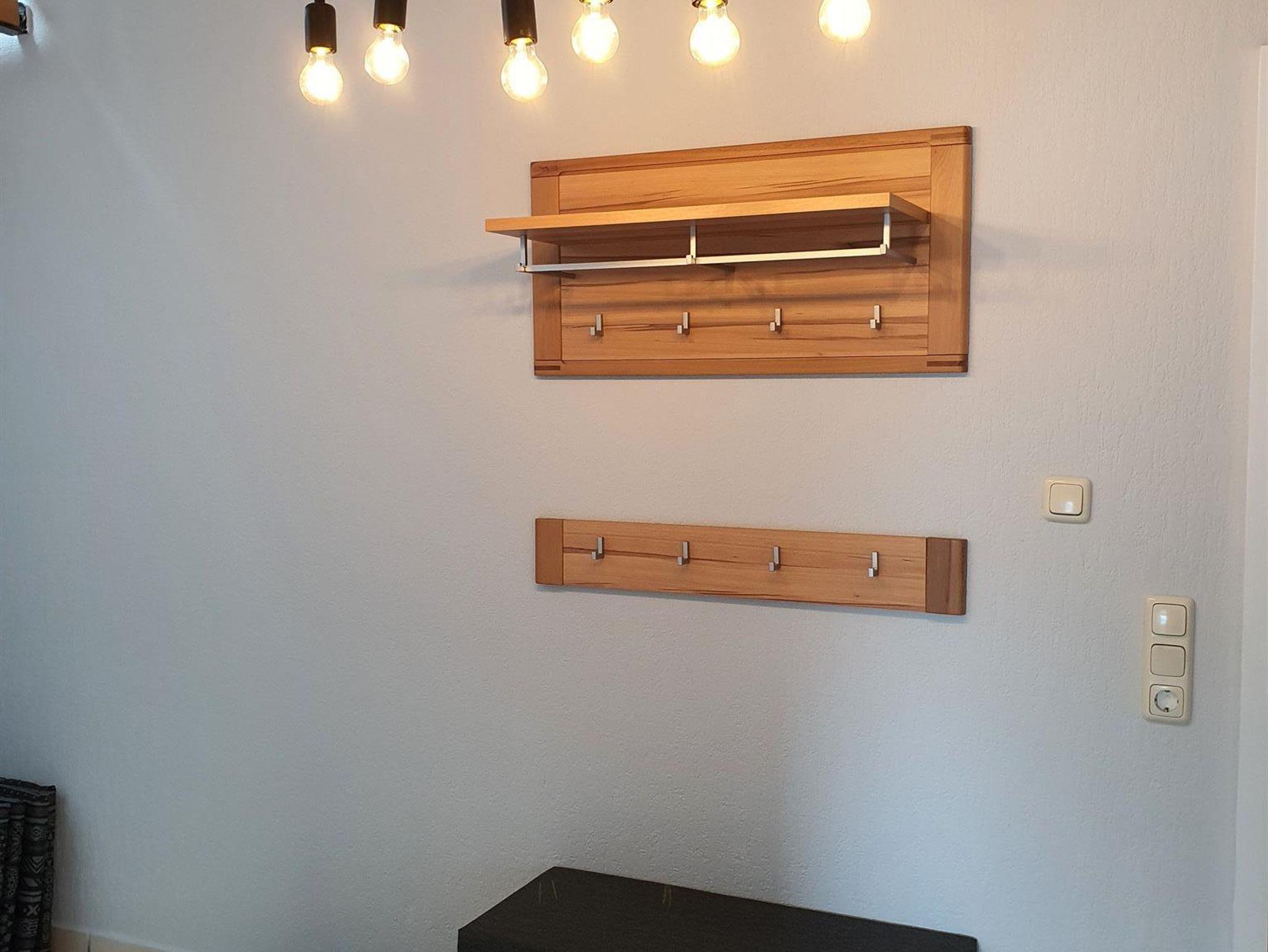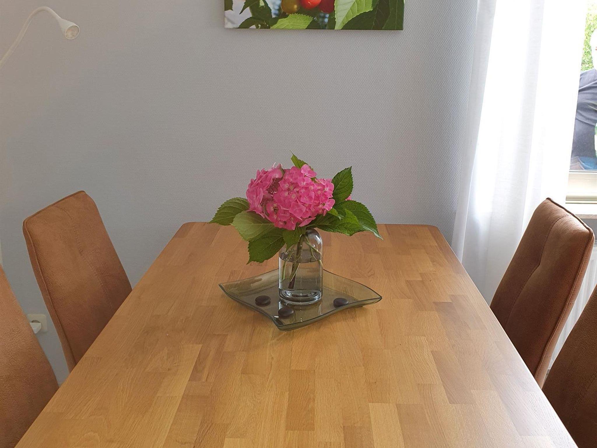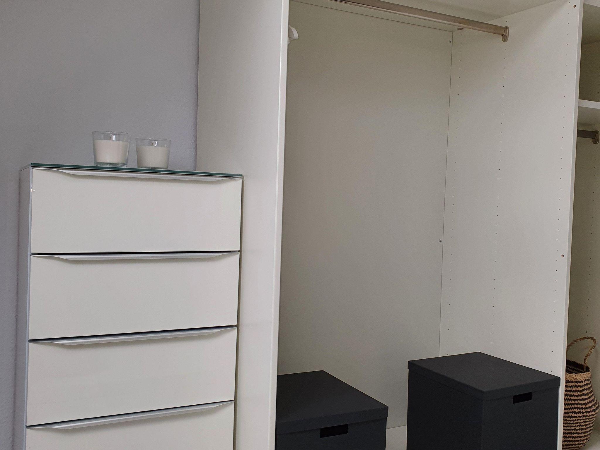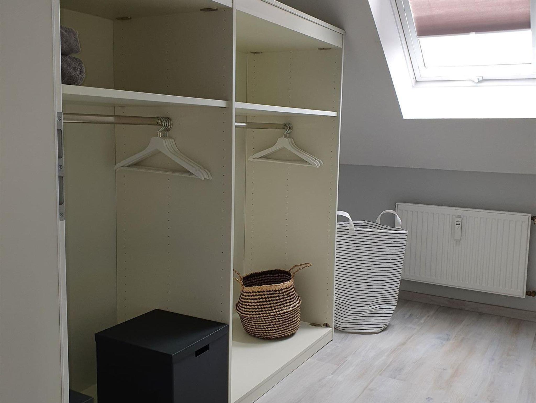 Die FeWo erstreckt sich über zwei Stockwerke. Der Eingangsbereich empfängt die Gäste und führt über eine offene Treppe in die zweite Etage. Im unteren Stockwerk befinden sich eine Gästetoilette, ein Hauswirtschaftsraum, ein Wohn- Essraum und eine offene Küche. Sowohl die Küche als auch der Wohnraum bieten die Möglichkeit, den Balkon zu begehen. Auf der zweiten Etage sind zwei Schlafzimmer, eines mit einem Boxspringbett möbliert, das andere mit zwei Einzelbetten. Ein großer Ankleideraum ist vorhanden. Das Badezimmer verfügt über eine begehbare Dusche. Für Autos und Räder gibt es Stellplätze.