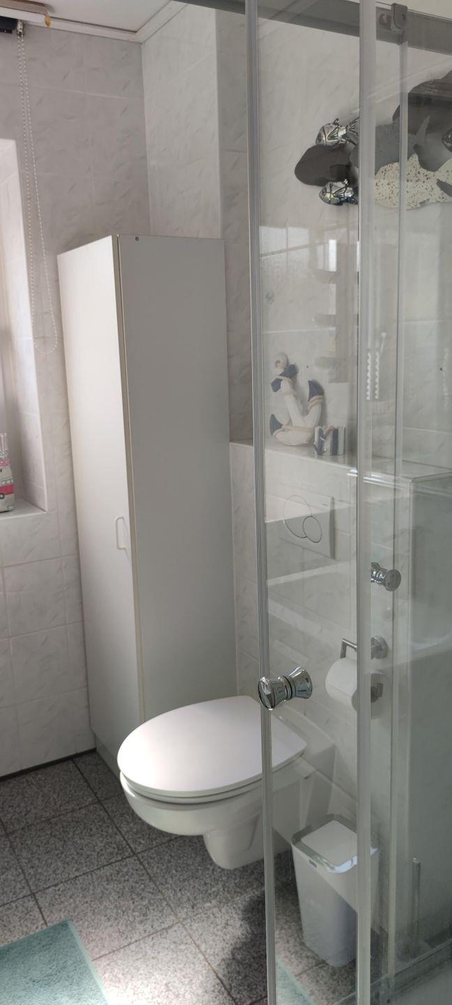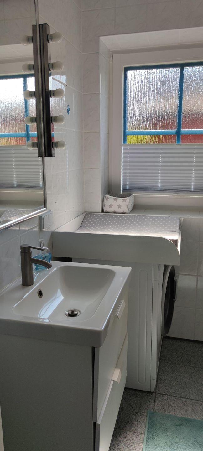 Das Bad hat eine ebenerdige Dusche, dort befindet sich auch eine Waschmaschine, die auch eine Trockenfunktion besitzt.