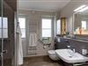 Das Bad besitzt eine ebenerdige breite Dusche mit einer ca. 1,20m breiten Tür. Eine Waschmaschine und ein Wäscheständer sind ebenfalls vorhanden.
