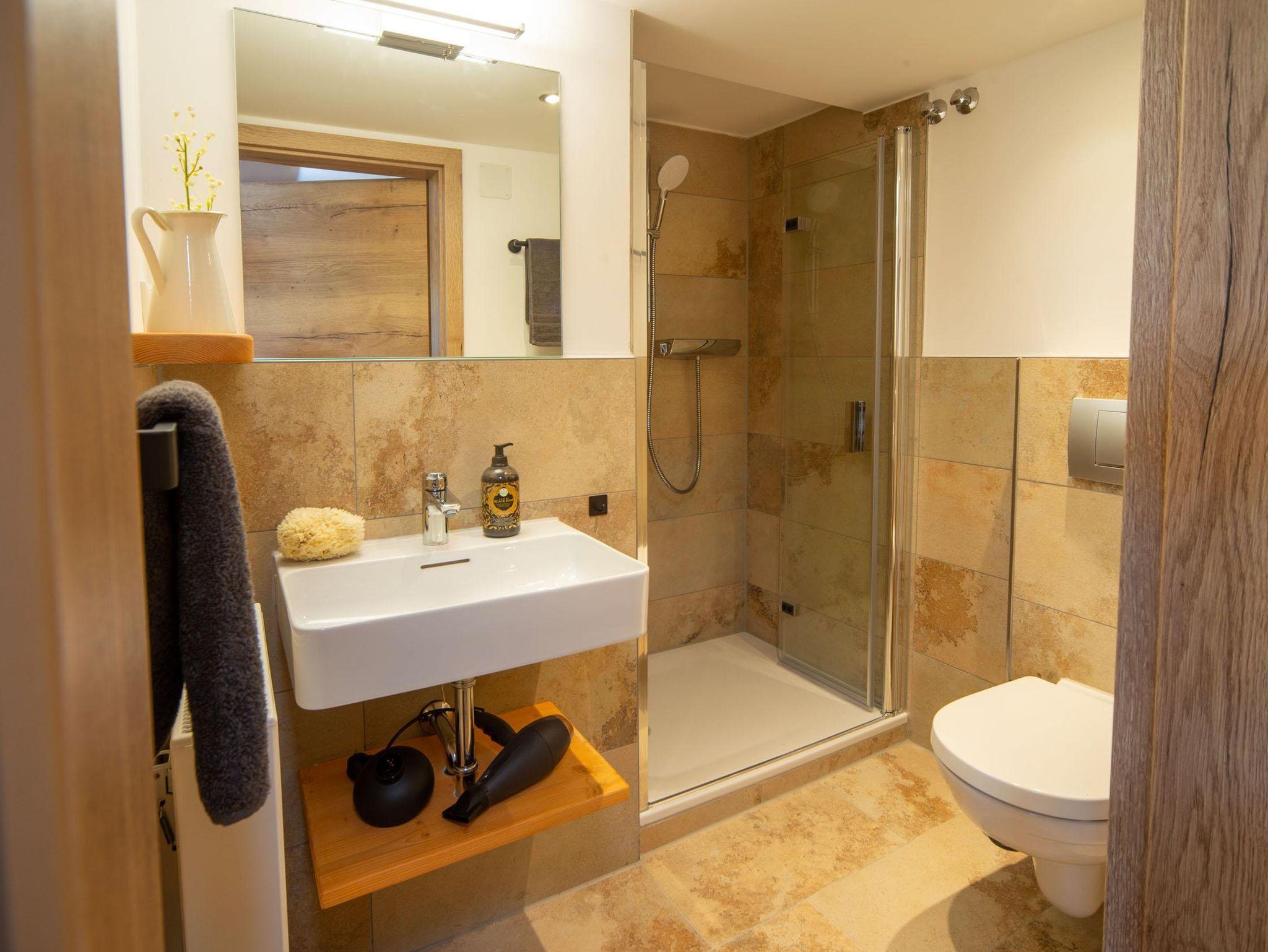 Im Vorderhaus ist eine Hundedusche für Vierbeiner installiert. In nächster Nähe befinden sich tolle Spazierwege und zum Haus gehört auch ein Hang mit großer Wiese.