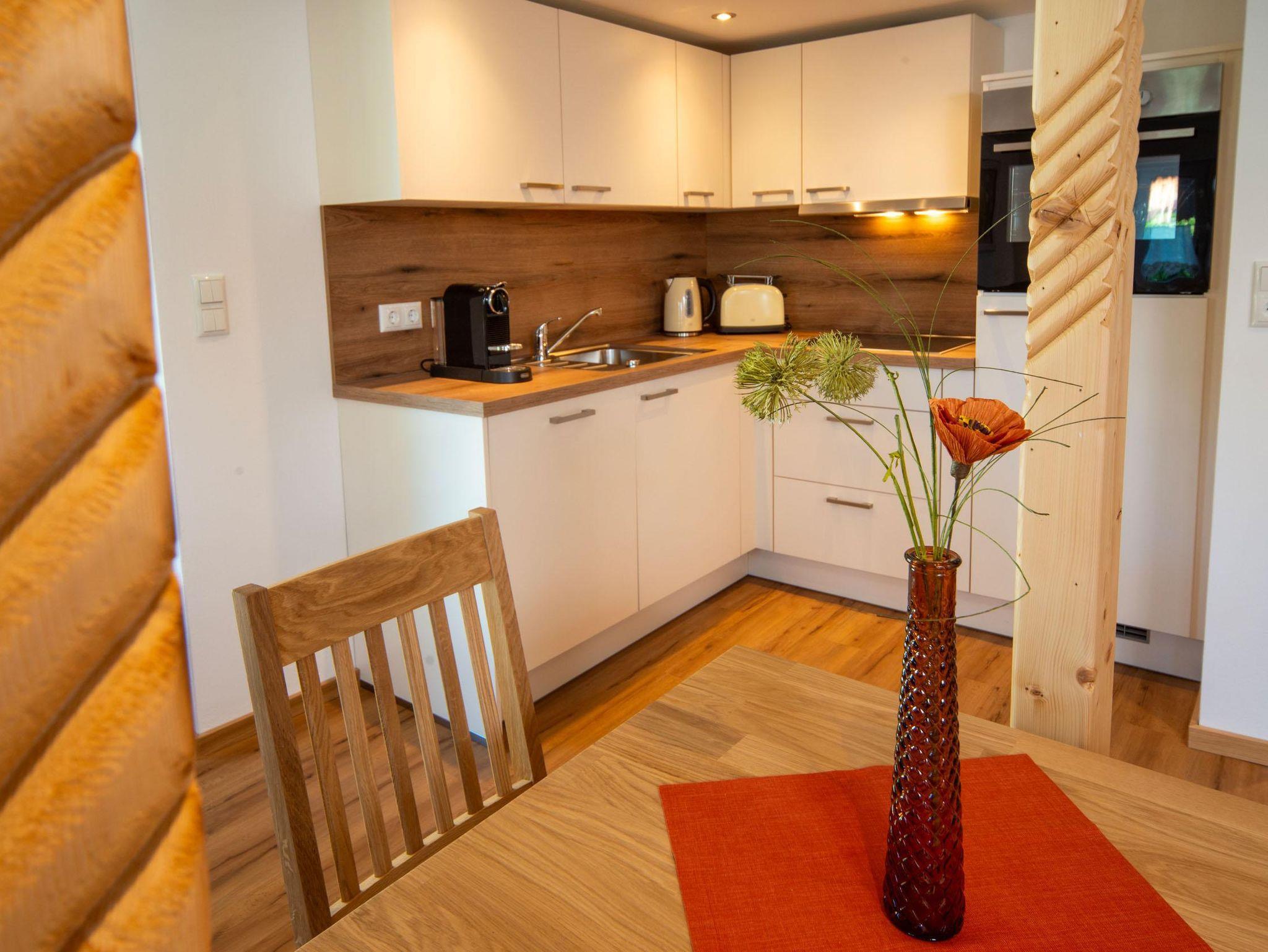 • Wohnküche mit Nespresso Maschine, Milchaufschäumer, Toaster, Cerankochfeld, Backofen, Kühlschrank, Spülmaschine, Wasserkocher