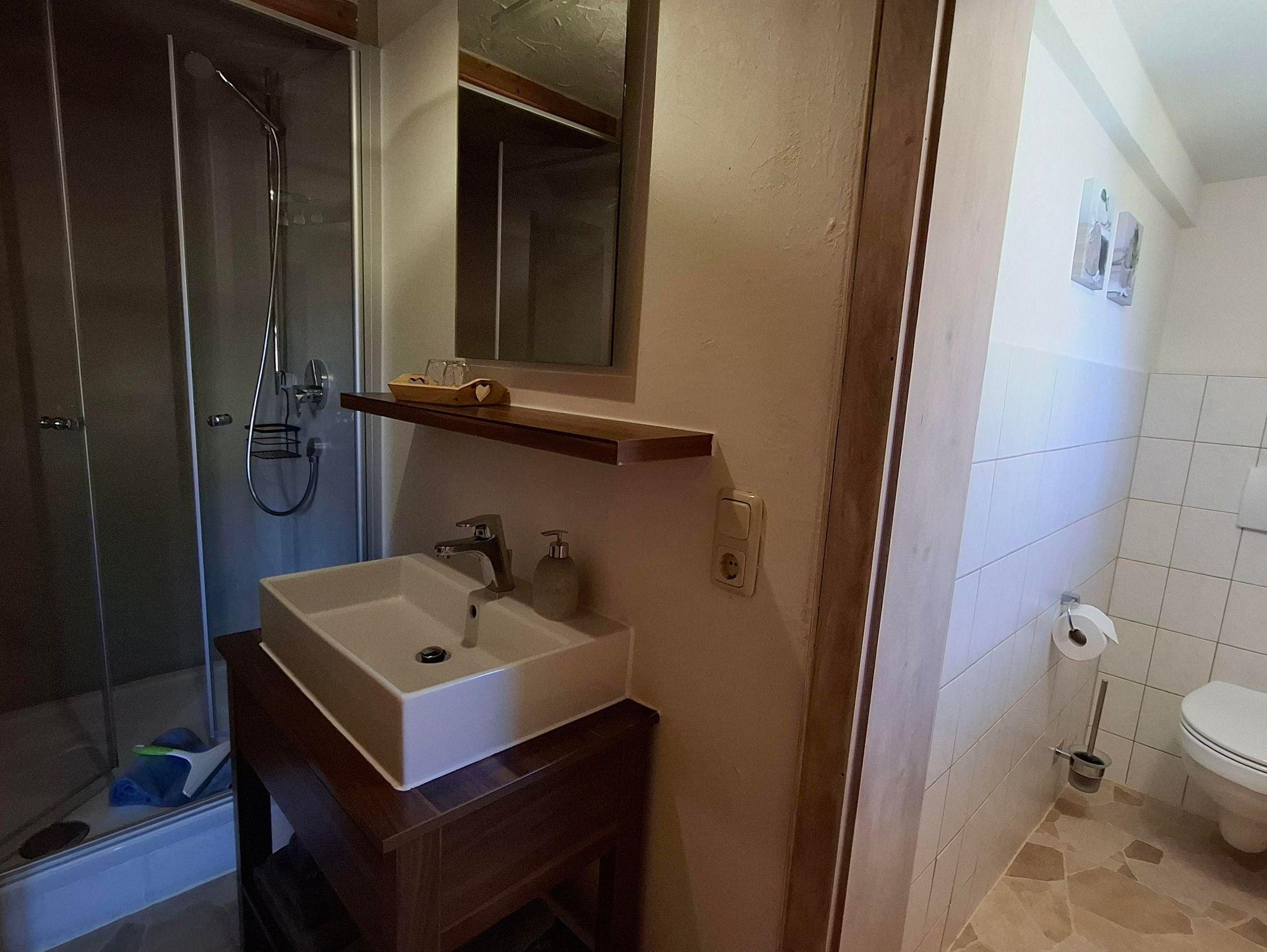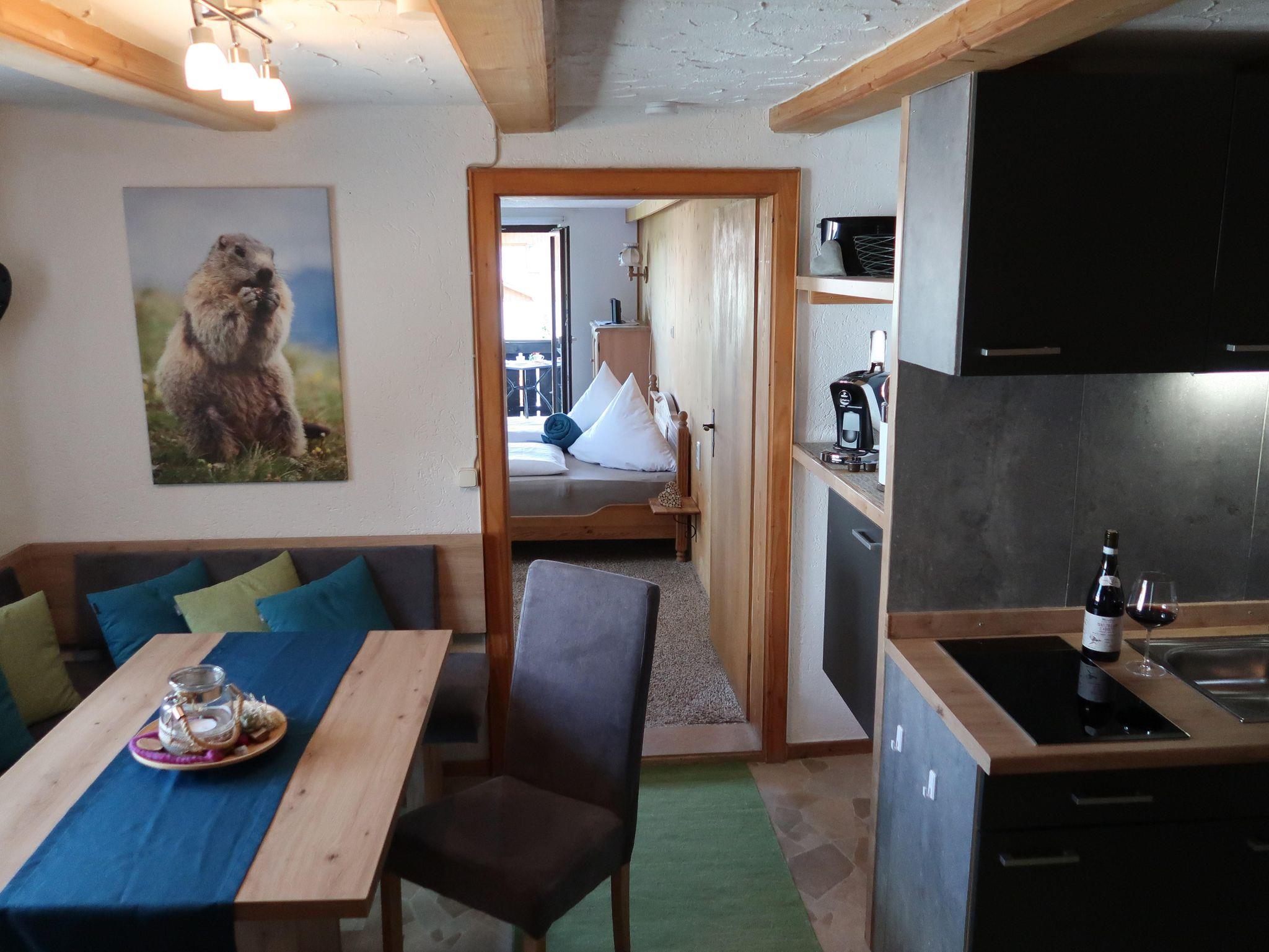 Das renovierte Chalet Murmel für 2 Personen befindet sich im 1.Stock des Altbaus und ist nach Nord-Ost ausgerichtet. Es besticht durch das geräumige Schlafzimmer mit privatem Balkon nach Ost-Süd gerichtet. Somit steht einem entspannten Frühstück in der Morgensonne mit Blick in die Berge nichts im Wege.