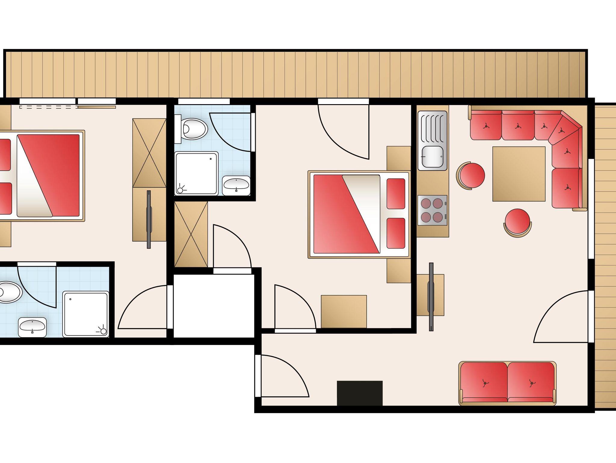 1-2 separate Schlafzimmer (hintereinander liegend) jeweils mit Dusche/WC, Balkon und SAT-TV;
