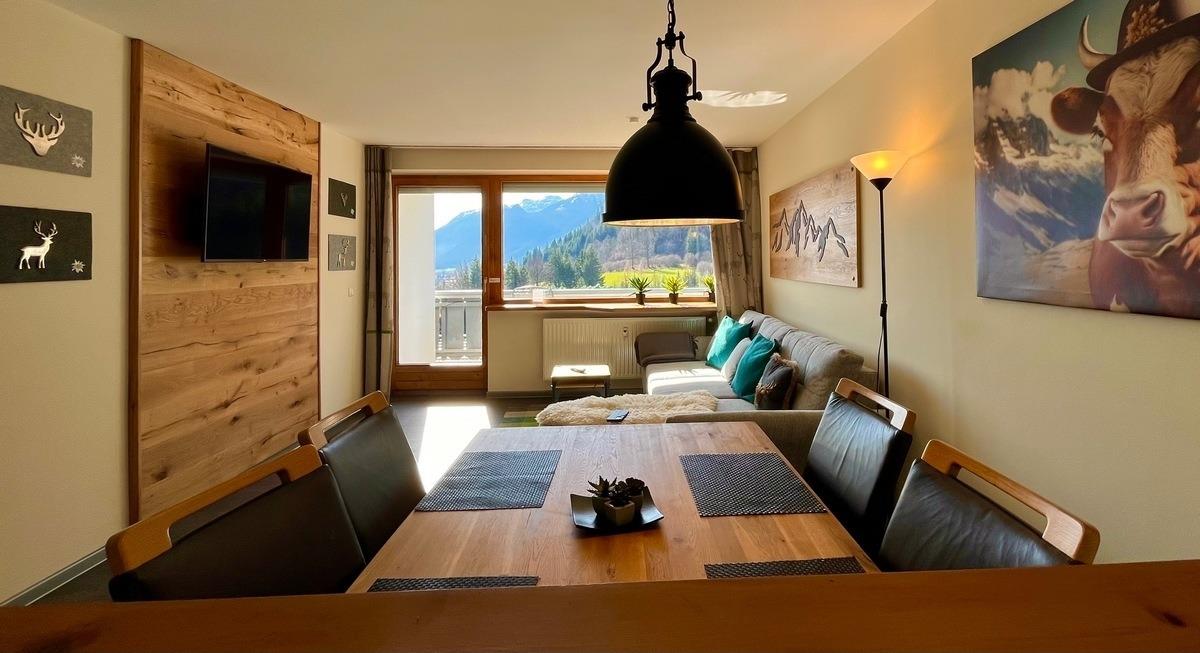 Moderne Wohnkultur mit traditionellem Alpencharme mit Blick auf das Bergpanorama machen diese Ferienwohnung zur perfekten Heimat auf Zeit. Für Sie und Ihre Lieben legen wir höchsten Wert auf eine komfortable Ausstattung. Die wohltuenden Zirben-Holzelemente, das hochwertige Boxspringbett, die moderne Küche und natürliche, alpenländische Dekoration sorgen für die einzigartige Wohlfühlatmosphäre die unsere Gäste so schätzen.