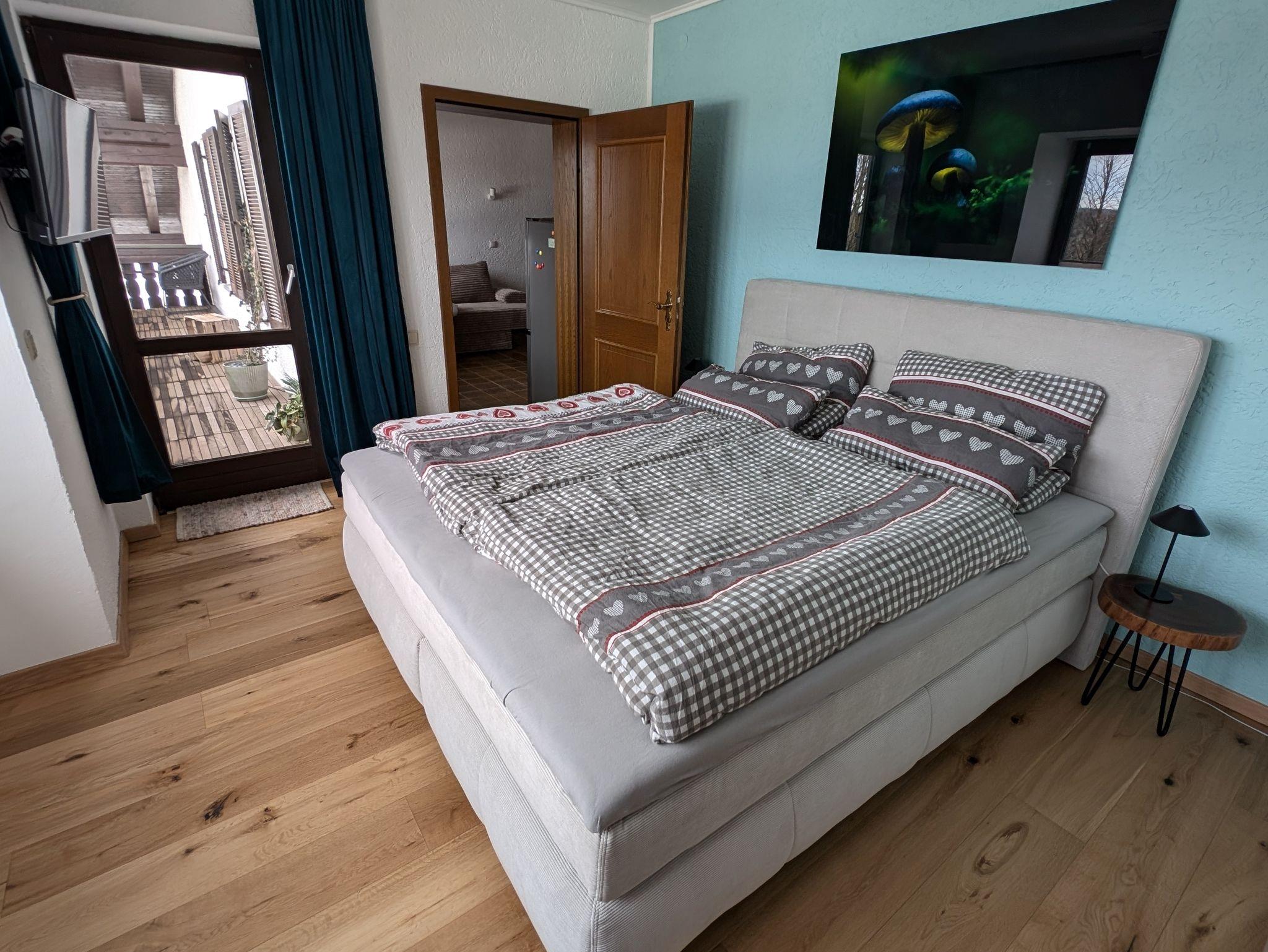 Im Schlafzimmer befindet sich ein bequemes 180 x 200 cm Boxspringbett aus kuscheligem Cord, rustikale Nachttischchen mit Leselampen und ein weiterer Streaming-Flat-TV. Ein beleuchteter 200 cm hoher Schrank bietet ausreichend Platz für die Kleidung (im Winter auch für Skikleidung). Genügend Platz für ein Kinderreisebett ist ebenfalls vorhanden (kann auf Anfrage unentgeltlich zur Verfügung gestellt werden). Ein kleiner Sekretär bietet Platz für anfallende Schreibarbeiten.