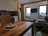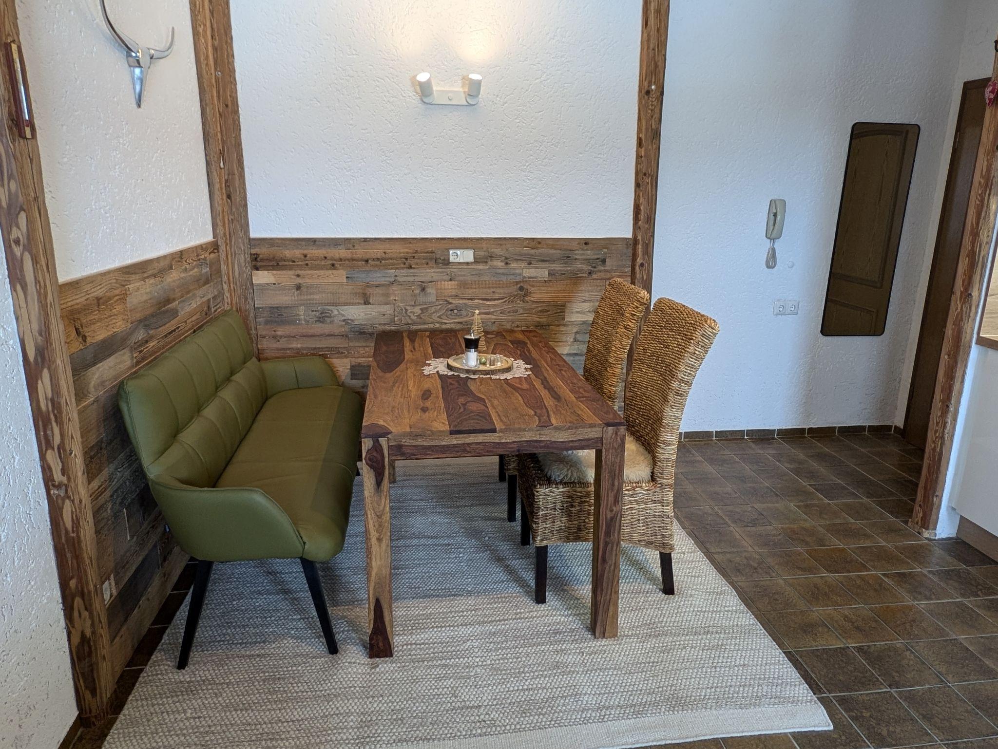 Die Wände im Essbereich sind mit gemütlichem Altholz verkleidet. Der Esstisch, zwei Stühle sowie eine moderne Ledersitzbank bieten viel Platz für mindestens vier Personen.