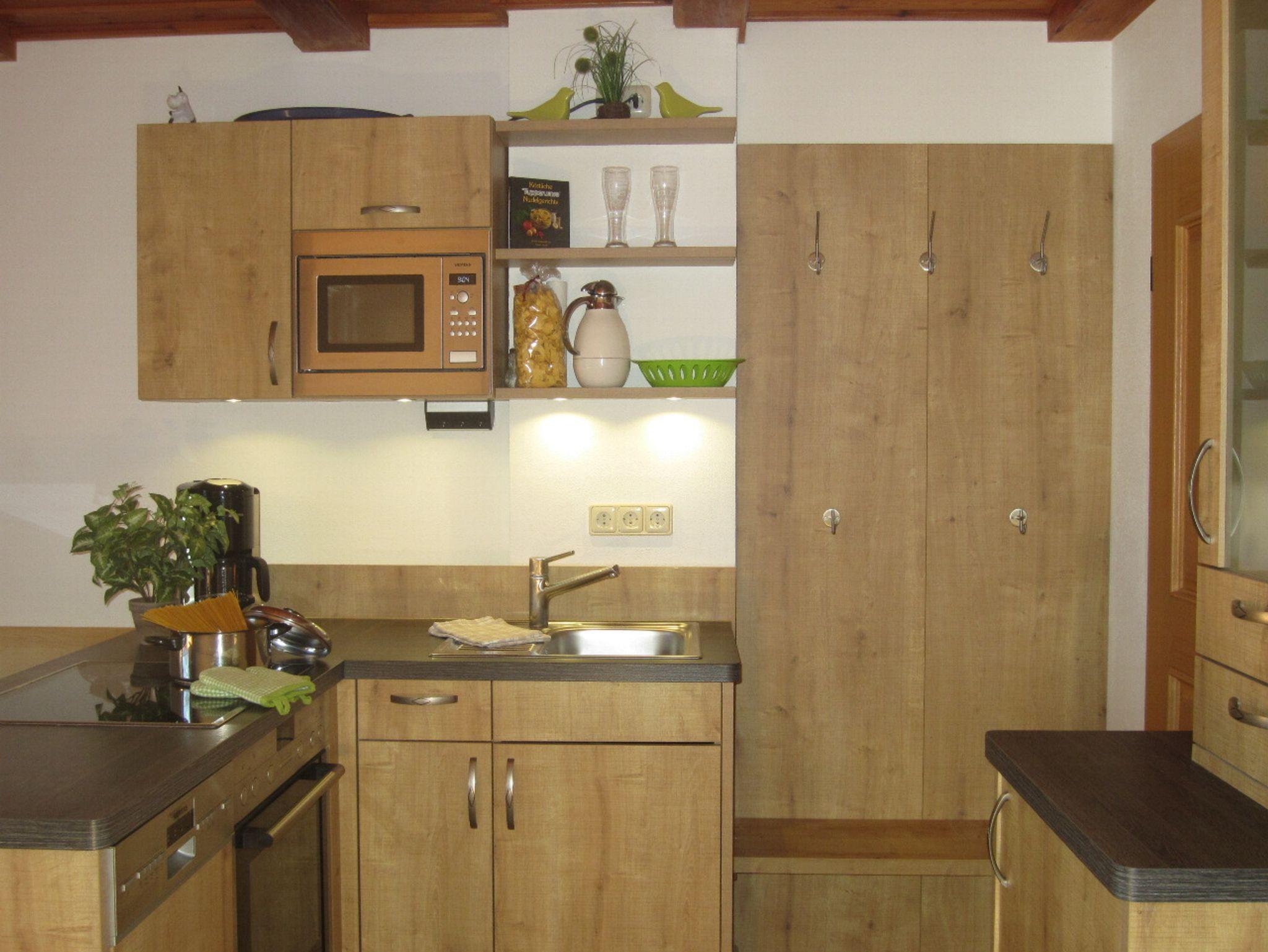 In der Wohnküche ist eine Essecke, eine Couch und die Küche mit Spülmaschine, Herd, Backofen, Mikrowelle, Kühlschrank, Kaffeemaschine, Wasserkocher, Toaster, Erstausstattung mit Spültuch, Tabs und Mülltüten. Außerdem steht hier auch der Fernseher und eine Stereoanlage. Im kleinen Bad ist eine ebenerdige Dusche, Waschbecken und WC, Handtuchtrockner, Handtücher, ein kleiner Schminkspiegel und ein Föhn. Die zwei Schlafzimmer haben einen herrlichen Ausblick auf die Berge schon beim Aufwachen.