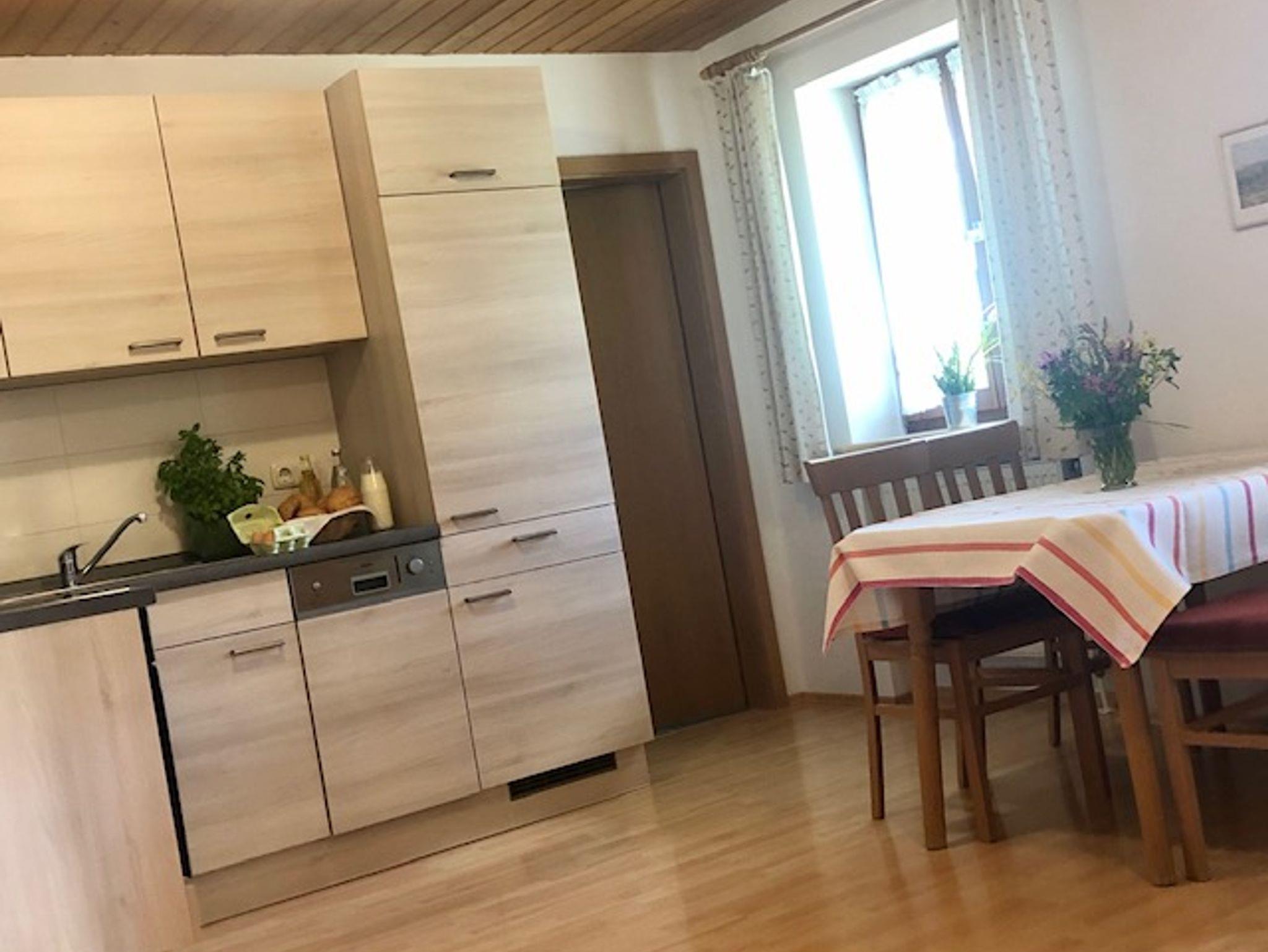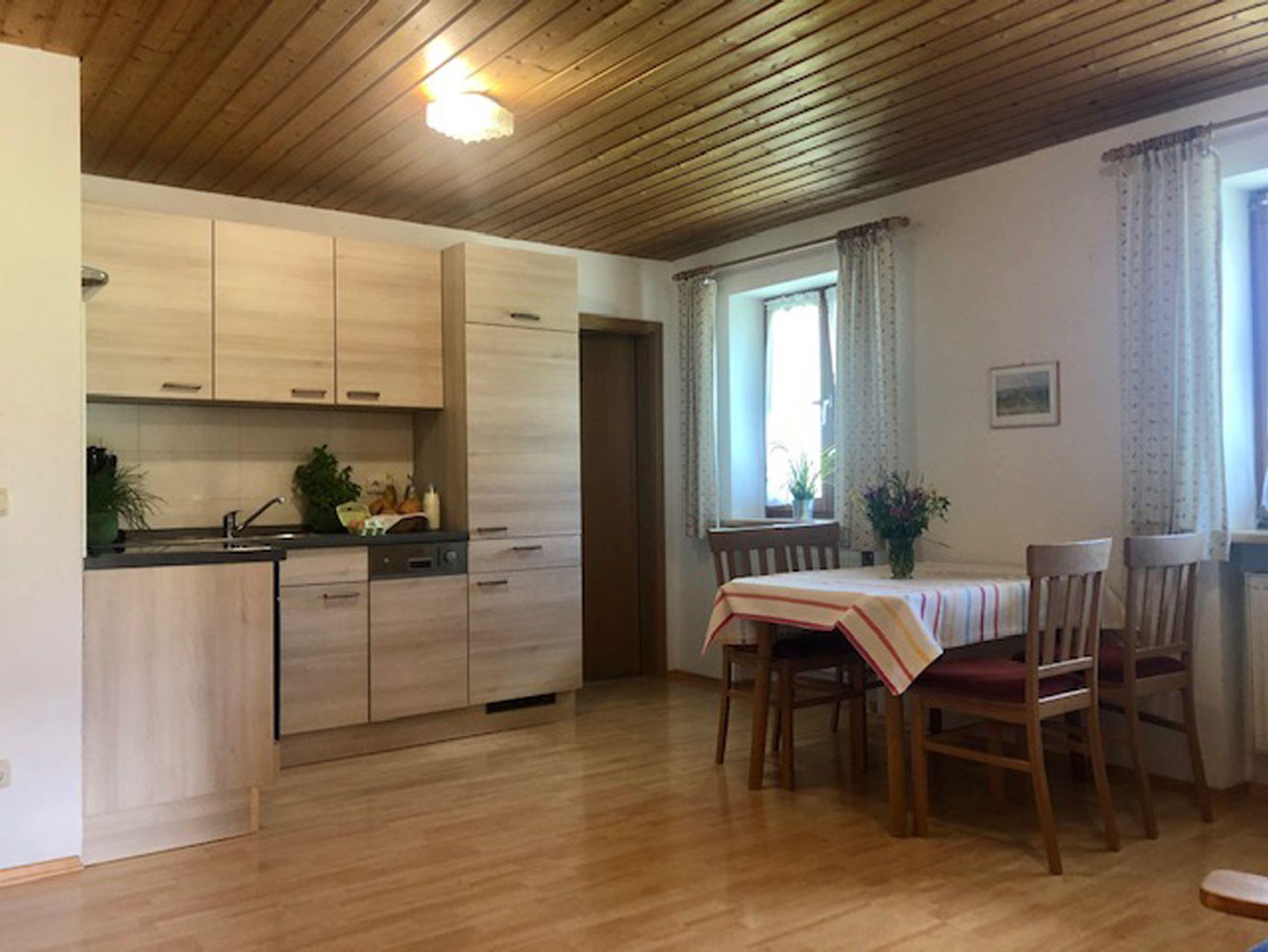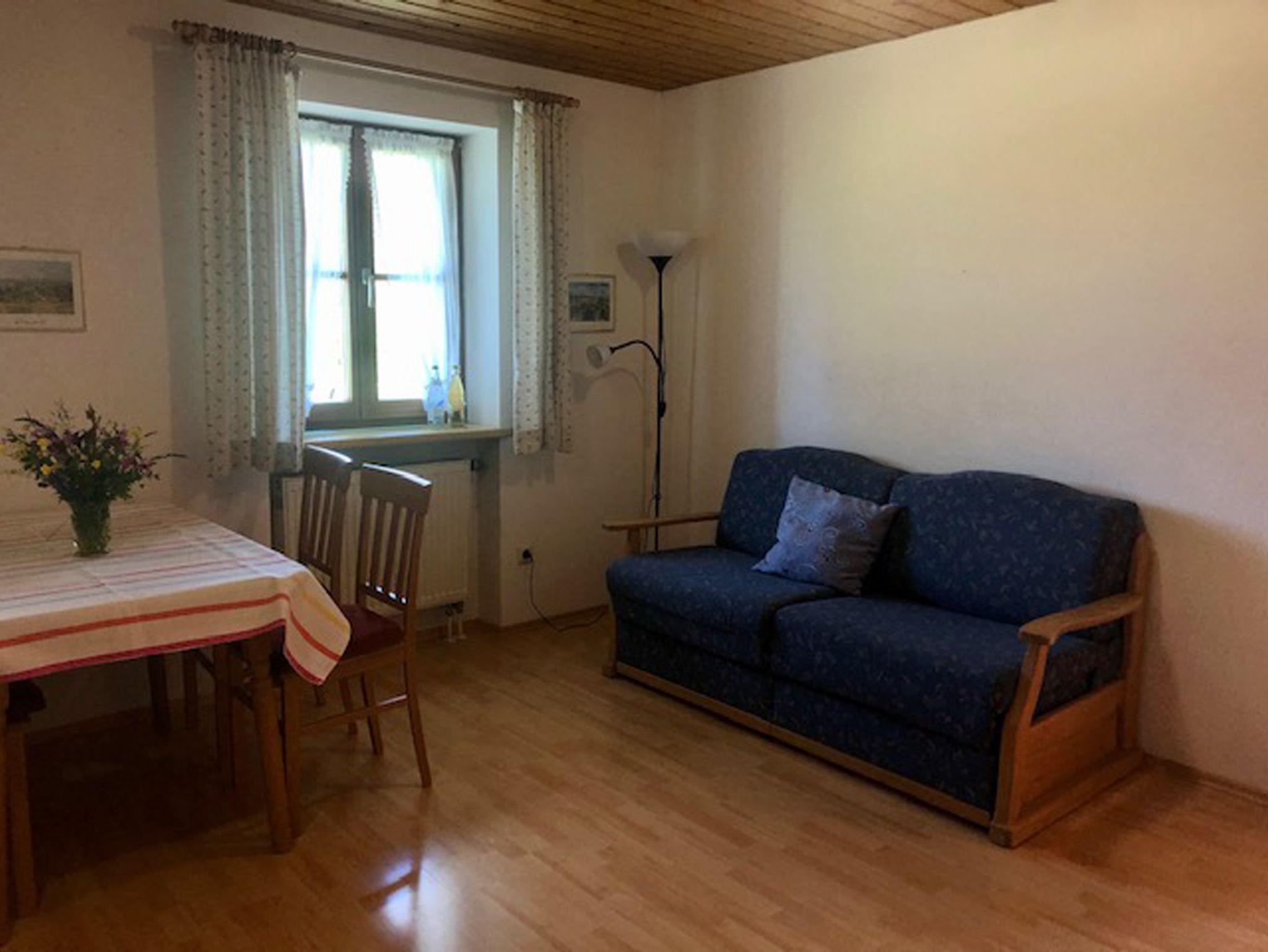 Die gemütlich eingerichtete Ferienwohnung 42 m² für 1 bis 4 Personen im Obergeschoss besteht aus Wohnküche, Schlafzimmer mit Doppelbett, (Wohn- und Aufenthaltsraum mit Schlafmöglichkeit), Dusche/WC, Kabel-TV, Radio, Münzwaschmaschine im Keller, Herrlicher Blick vom Balkon auf die schönen Wiesen und das Voralpenland. Hunde willkommen.