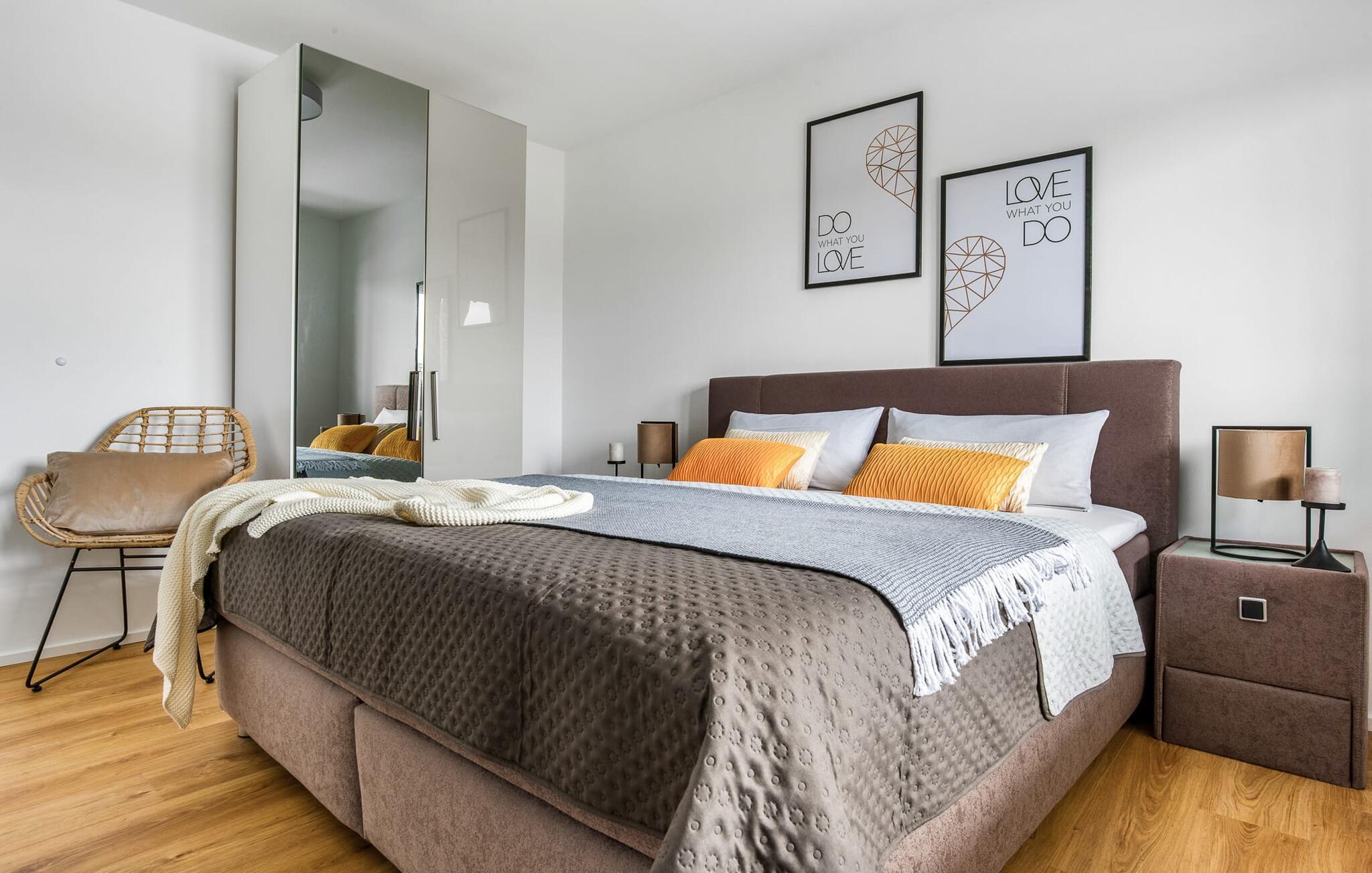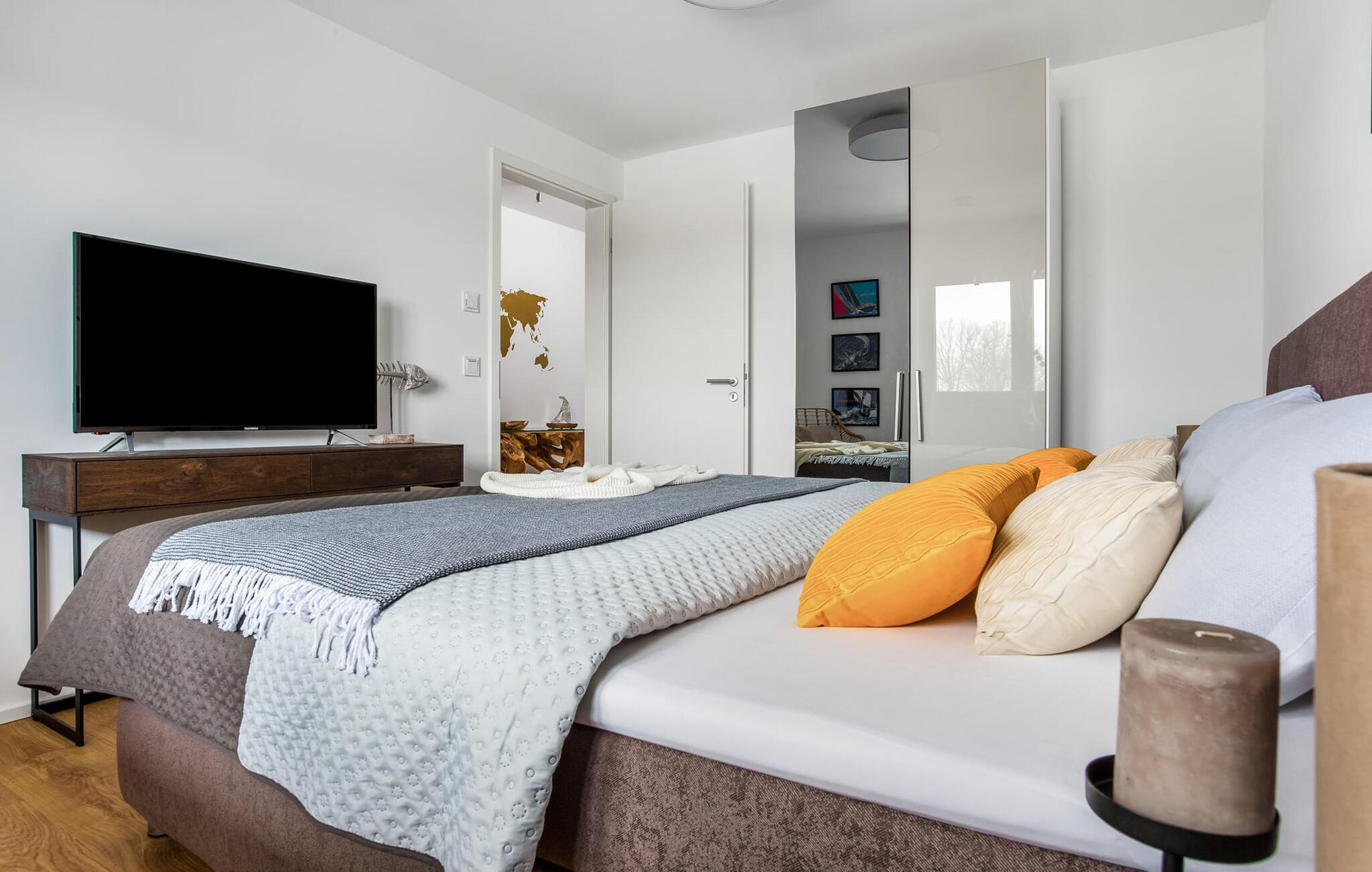 Im Schlafzimmer garantiert ein Doppelboxspringbett für erholsamen Schlaf und ein Fernseher sorgt für alternative Unterhaltung in Form von Streaming-Anbietern mit eigenen Zugängen wie Netflix oder Amazon Prime.