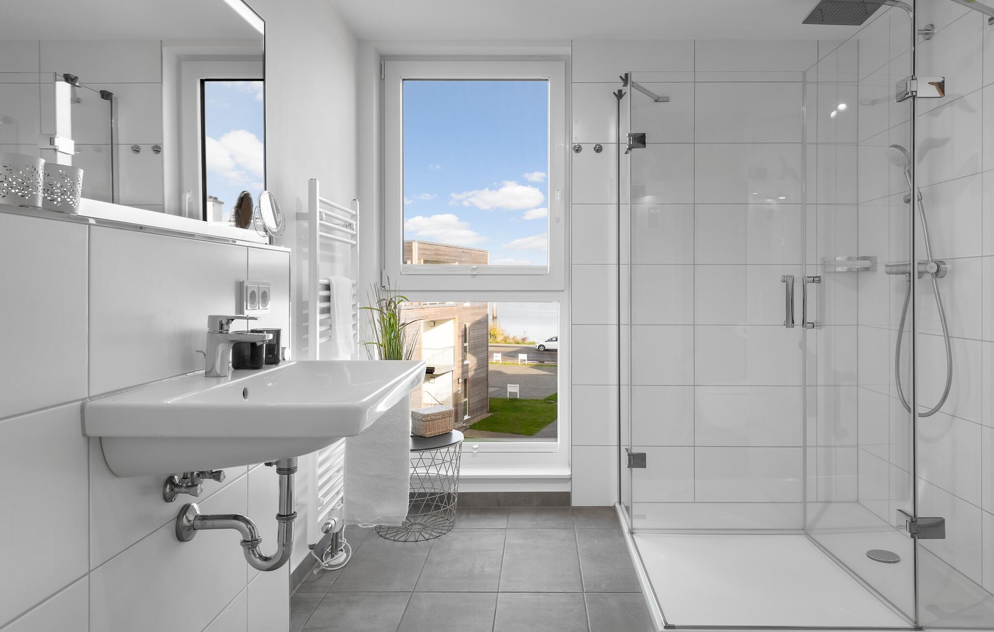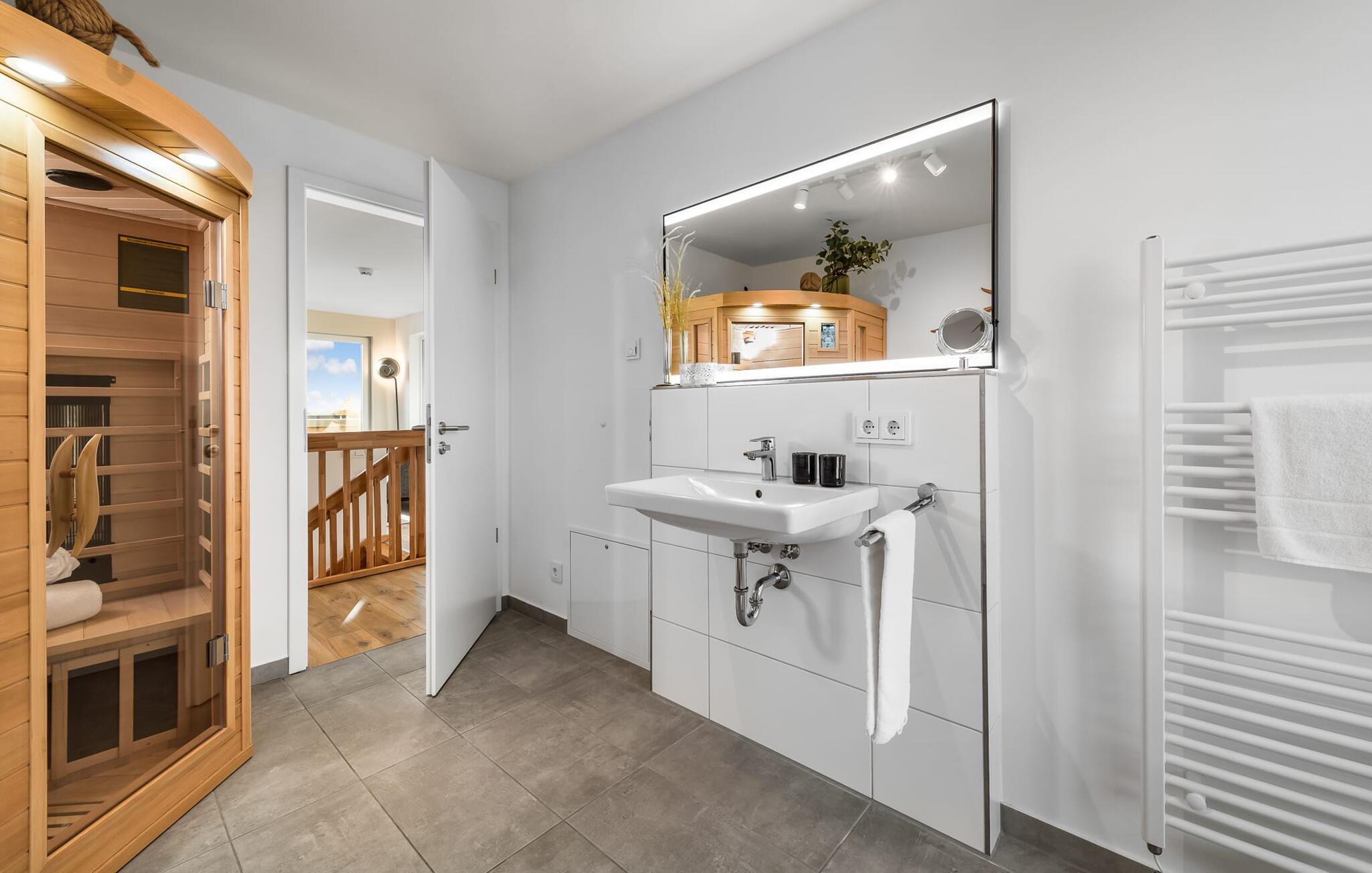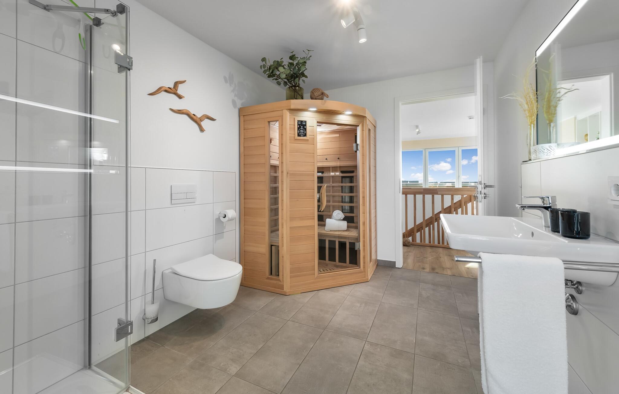 Ein zweites Vollbad mit Wellness Charakter und großzügiger, bodengleicher Panorama Dusche und Infrarot-Sauna rundet das Komplettpaket für einen erholsamen Urlaub ideal ab.
