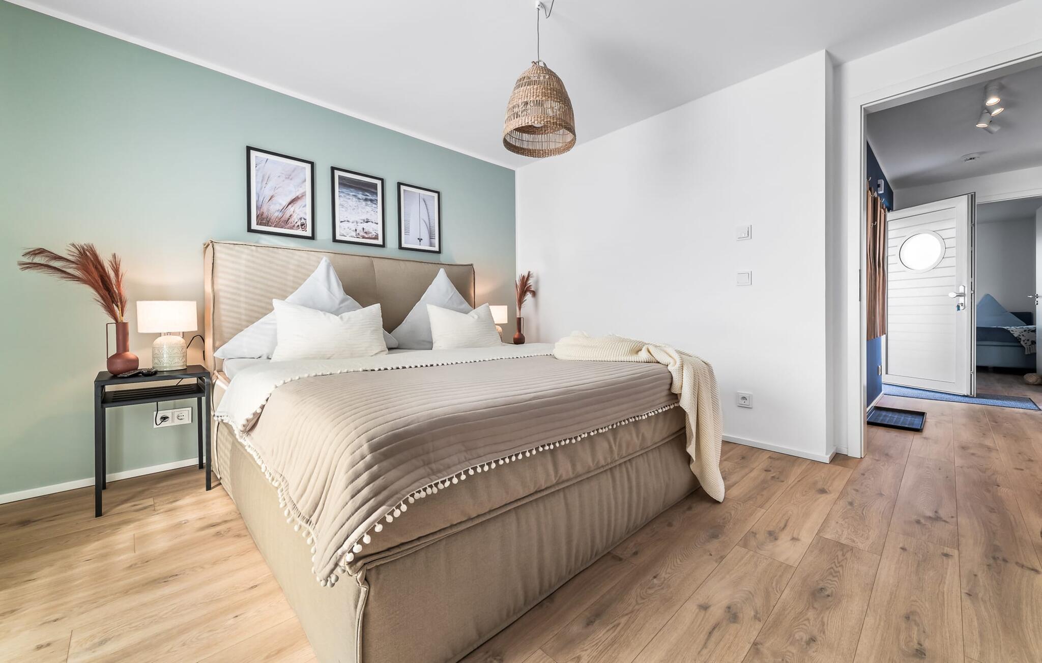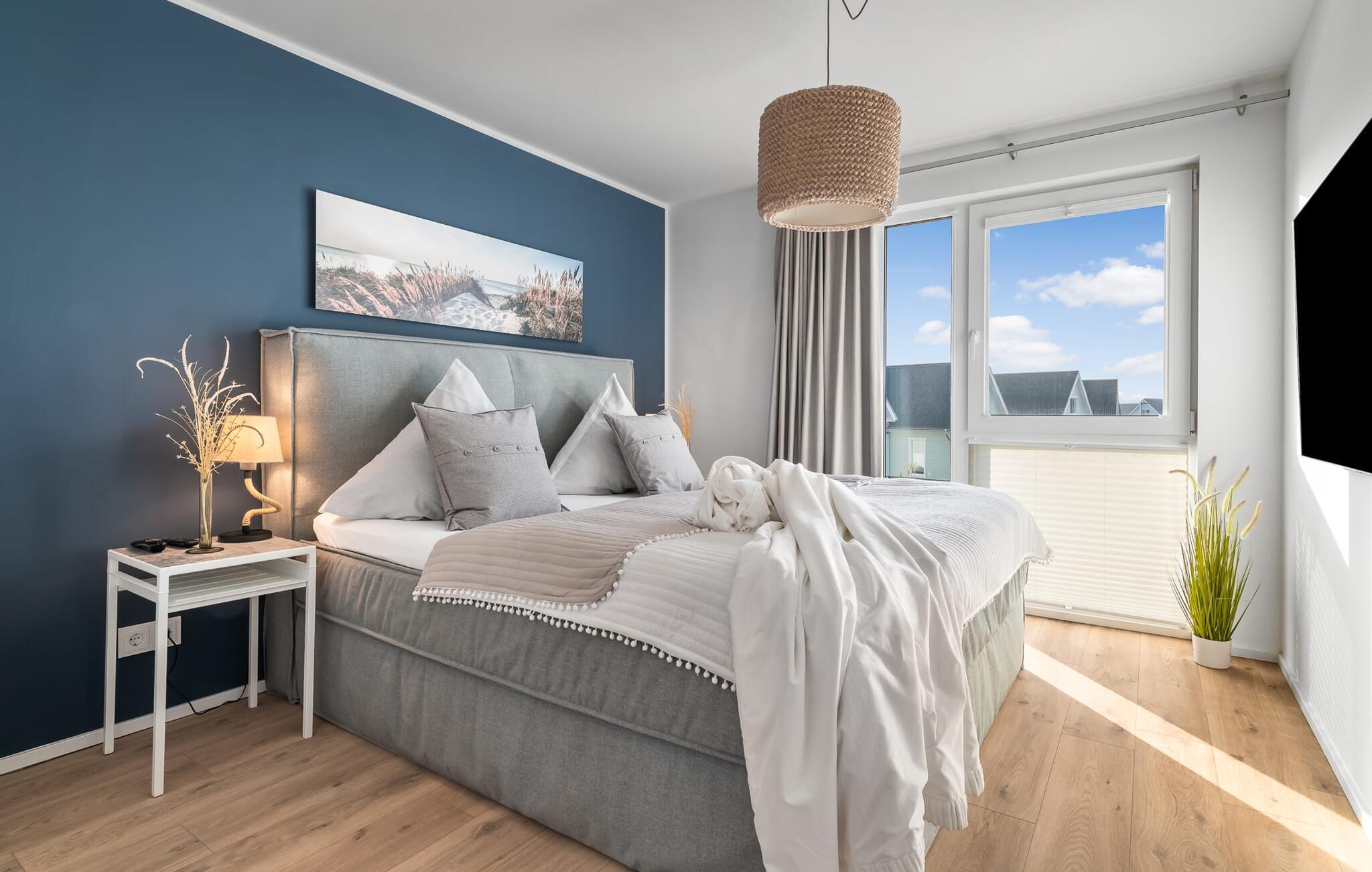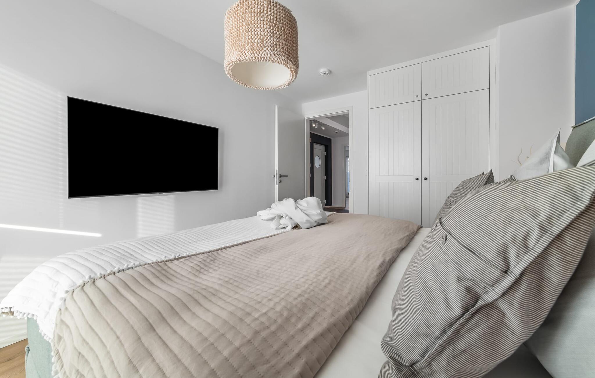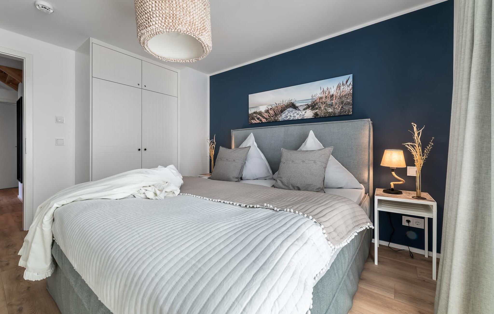 PIER 18 sorgt für Urlaubsfeeling! Die helle und freundliche Einrichtung sorgt für entspannte Stimmung. In der ersten Etage befinden sich die drei Schlafzimmer der Wohnung mit insgesamt zwei Doppel-Boxspringbetten und zwei Einzel-Boxspringbetten. Egal für welches Schlafzimmer ihr euch entscheidet, erholsamer Schlaf ist euch sicher. Die Schlafzimmer sind jeweils mit einem OLED TV zur Unterhaltung ausgestattet.