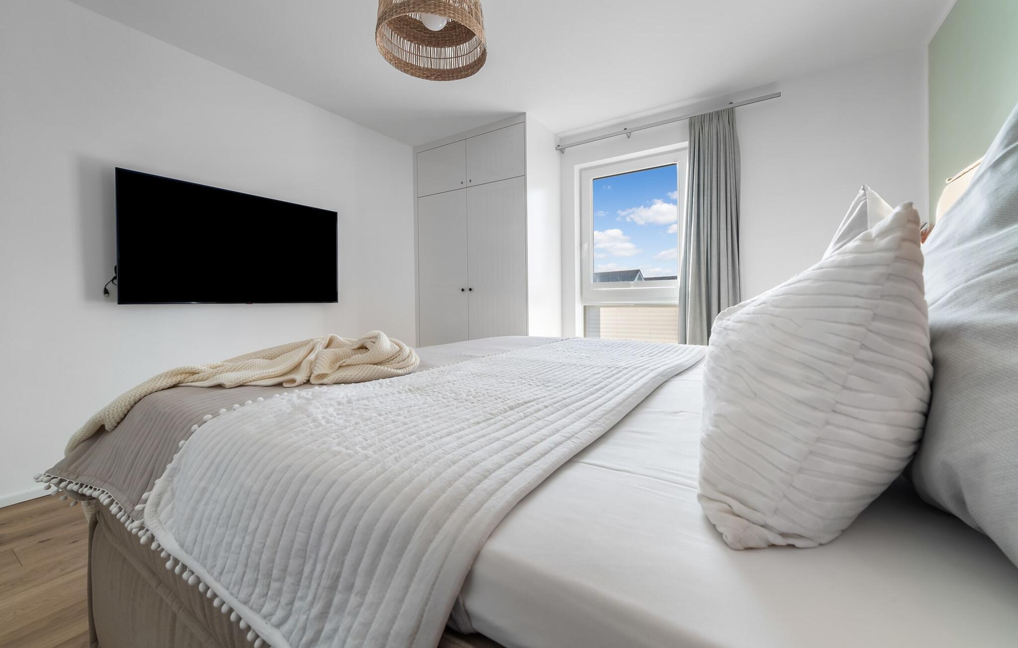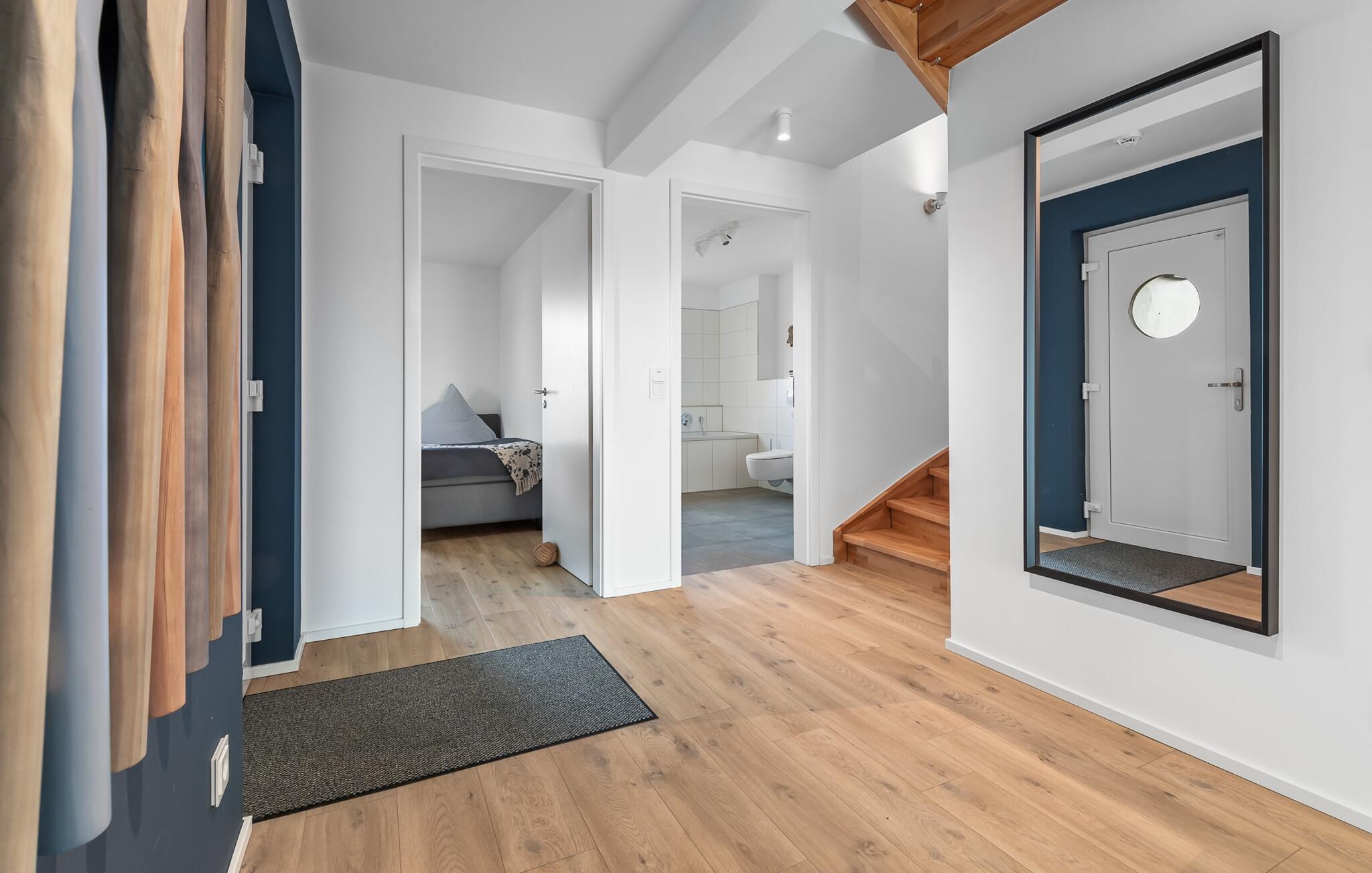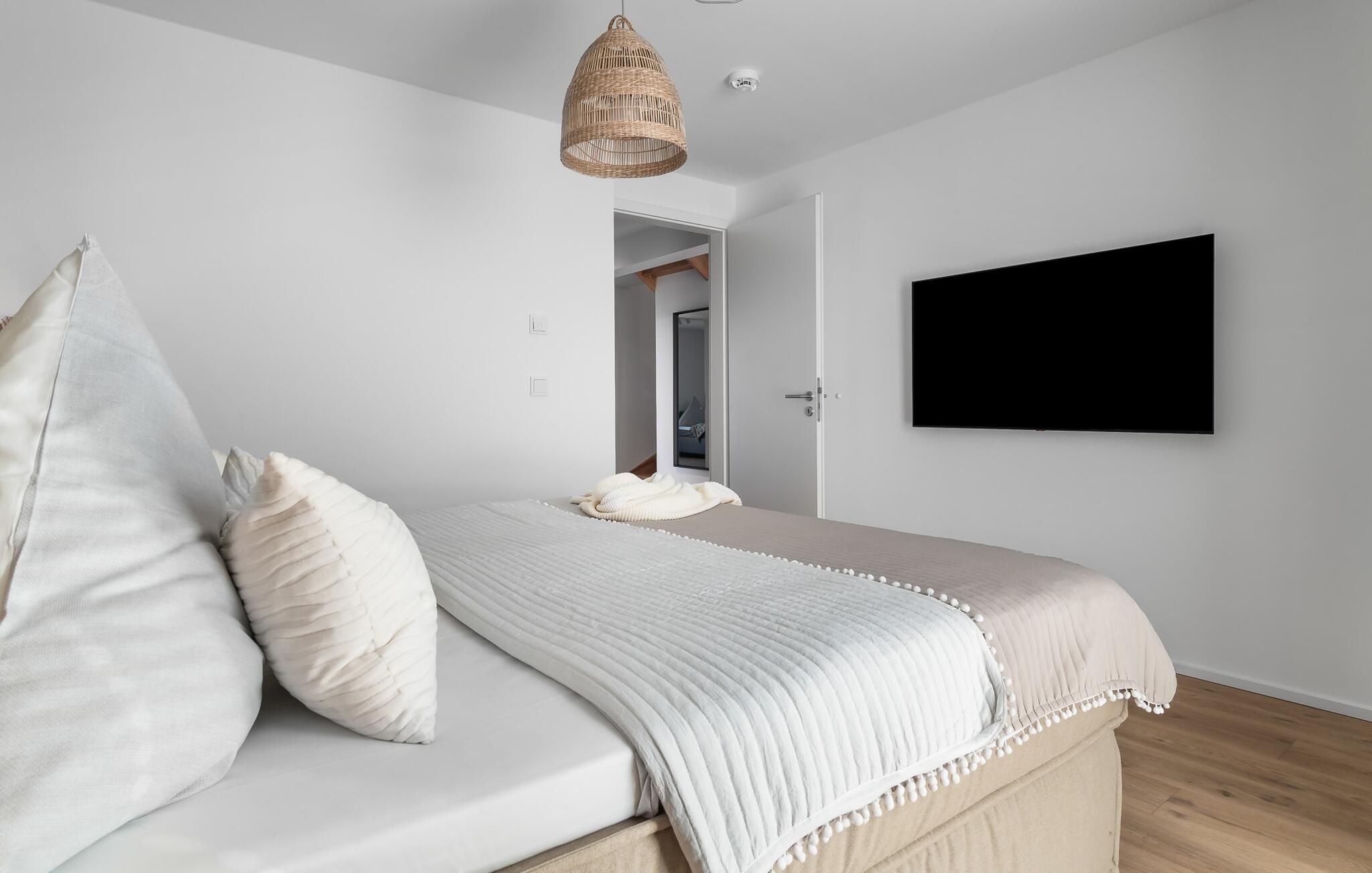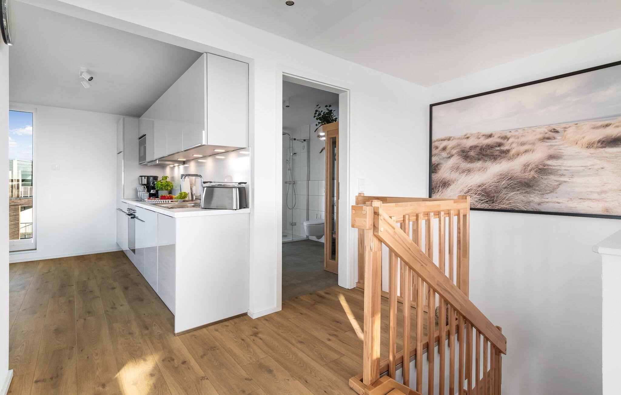 PIER 18 sorgt für Urlaubsfeeling! Die helle und freundliche Einrichtung sorgt für entspannte Stimmung. In der ersten Etage befinden sich die drei Schlafzimmer der Wohnung mit insgesamt zwei Doppel-Boxspringbetten und zwei Einzel-Boxspringbetten. Egal für welches Schlafzimmer ihr euch entscheidet, erholsamer Schlaf ist euch sicher. Die Schlafzimmer sind jeweils mit einem OLED TV zur Unterhaltung ausgestattet.