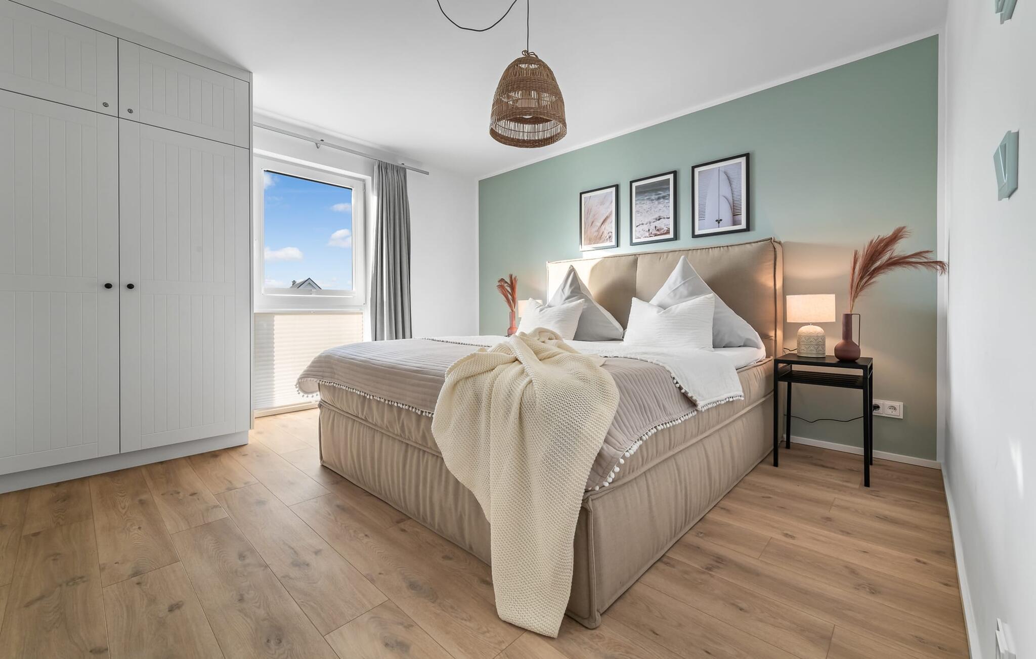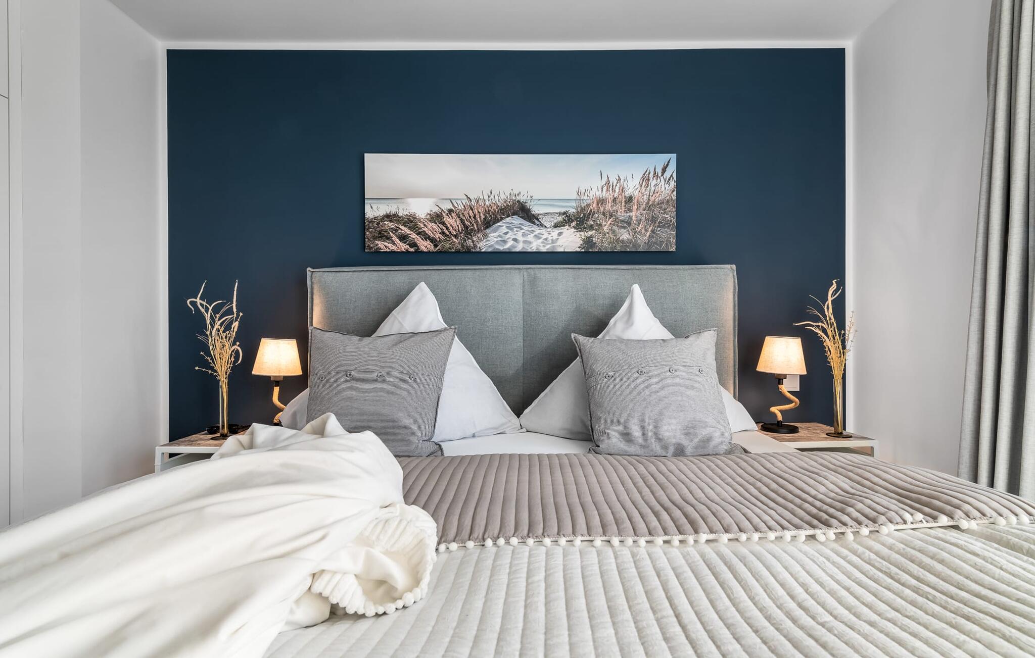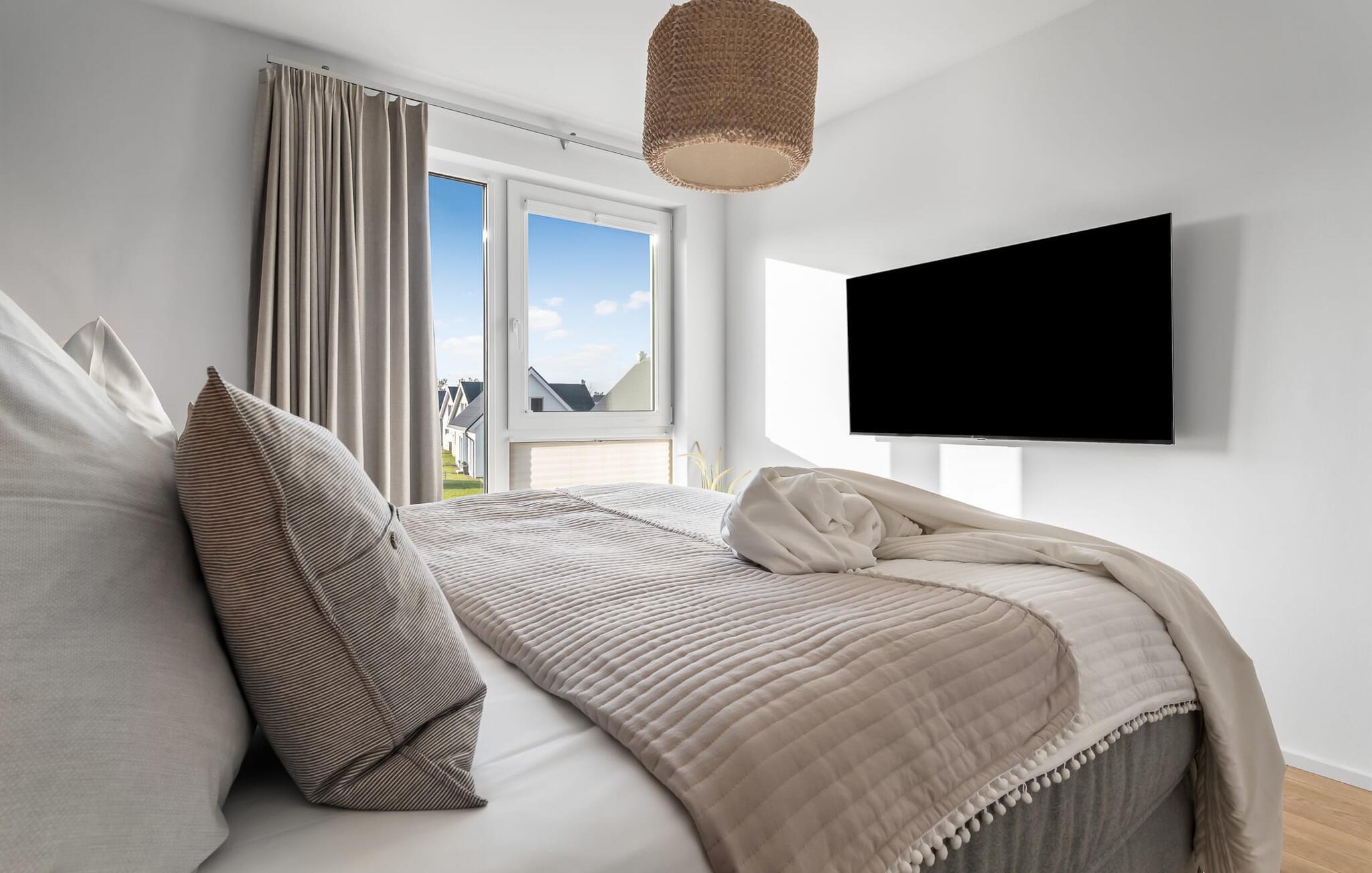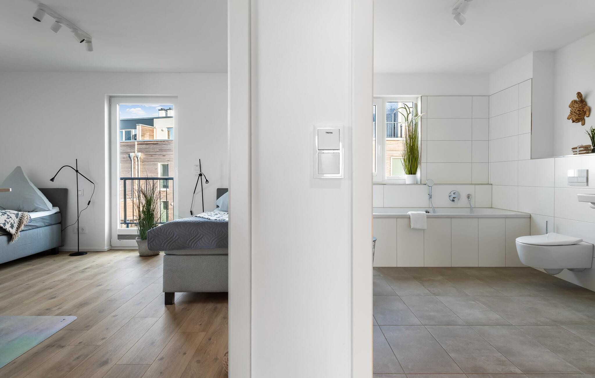 PIER 18 sorgt für Urlaubsfeeling! Die helle und freundliche Einrichtung sorgt für entspannte Stimmung. In der ersten Etage befinden sich die drei Schlafzimmer der Wohnung mit insgesamt zwei Doppel-Boxspringbetten und zwei Einzel-Boxspringbetten. Egal für welches Schlafzimmer ihr euch entscheidet, erholsamer Schlaf ist euch sicher. Die Schlafzimmer sind jeweils mit einem OLED TV zur Unterhaltung ausgestattet.