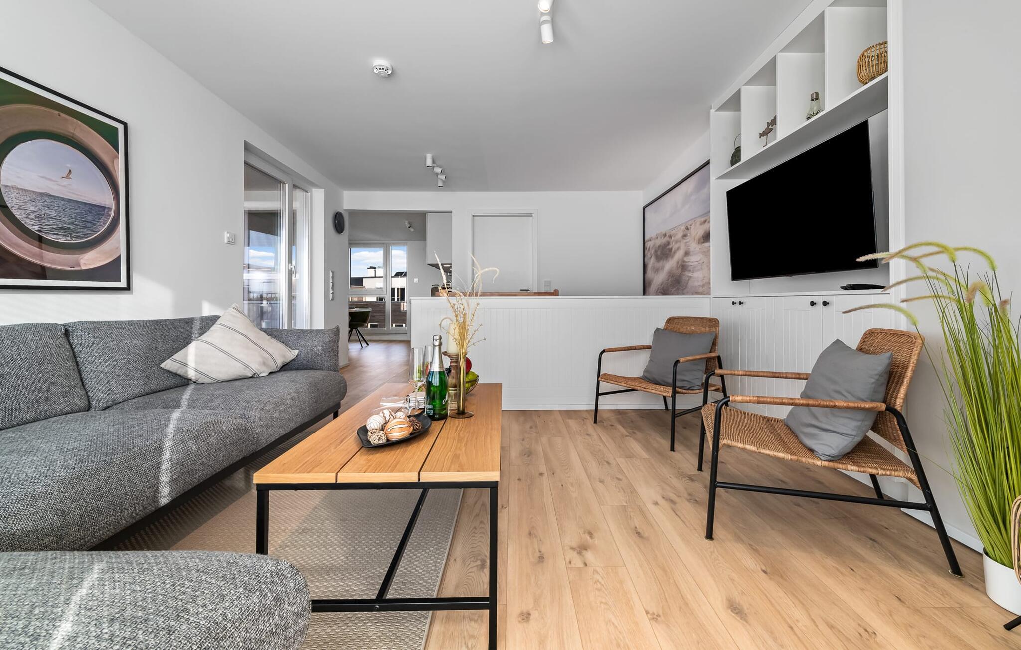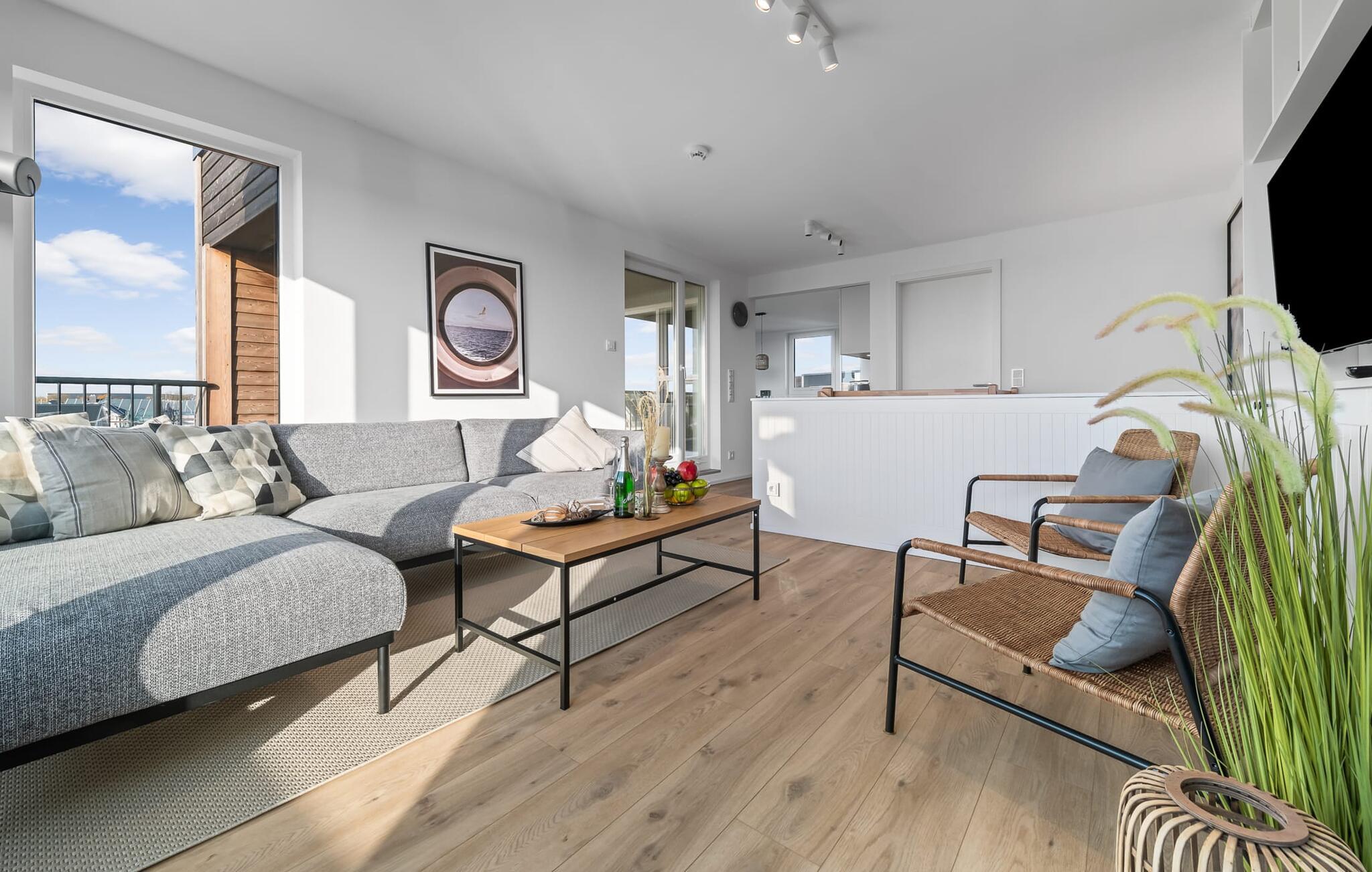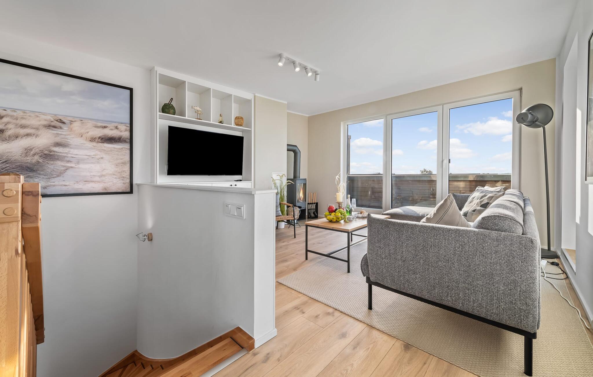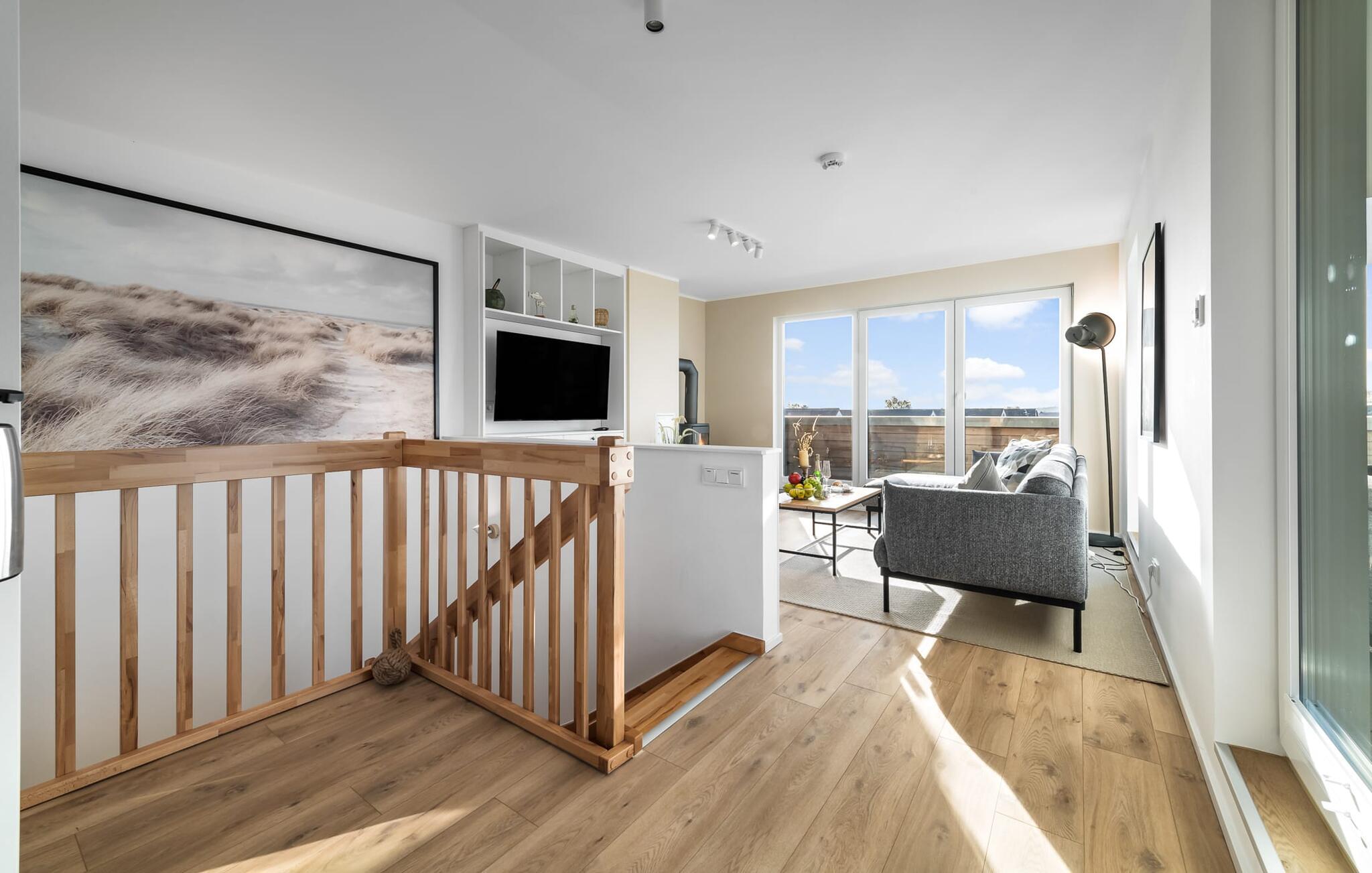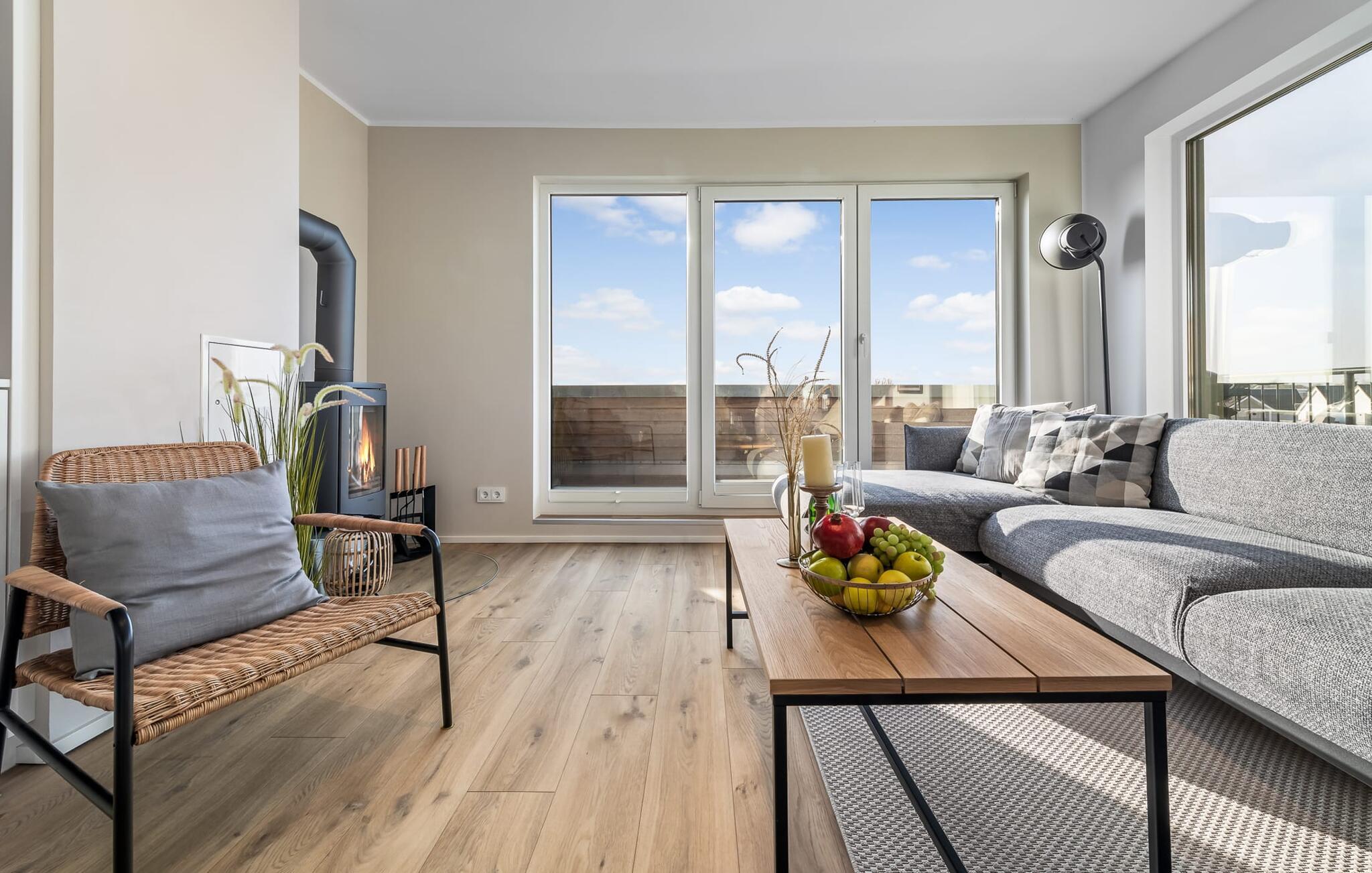 Großzügige Maisonette-Ferienwohnung PIER 18 im OstseeResort Olpenitz mit Terrasse, Kaminofen und Infrarotsauna für erholsamen Urlaub.