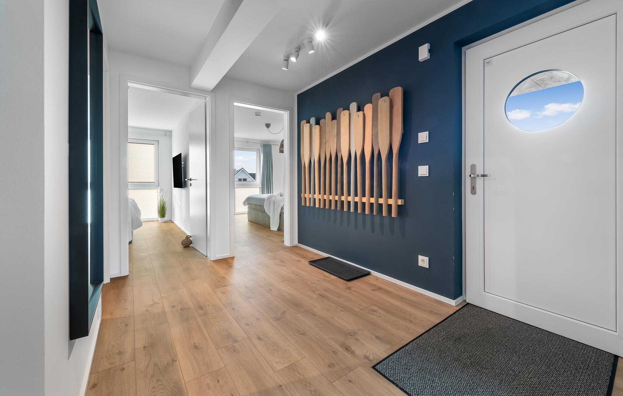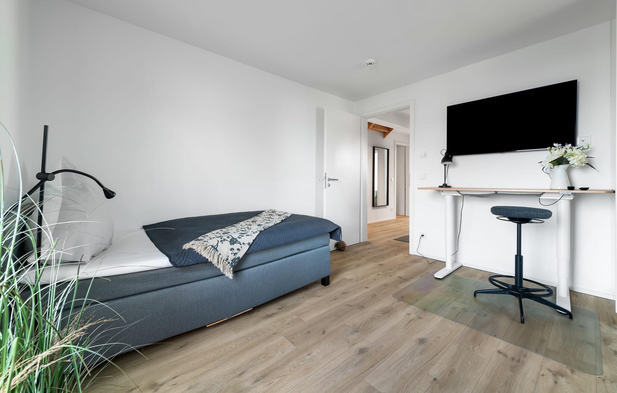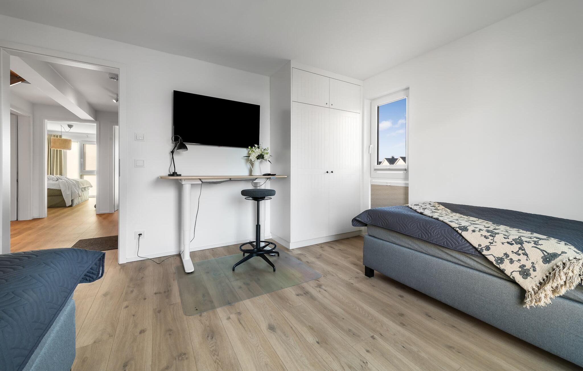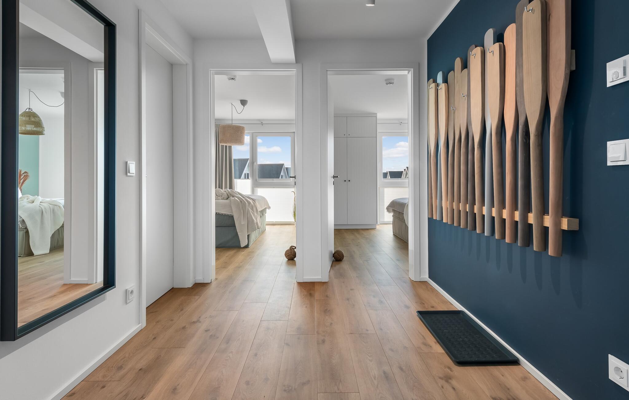 Die maßgefertigten Einbauschränke bieten genug Stauraum für alle Dinge die im Urlaub benötigt werden. Bewusst abgelegen vom Familienleben im Wohnbereich, bietet PIER 18 ebenfalls einen Homeoffice Arbeitsplatz in einem der Schlafzimmer. Dieser ist mit einem höhenverstellbaren Schreibtisch ausgestattet.