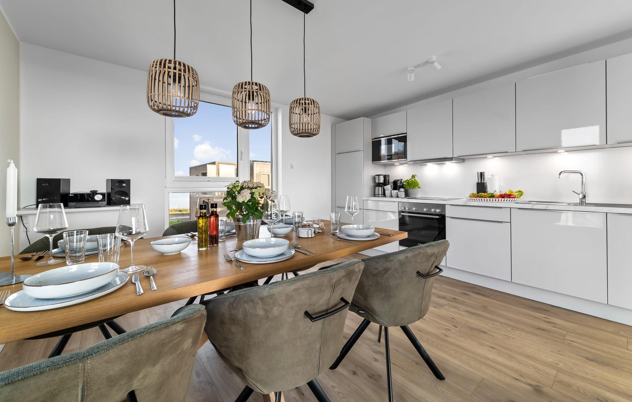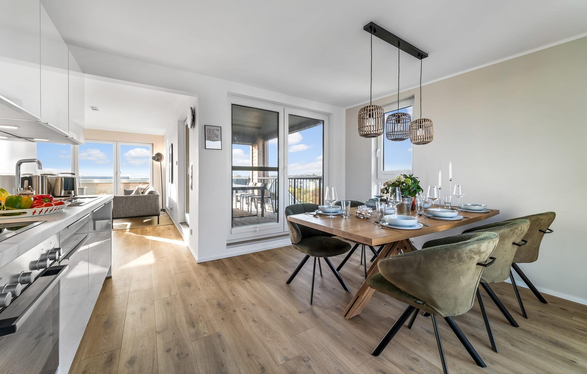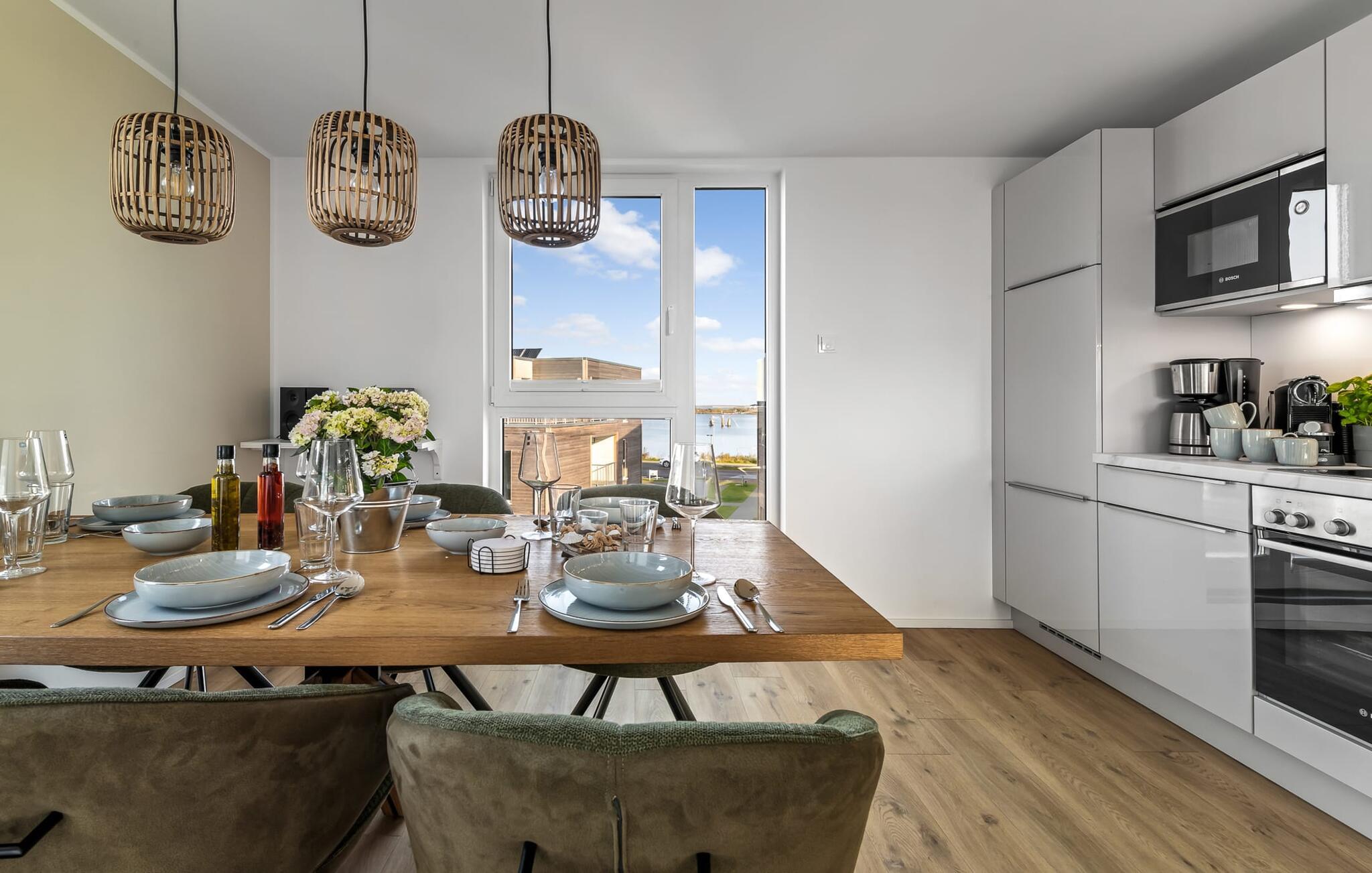 Die integrierte Küche ist hochwertig ausgestattet. Die große Terrasse mit Süd-West-Ausrichtung betretet ihr direkt vom Wohnbereich oder der Küche aus. Hier könnt ihr viele entspannte Stunden mit ganztägiger Sonne verbringen und traumhafte Sonnenuntergänge beobachten.