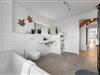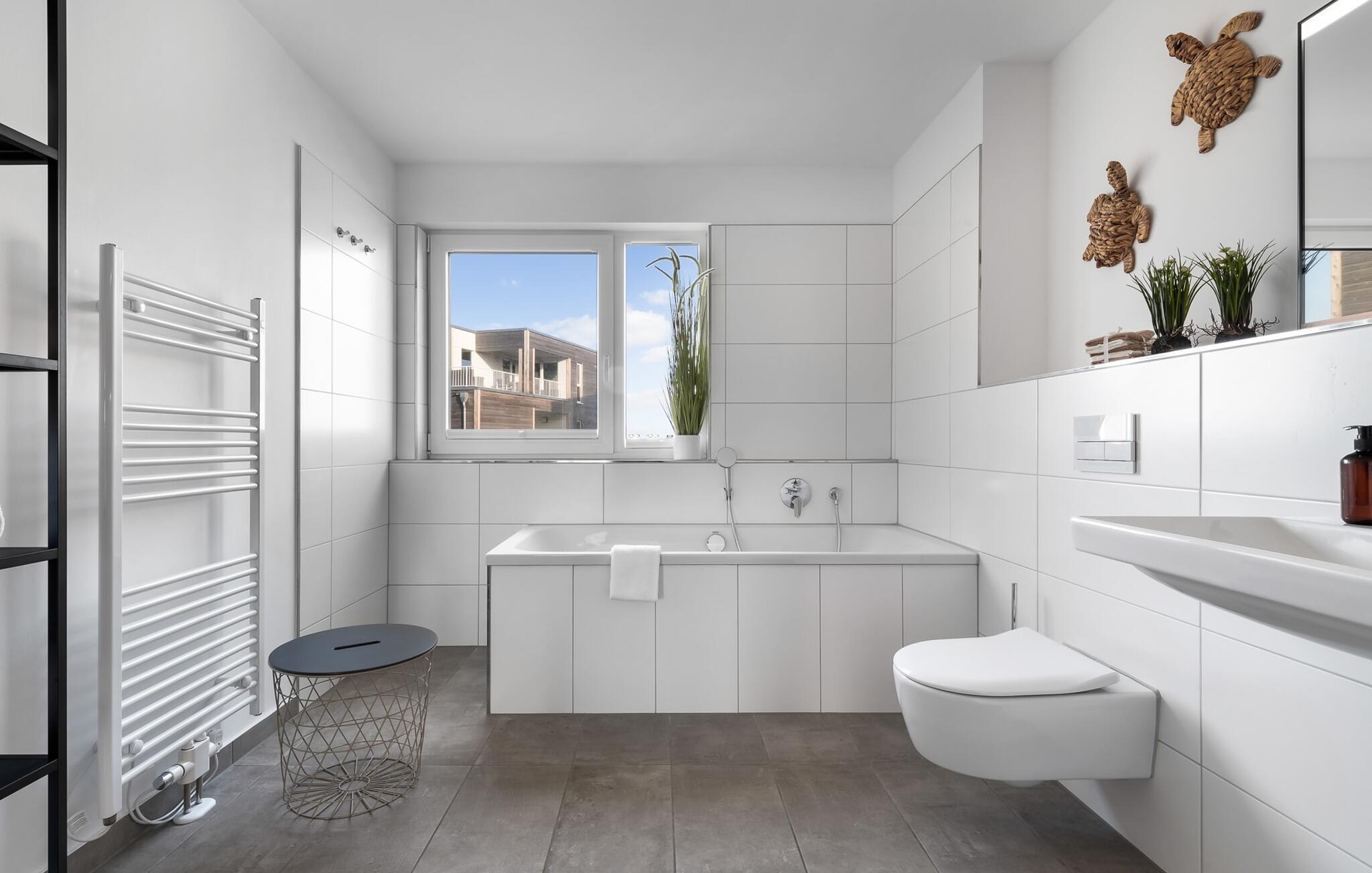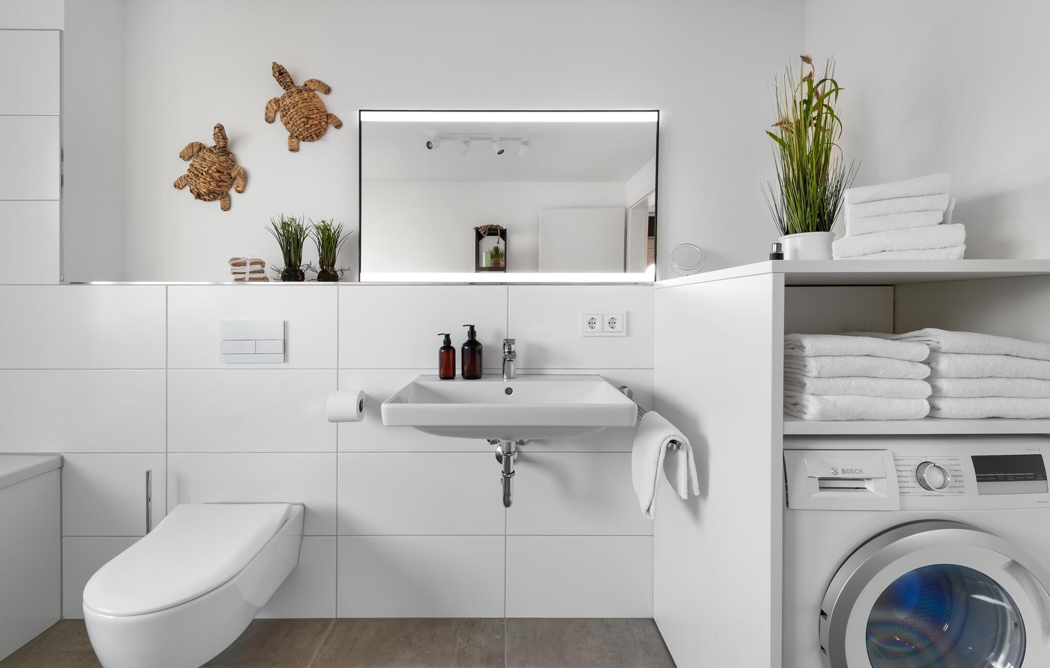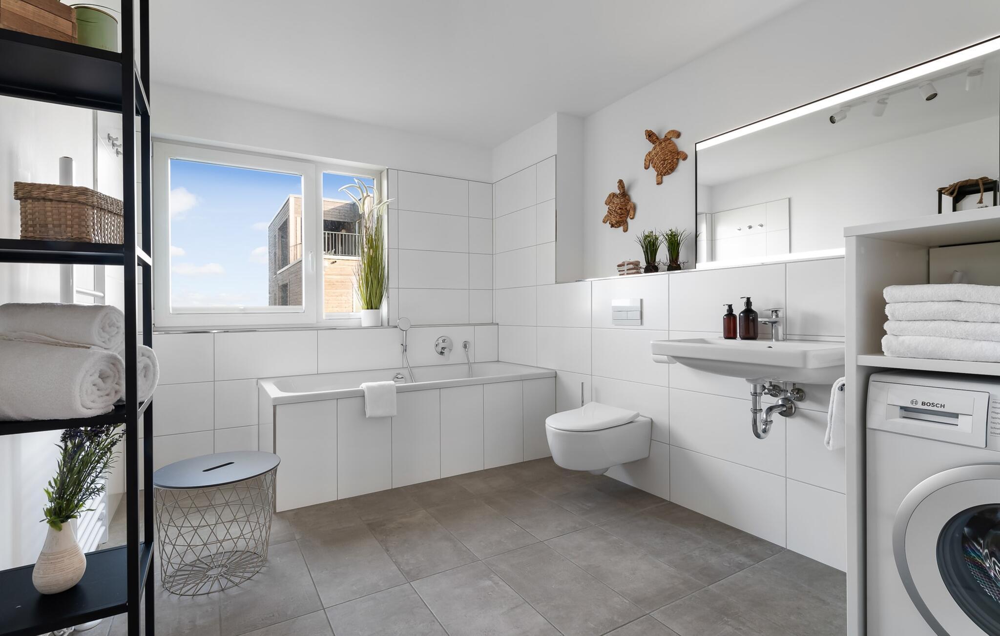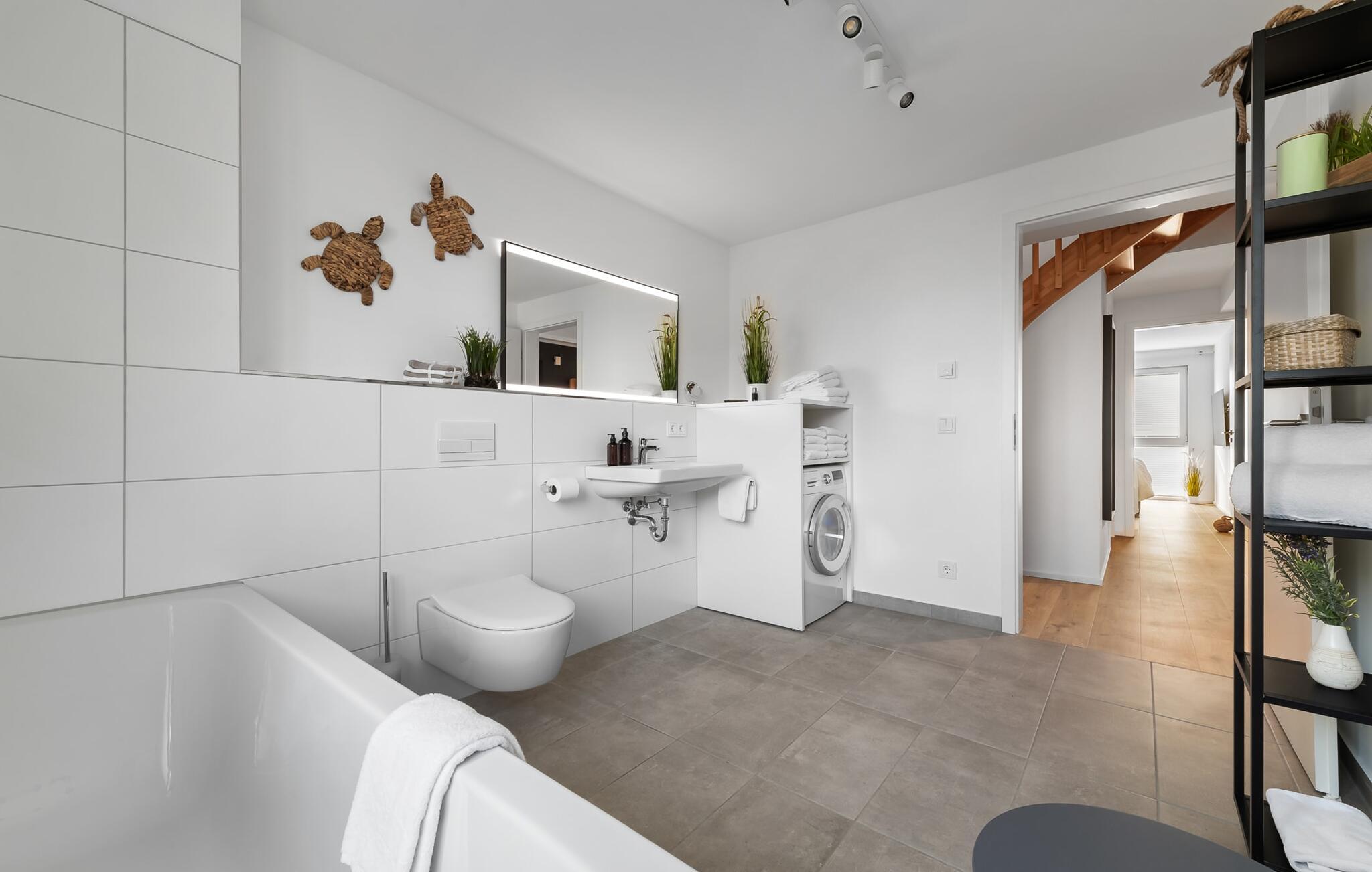 In der ersten Etage befindet sich neben den Schlafzimmern auch ein großzügiges Badezimmer inklusive Badewanne und Waschmaschine.