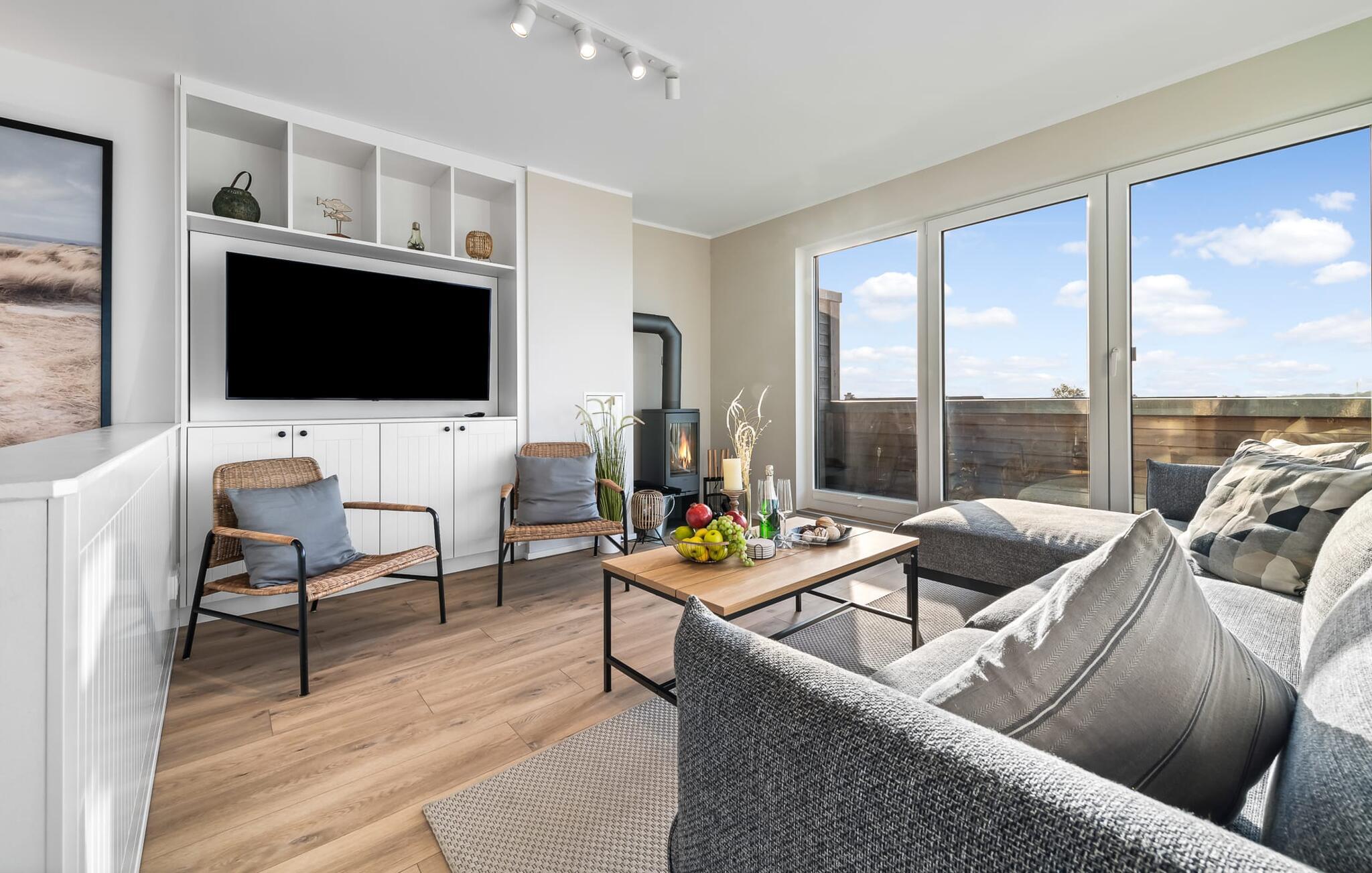 Unser Lieblingsplatz: nach einem Strandtag den Tag auf der großen Sofalandschaft vor dem Kamin ausklingen lassen.