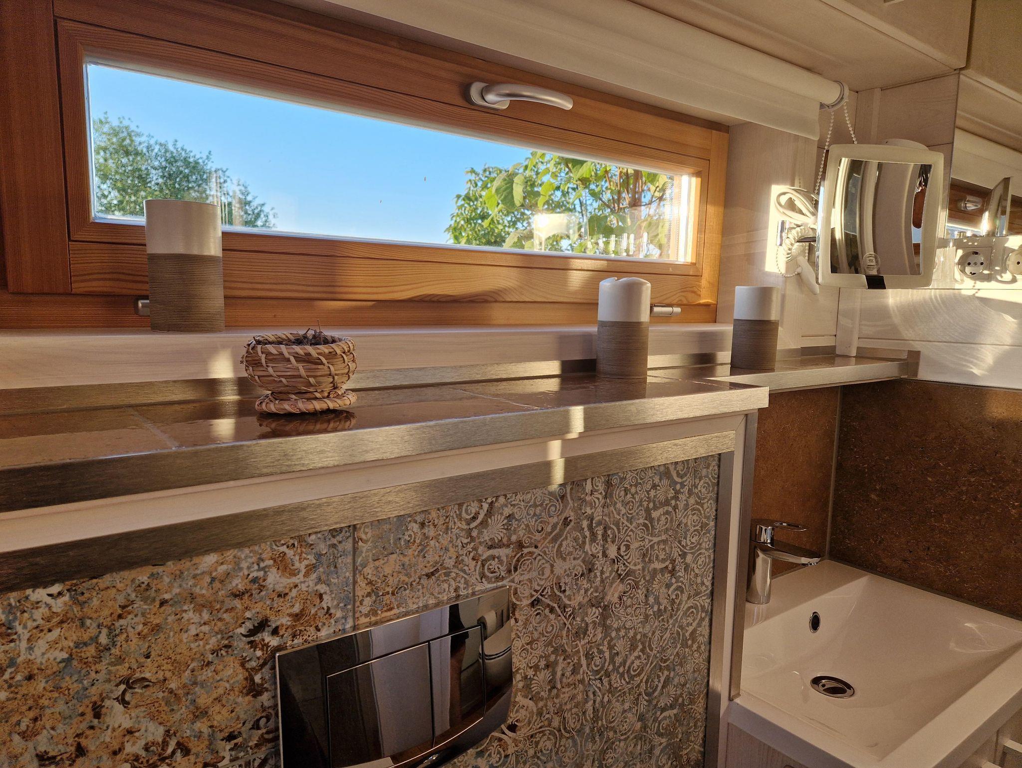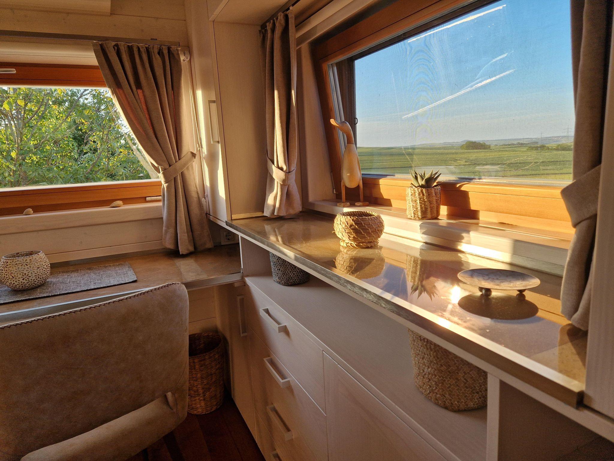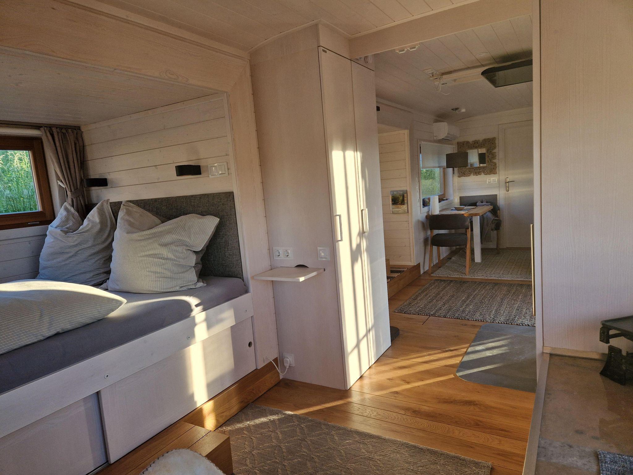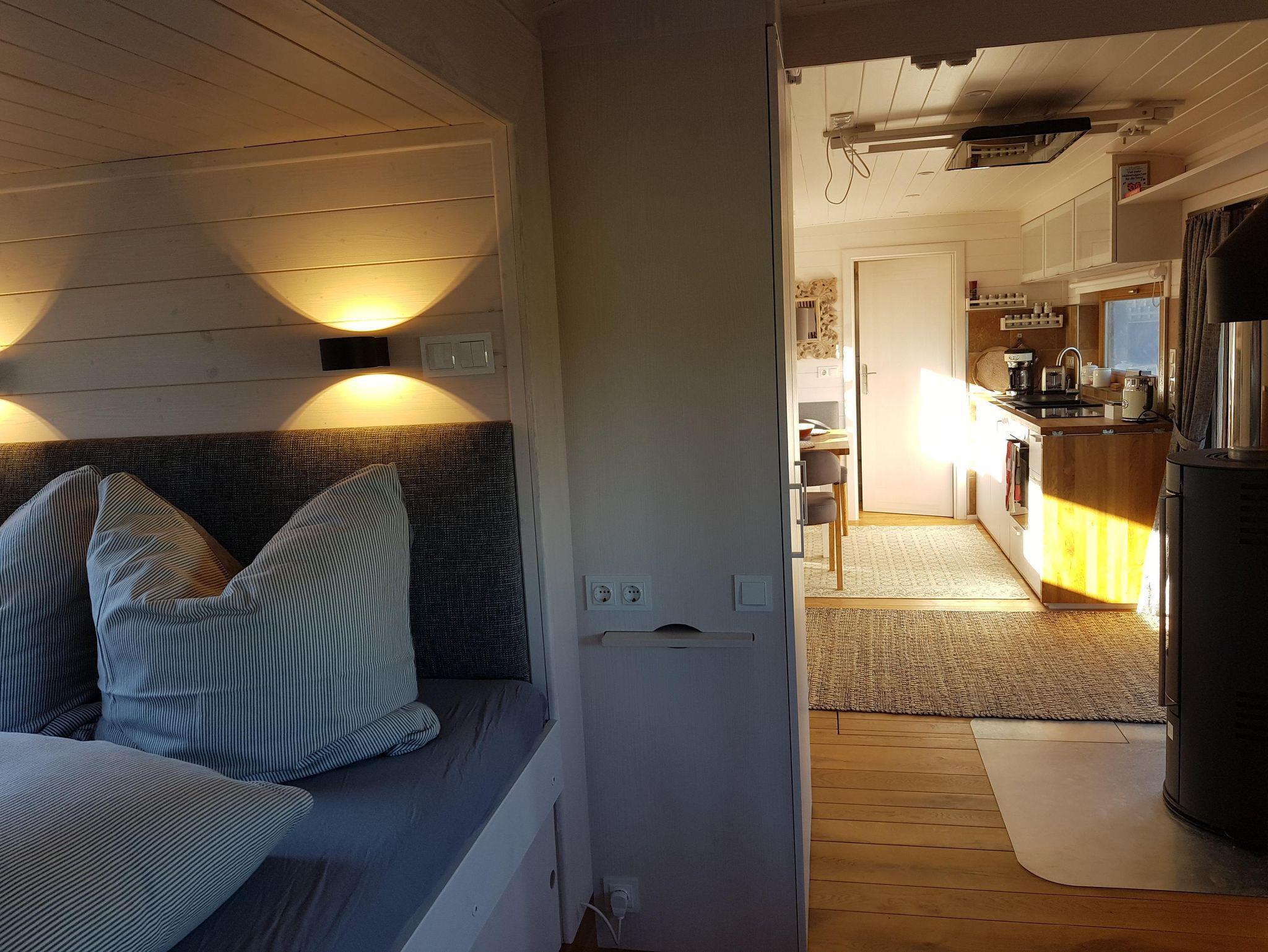 Schlafmöglichkeiten gibt es mehrere. Sowohl im gemütlichen Doppelbett in einer Nische, als auch auf dem ausklappbaren Sofa können Sie es sich mit bis zu vier Personen gemütlich machen. Der Schlafbereich mit dem Doppelbett lässt sich durch eine Schiebetür auch räumlich von dem Rest des Wagens trennen, und sorgt somit für etwas Privatsphäre.