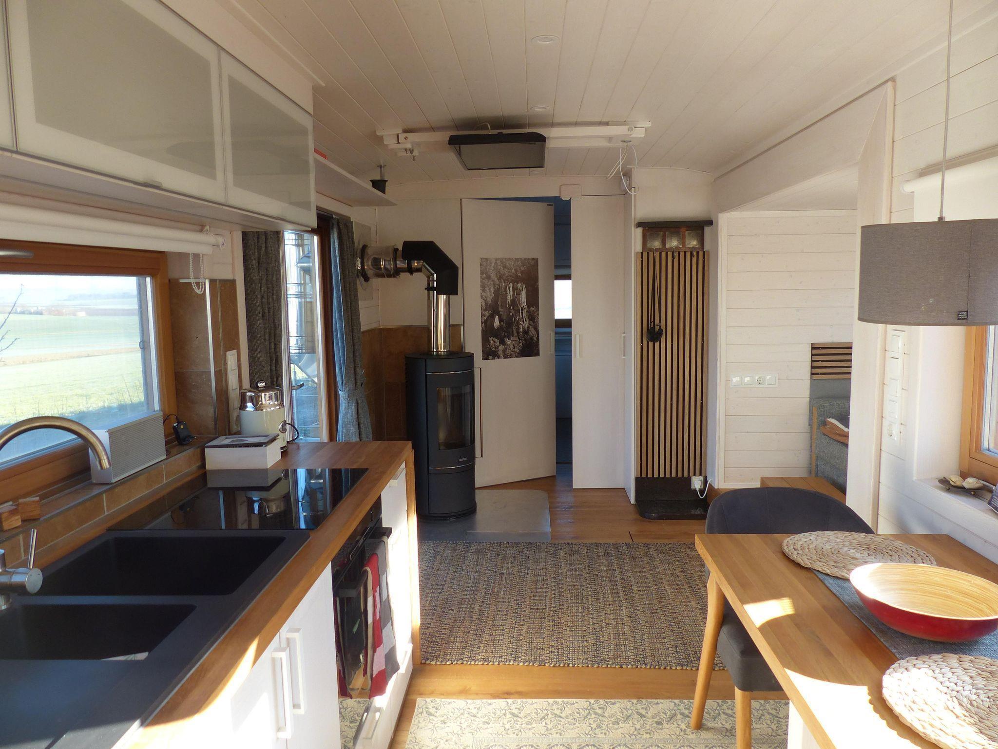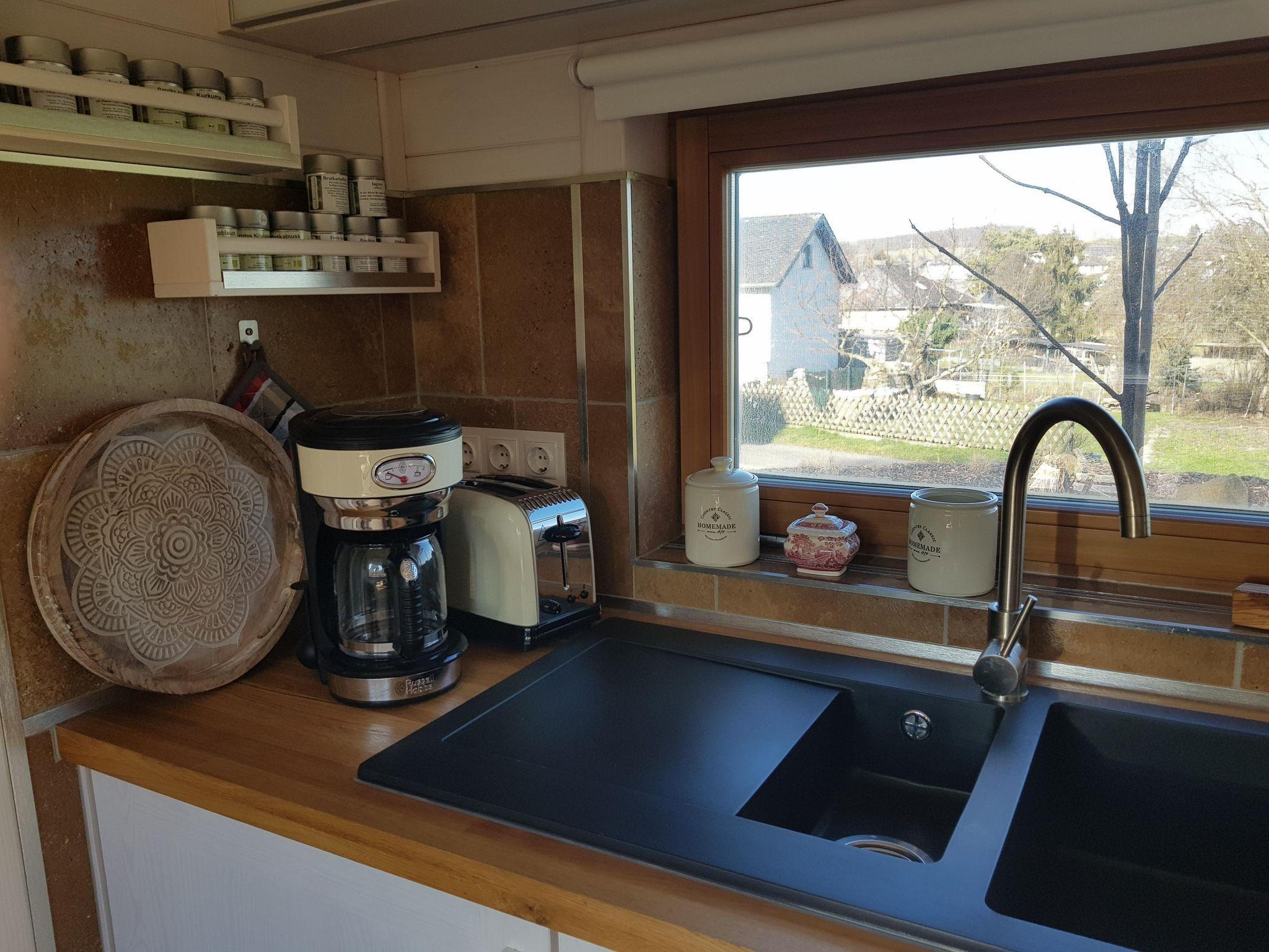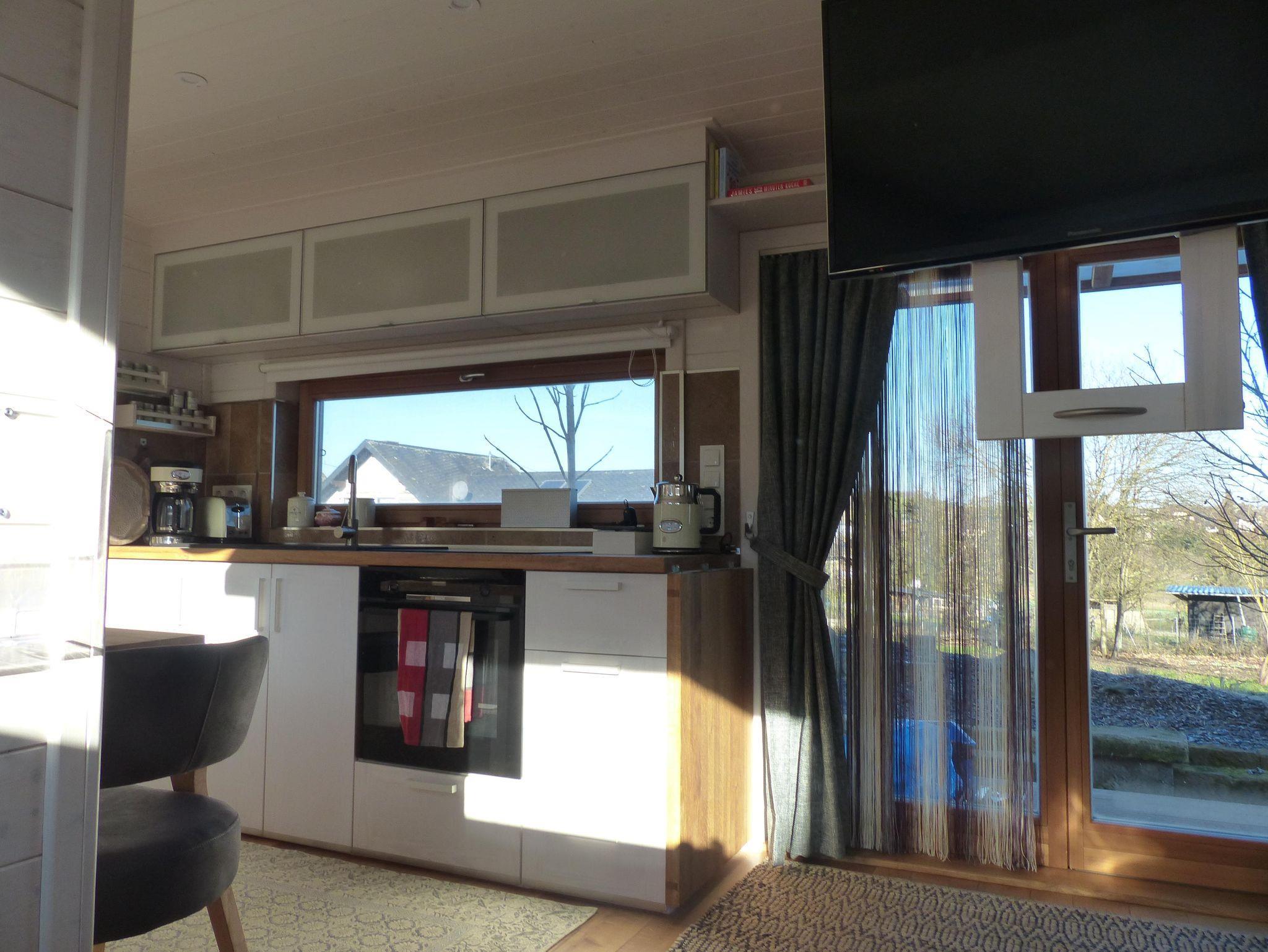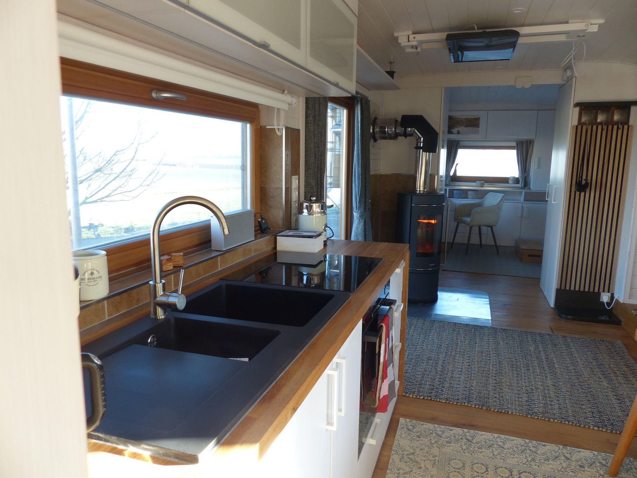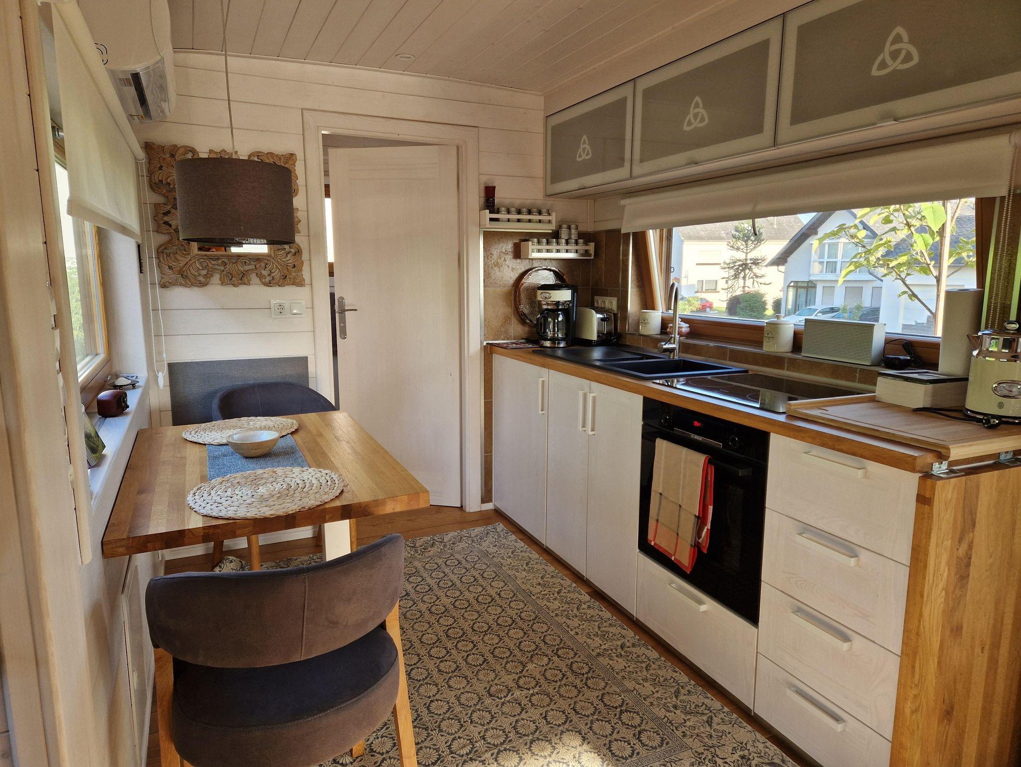 Der Wohlwagen bietet alles, was auch eine Ferienwohnung bietet. Backofen, Kochfeld, Kühlschrank, Kaffeemaschine, Wasserkocher, Geschirr, Besteck etc.