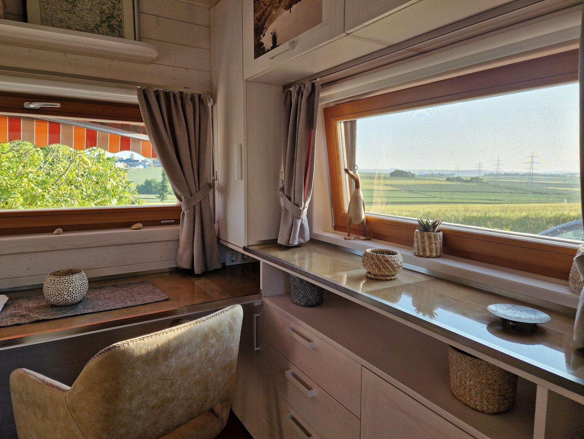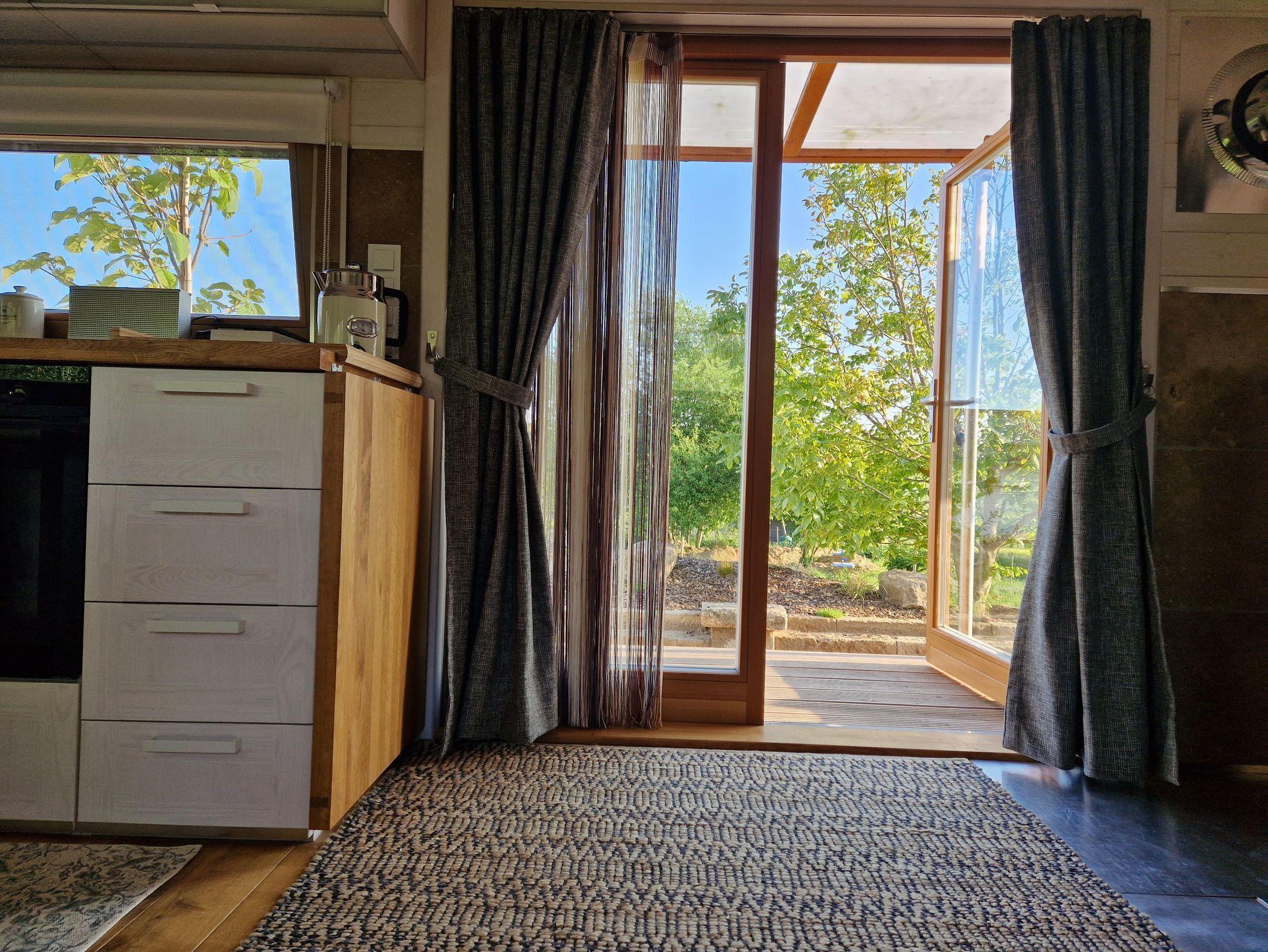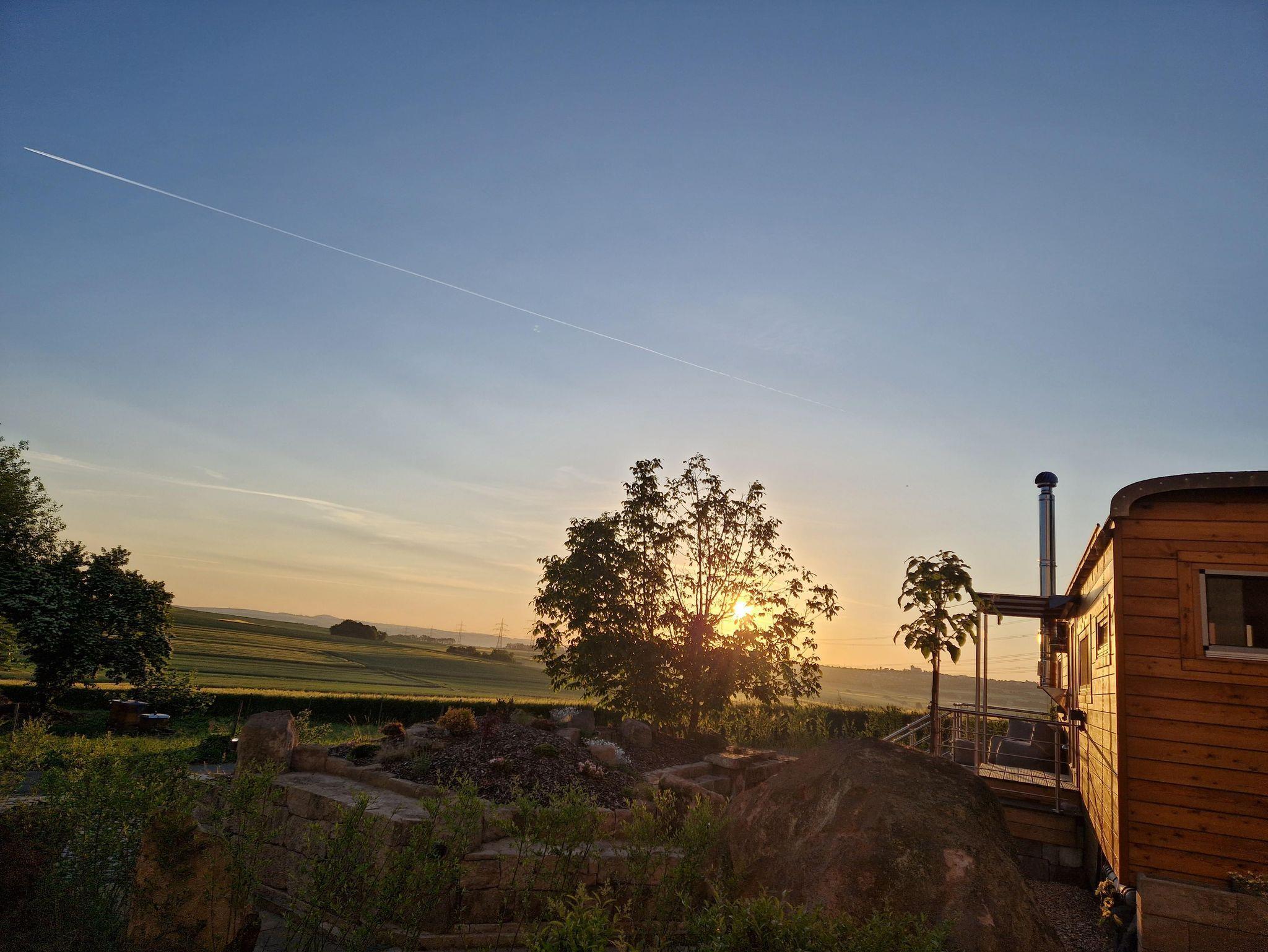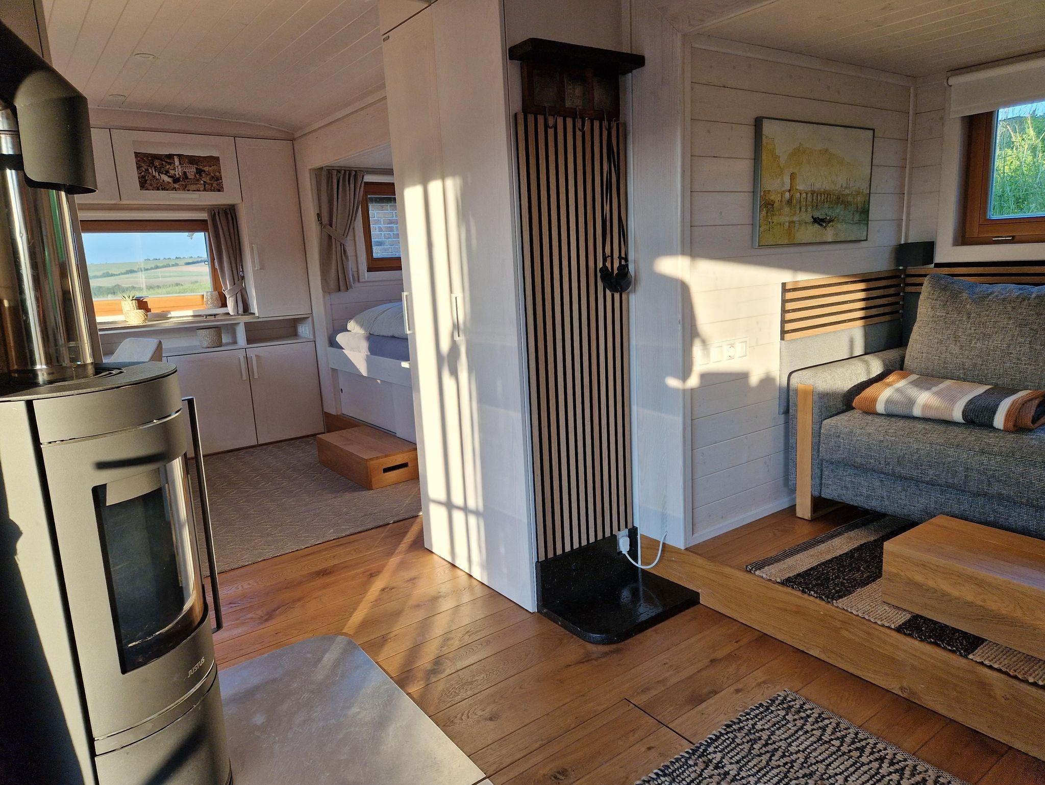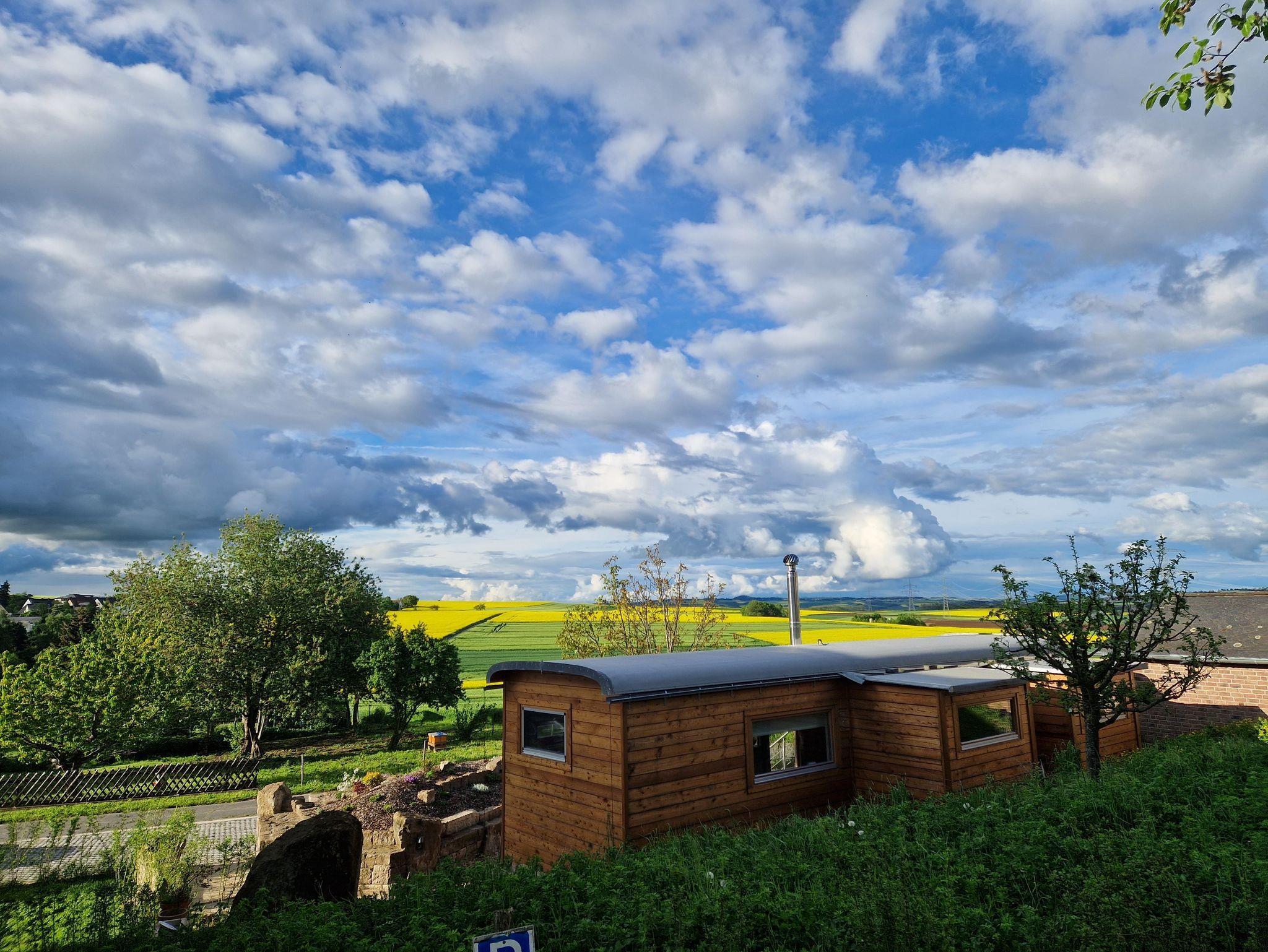 Übernachten im Tiny House Druidenstein In Ortsrandlage auf einer Anhöhe, mit Terrassenblick über die Felder des Maifelds liegt der Wohlfühlwagen. In der Mitte des Wanderweges zwischen der Burg Pyrmont und der weltberühmten Burg Eltz.