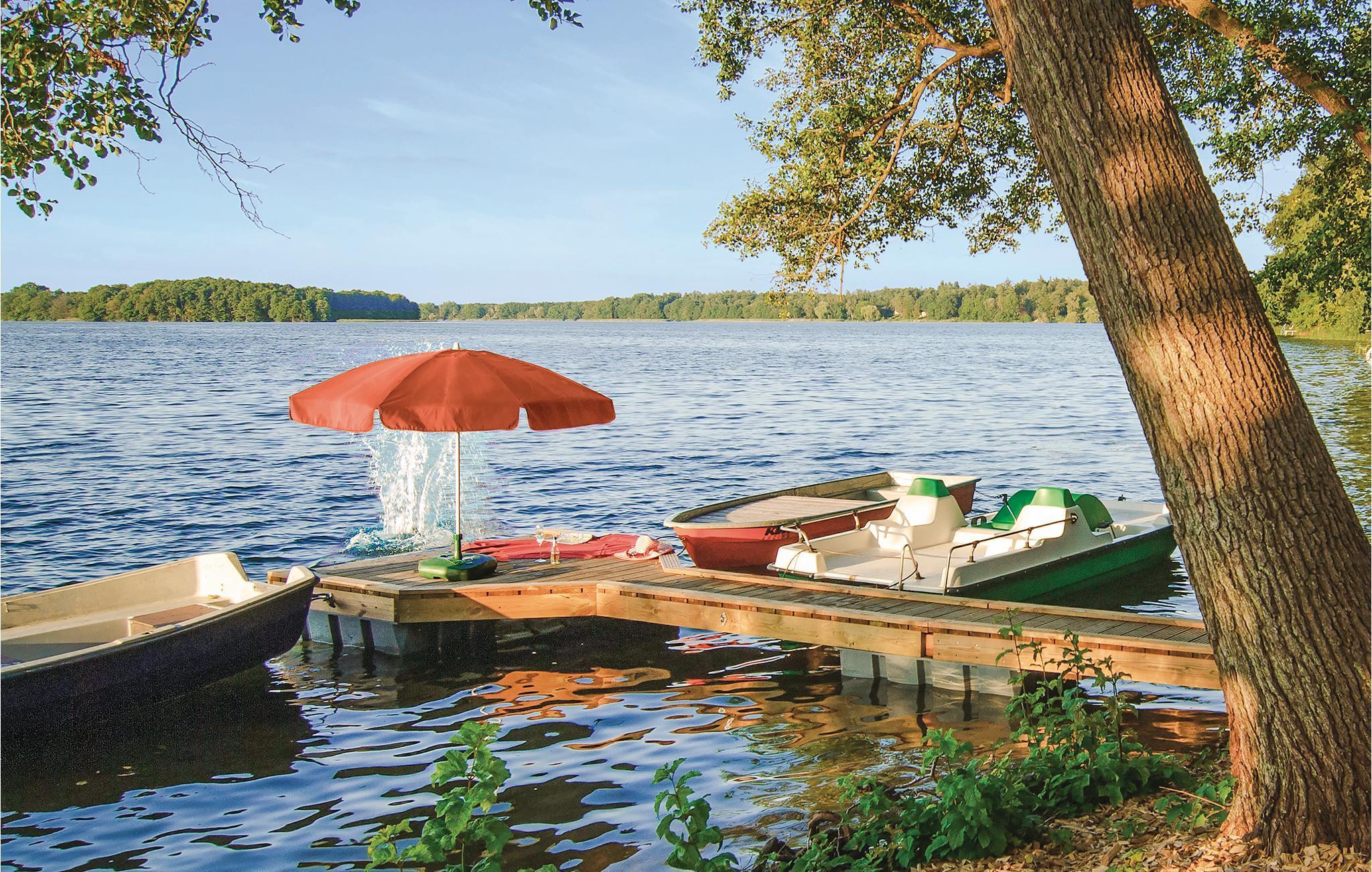 Der modern eingerichtete Wohnraum überzeugt mit offener Küche und breiter Glasfront. Von hier kommen Sie zur offenen Terrasse mit Rasenfläche. Im oberen Bereich des Hauses befinden sich die beiden Schlafräume. Eine dazugehörige Badestelle mit Steg liegt in Sichtweite des Pinnower Sees. Fahräder bekommen Sie gegen Gebühr an der Rezeption. Auch ein Ruderboot kann geliehen werden.