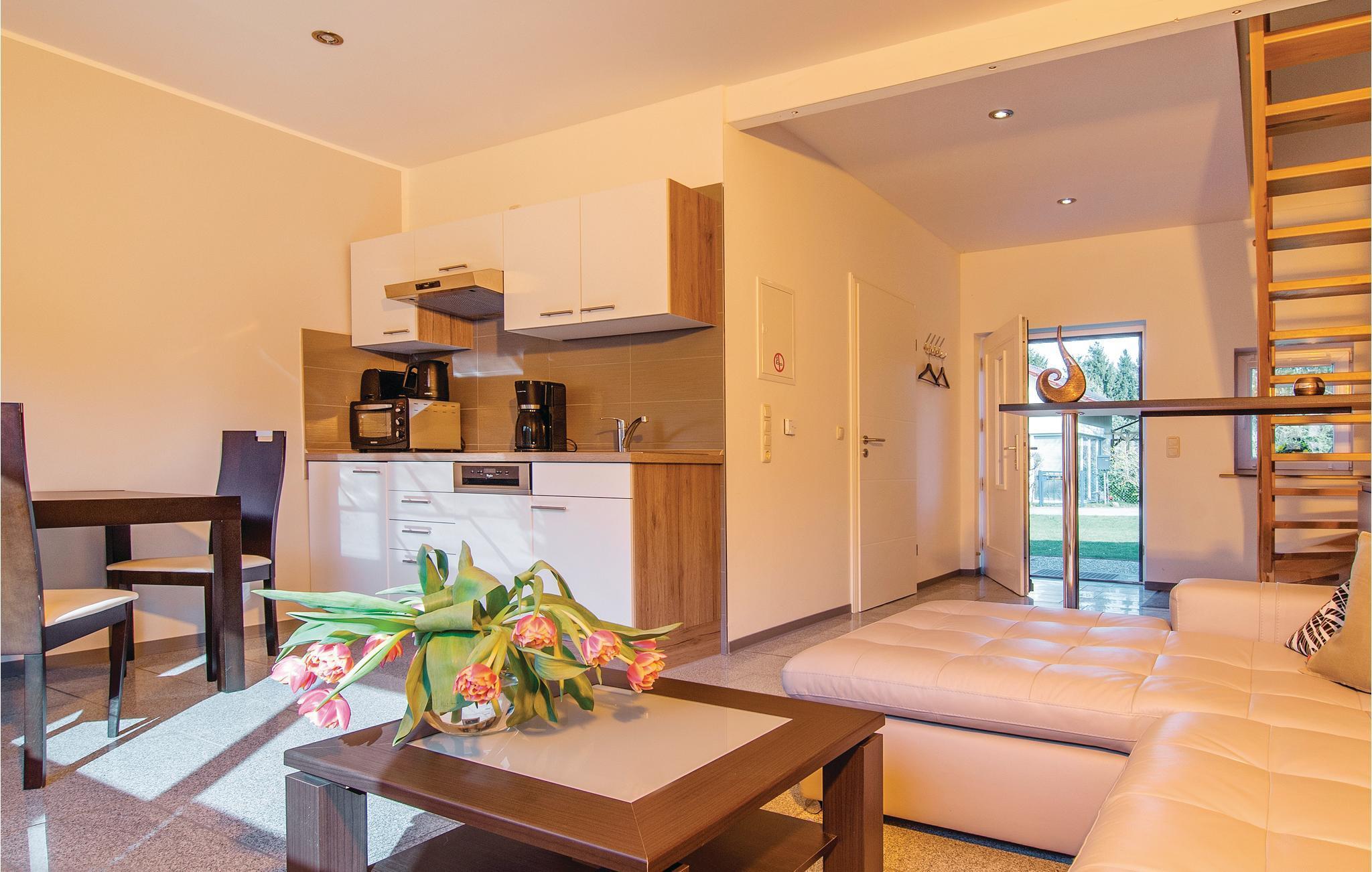 Der modern eingerichtete Wohnraum überzeugt mit offener Küche und breiter Glasfront. Von hier kommen Sie zur offenen Terrasse mit Rasenfläche. Im oberen Bereich des Hauses befinden sich die beiden Schlafräume. Eine dazugehörige Badestelle mit Steg liegt in Sichtweite des Pinnower Sees. Fahräder bekommen Sie gegen Gebühr an der Rezeption. Auch ein Ruderboot kann geliehen werden.