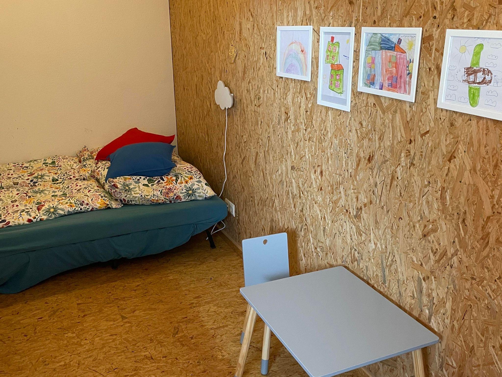 Im Nebenzimmer steht eine gemütliche Schlafcouch, in dem auch die Kinder ihre eigene Welt haben. Spiele und Bastelmaterial liegen bereit.