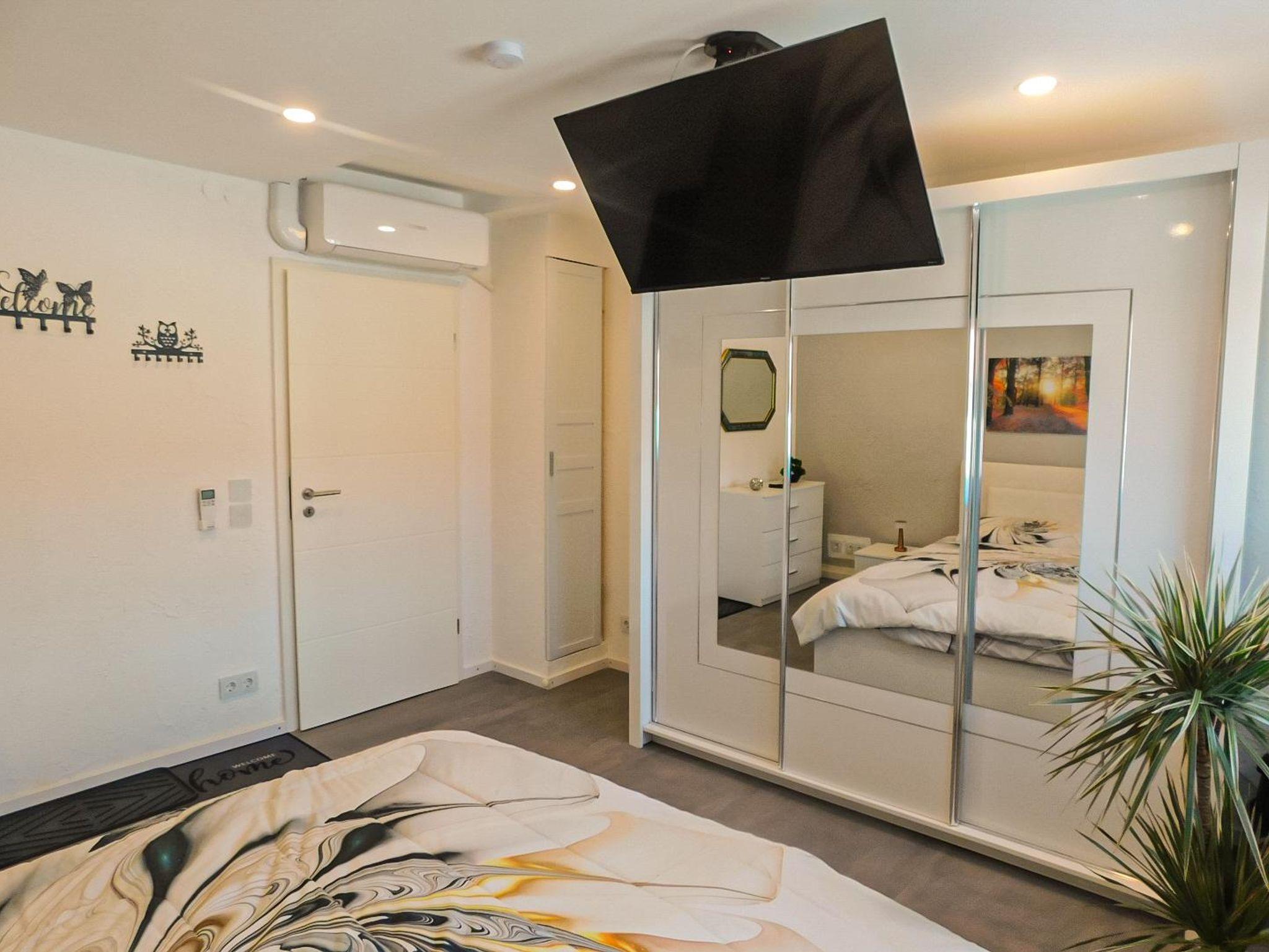 Im Schlafzimmer erwartet Euch ein großes, gemütliches Doppelbett, das erholsamen Schlaf garantiert. Ein besonderes Highlight ist der ausfahrbare Deckenfernseher, der für zusätzlichen Komfort sorgt. Auch das geräumige Wohnzimmer lädt mit einem bequemen Sofa und einer modernen TV-Wand zum Entspannen ein. Dank der Klimaanlage in allen Räumen könnt ihr auch an heißen Tagen stets eine angenehme Raumtemperatur genießen.