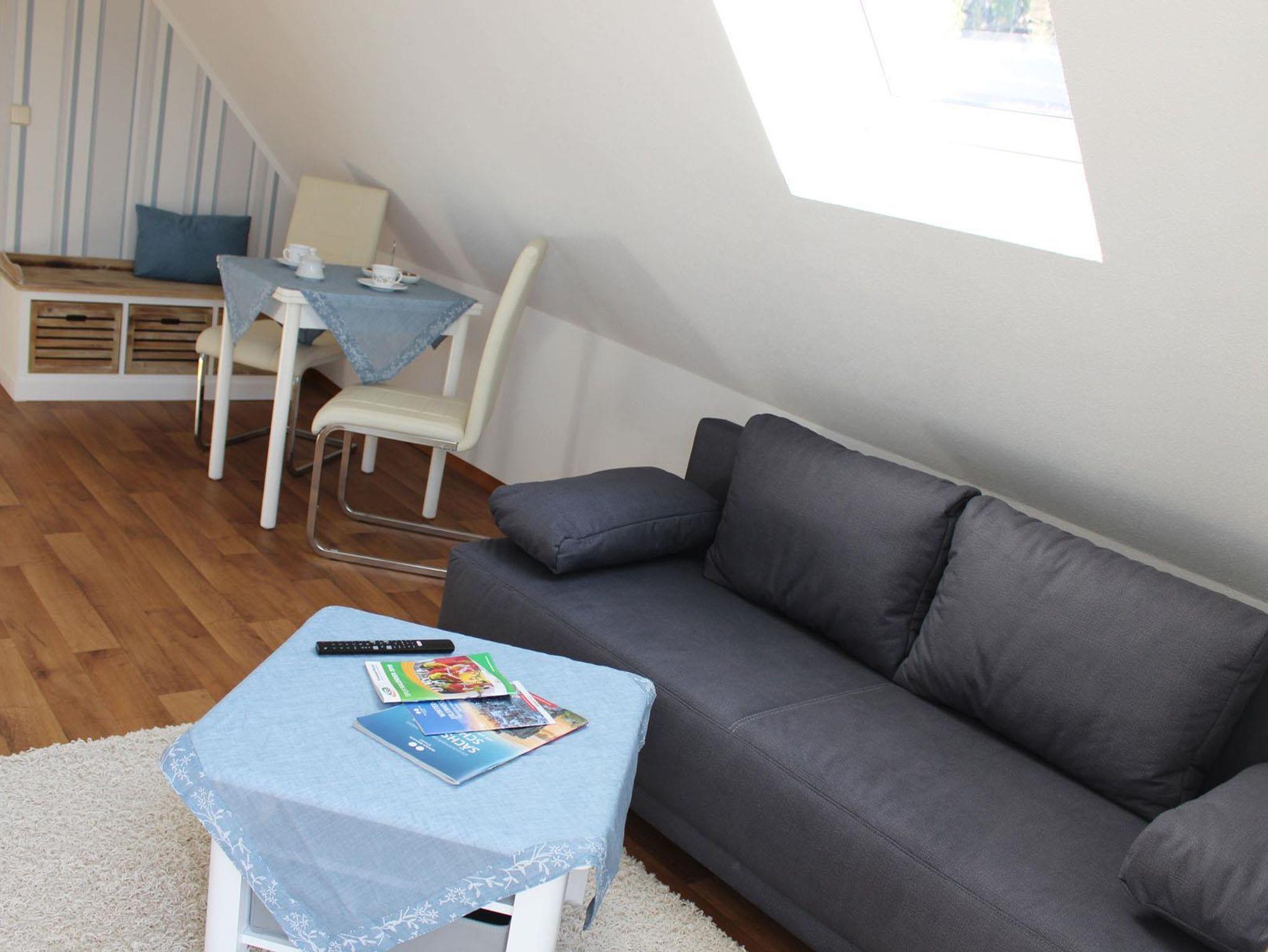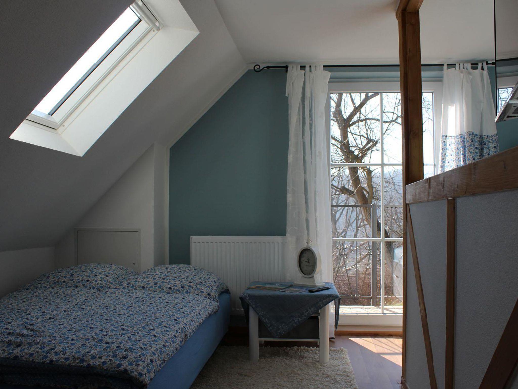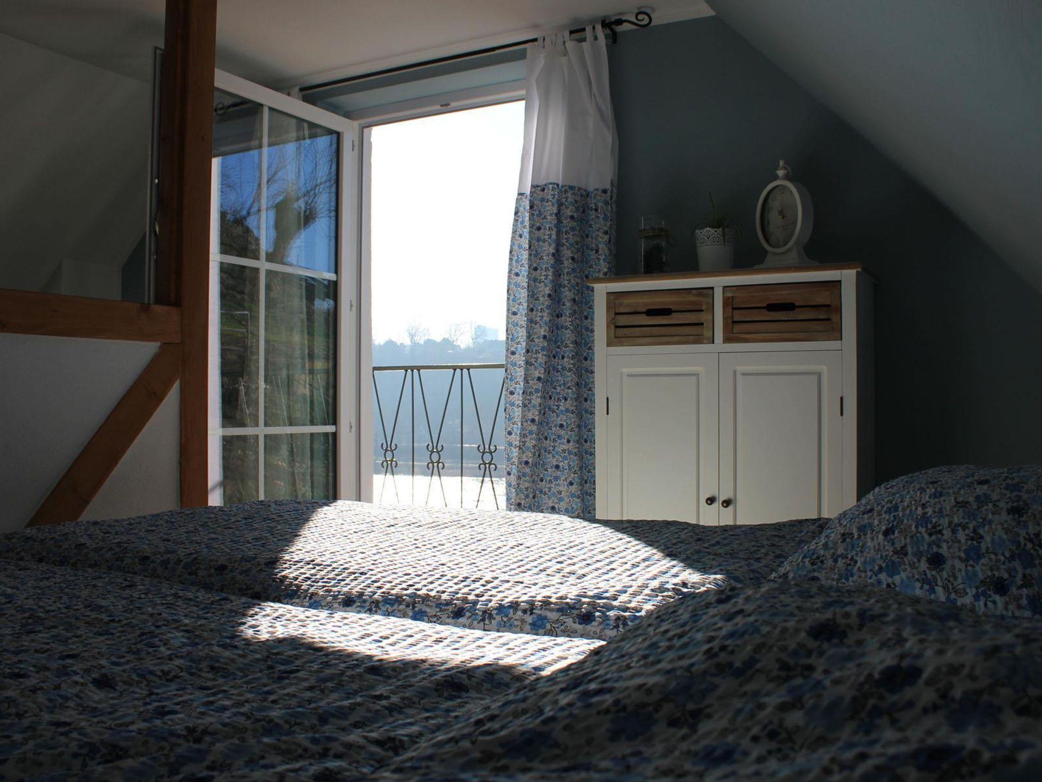 Als räumliche Trennung zum Ehebett wurde ein Raumteiler aus Holzbalken in Fachwerk-Optik errichtet. Das Highlight dieses lichtdurchflutenden Raumes bildet der Balkon, der einem einen traumhaften Blick auf die Elbe, in den Garten, auf den zum Grundstück gehörenden Hang sowie den malerisch gelegenen Gegenhang bietet. Der Balkon bietet seinen Gästen zu jeder Tageszeit Ruhe und Entspannung. Man wird nicht müde, das Treiben auf der Elbe und auf den angrenzenden Radwegen zu verfolgen. Selbst vom Doppelbett aus hat man einen unverbauten Blick auf die Elbe. Wer es liebt, kann schon vor dem Aufstehen vom Bett aus bei schönster Aussicht Urlaubsflair genießen.