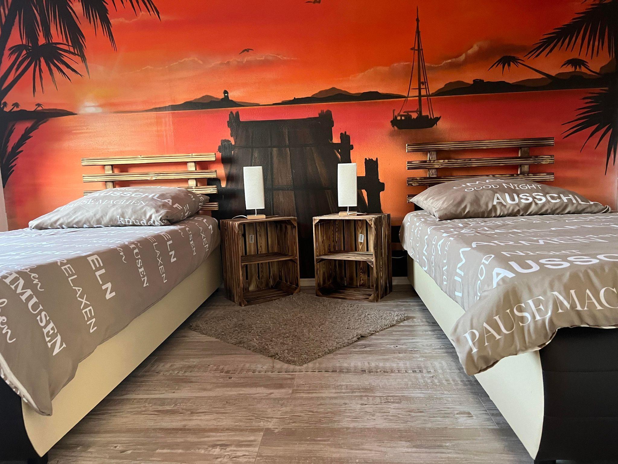 Wir haben für sie eine modern eingerichtete 80qm-Wohnung für bis zu 4 Gäste + 1 Kleinkind. Auf der gemütlichen überdachten Terrasse können Sie unter Palmen und Zitruspflanzen am kleinen Teich entspannen. Die gleich anschließende Küche mit Esstisch sowie Kochinsel ist ausgestattet mit Induktionsherd, Backofen, Geschirrspüler, Mikrowelle, Kühlschrank mit Gefrierfach, Kaffeevollautomat, Kaffeemaschine, Wasserkocher, Toaster und TV. Im Wohnzimmer wartet eine gemütliche Sitzecke, TV und eine Audioanlage auf Sie. Im Obergeschoss befinden sich 2 Schlafräume (1x Doppelbett sowie 1x 2 Einzelbetten) sowie ein modernes Bad mit Wanne und WC. Reisebett und Kinderstuhl sind vorhanden. Abstellmöglichkeiten für Fahrräder sind vorm Haus vorhanden, ebenso die Möglichkeit zum Laden von E-Bikes.