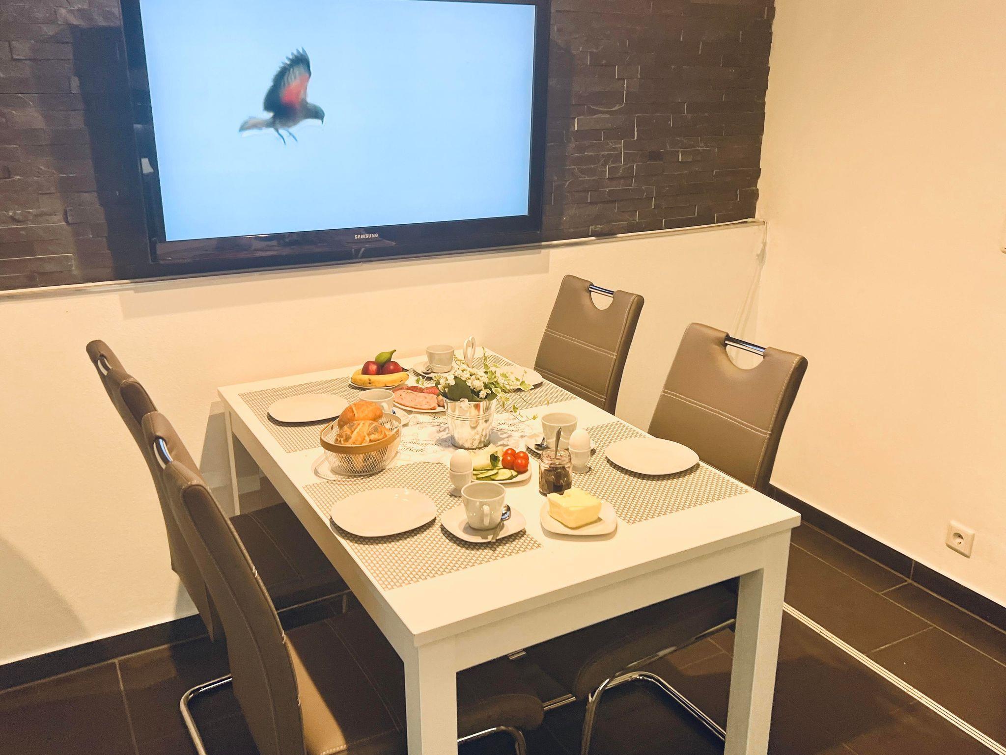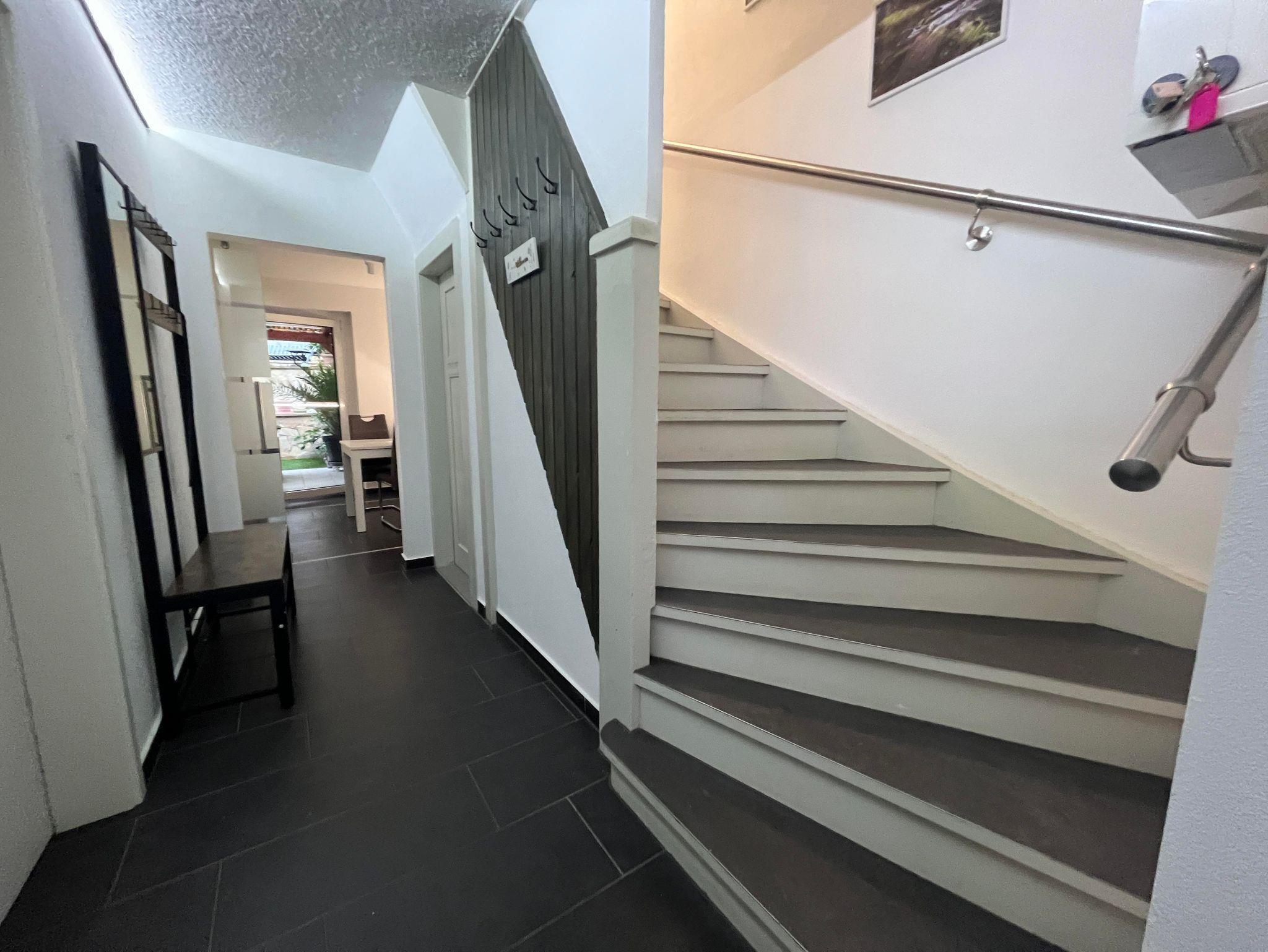 Mit viel Liebe haben wir im Juni 2024 ein ca. 80 m² große Ferienwohung im angrenzenden Reihenhaus für bis zu 4 Gäste + 1 Kleinkind modern eingerichtet. Im Erdgeschoss befindet sich die Wohnküche mir Kochinsel und Esstisch, ein Wohnzimmer sowie ein Gäste-WC. Im Obergeschoss sind zwei Schlafzimmer und das Bad mit Wanne (keine Dusche). Auf der gemütlichen überdachten Terrasse in Richtung Wald, können Sie bei schönem Wetter unter Palmen, duftenden Zitruspflanzen sowie Feigenbäumen entspannen.