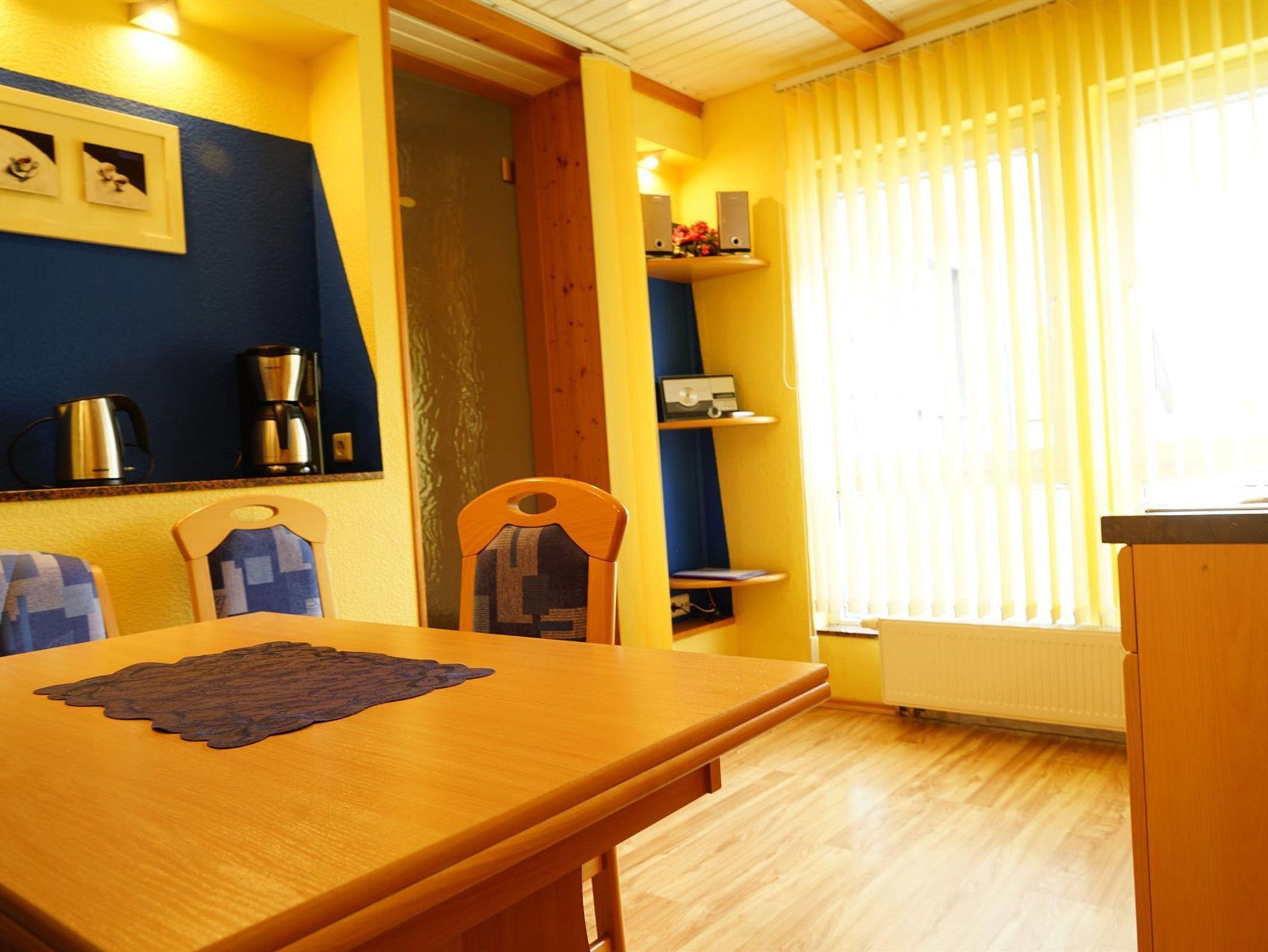 Zur kleinen Küche gehört ein Kühlschrank, Wasserkocher, Kaffeemaschine, Toaster, Cerankochfeld, sowie diverses Geschirr.