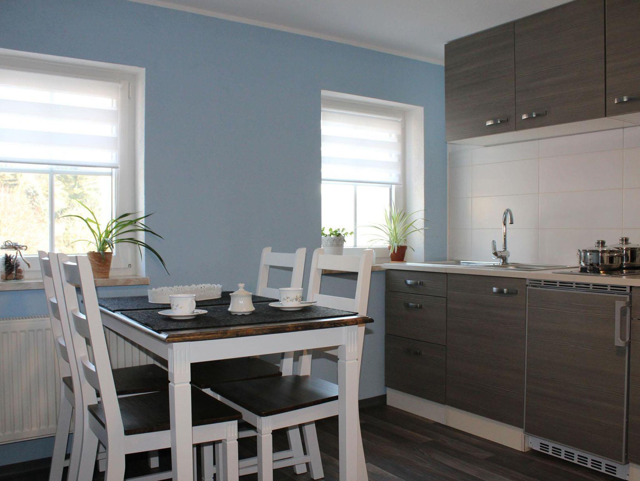 Die Ferienwohnung Kleine Stube verfügt über ein Doppelbett (180 cm breit) und einem Kinderbett (Kinder bis 2 Jahre) im separaten Schlafzimmer sowie einem (Schlaf-)Sofa (150 cm breit), das tagsüber als bequeme Sitzgelegenheit dient. Ein separates und geräumiges Bad mit Dusche/WC und Außenfenster ist von diesem Raum aus erreichbar. Sat-TV, Essbereich und Singleküche befinden sich im kombinierten Wohn- und Schlafraum. Das Quartier ist geeignet für 4 Erwachsene bzw. 2 Erwachsene/2 Kinder.