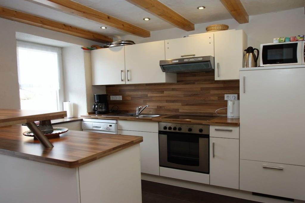 Mit viel Liebe haben wir das alte Bauernhaus aus dem 19. Jahrhundert hergerichtet. Das Ferienhaus ist zum Teil mit antiken Möbeln ausgestattet. Im Erdgeschoss, bestehend aus dem alten Wohnhaus und dem früheren Kuhstall, befinden sich ein 42m² großer Wohnraum mit Küche, Esstisch und Couchecke. Außerdem eine Garderobe, ein Bad mit Dusche und WC, ein Abstellraum und eine Waschküche mit Waschmaschine und Trockner. Im Obergeschoss sind 3 Schlafzimmer mit Doppelbetten und ein Bad mit Badewanne, Dusche, WC und 2 Waschbecken. Auf dem 'Getreidespeicher' ist ein Schlafraum mit 4 Einzelbetten, die nach belieben verschoben werden können und ein Bad mit Dusche und WC. So können bis zu 10 Personen in dem Haus wohnen und sich wohlfühlen.